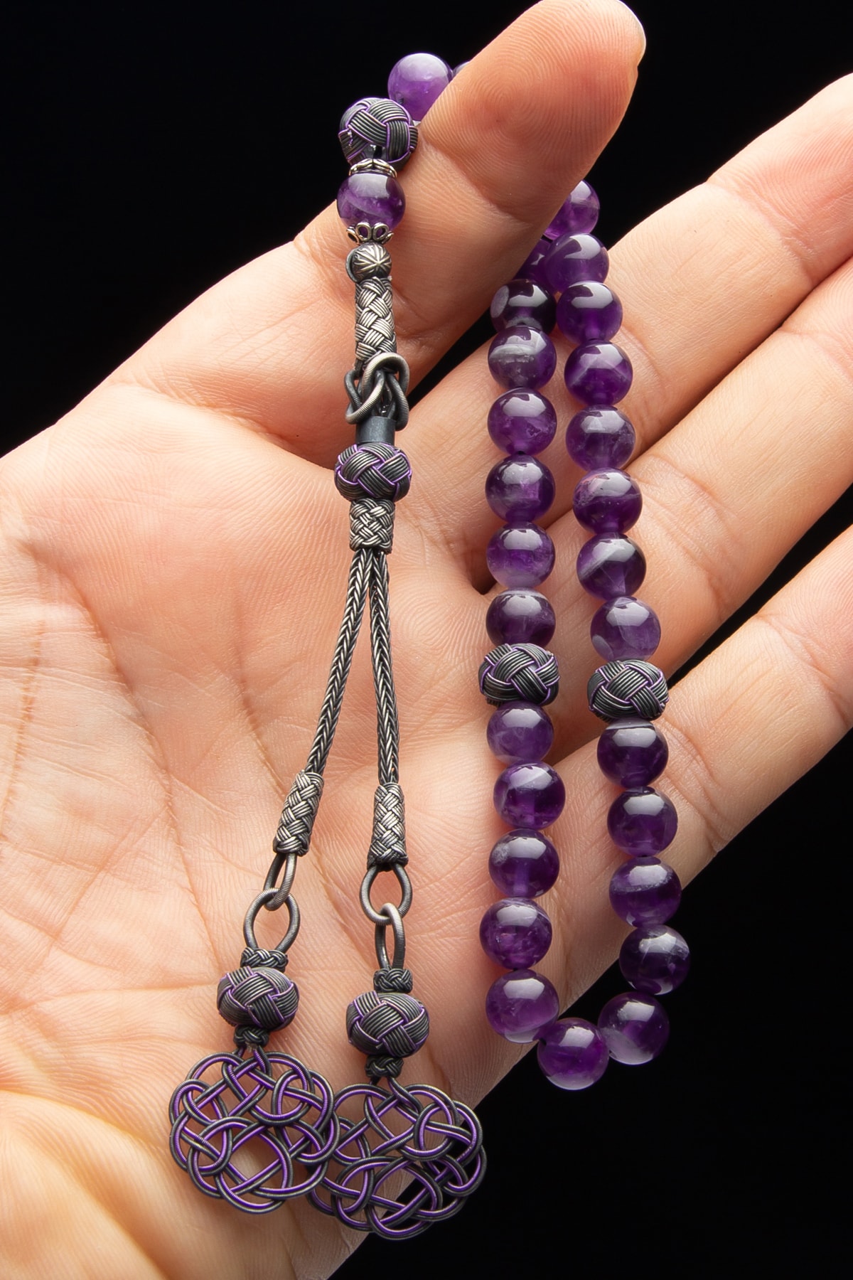 1000 ayar gümüş kazaz püskül detaylarıyla süslenmiş, şıklığı ve zarafeti bir arada sunan doğal taş tesbih; Ametist doğaltaşın eşsiz güzelliğiyle, her kullanımda ruhani bir deneyim yaşatır; 8mm boyutundaki taşlar, hem göze hitap eden bir estetik sunar hem de rahat bir kullanım sağlar; Doğal taş materyali sayesinde her tesbihin benzersiz ve otantik bir görünüm kazanmasını sağlar;