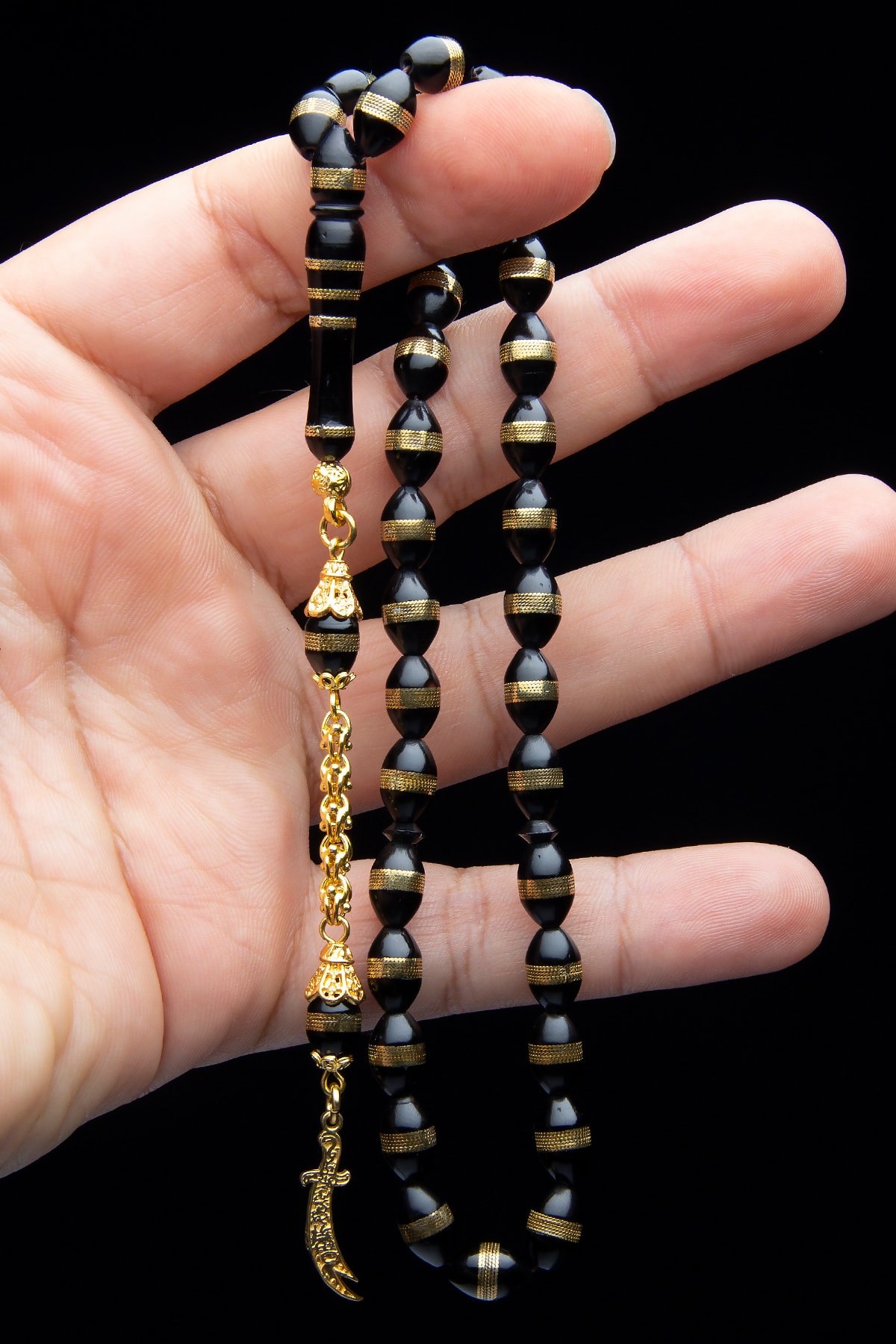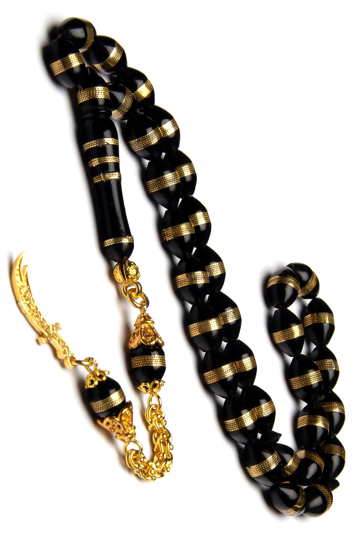 24k Altın Kaplama 925 Ayar Gümüş Püsküllü Zülfikar Kılıcı 7x11mm Sarmal Kuka Tesbih