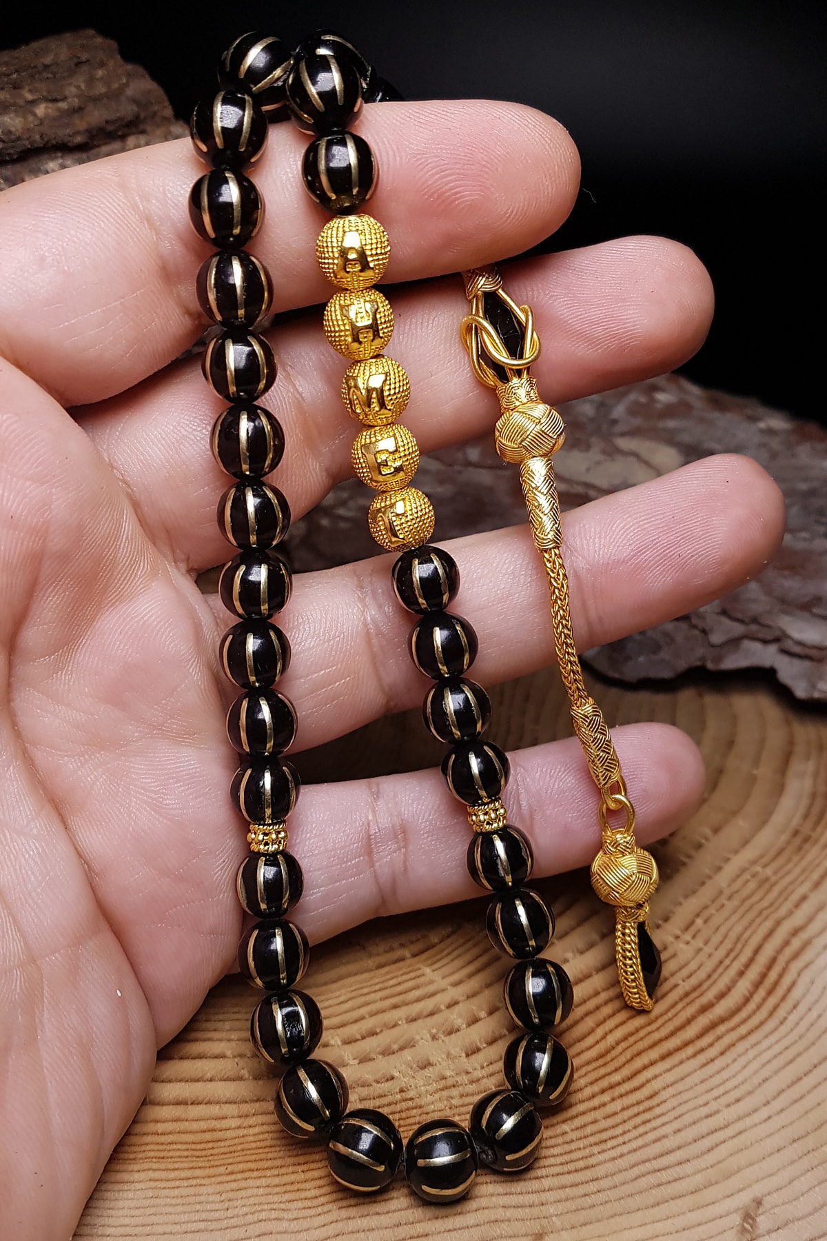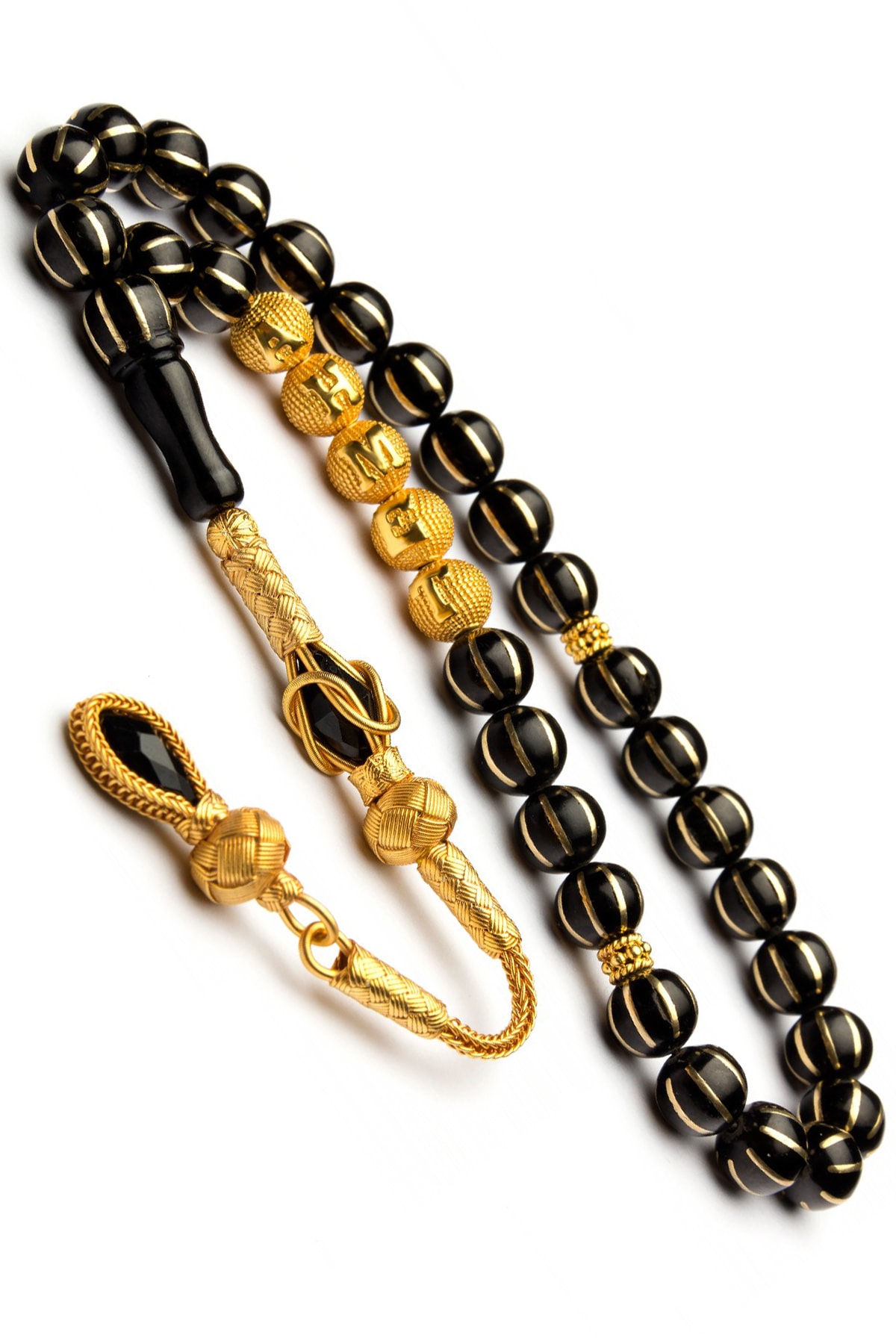24k Altın Kaplama Gümüş Kazaz Püsküllü Gümüş Harfli Karpuz Kesim Oltu Tesbih