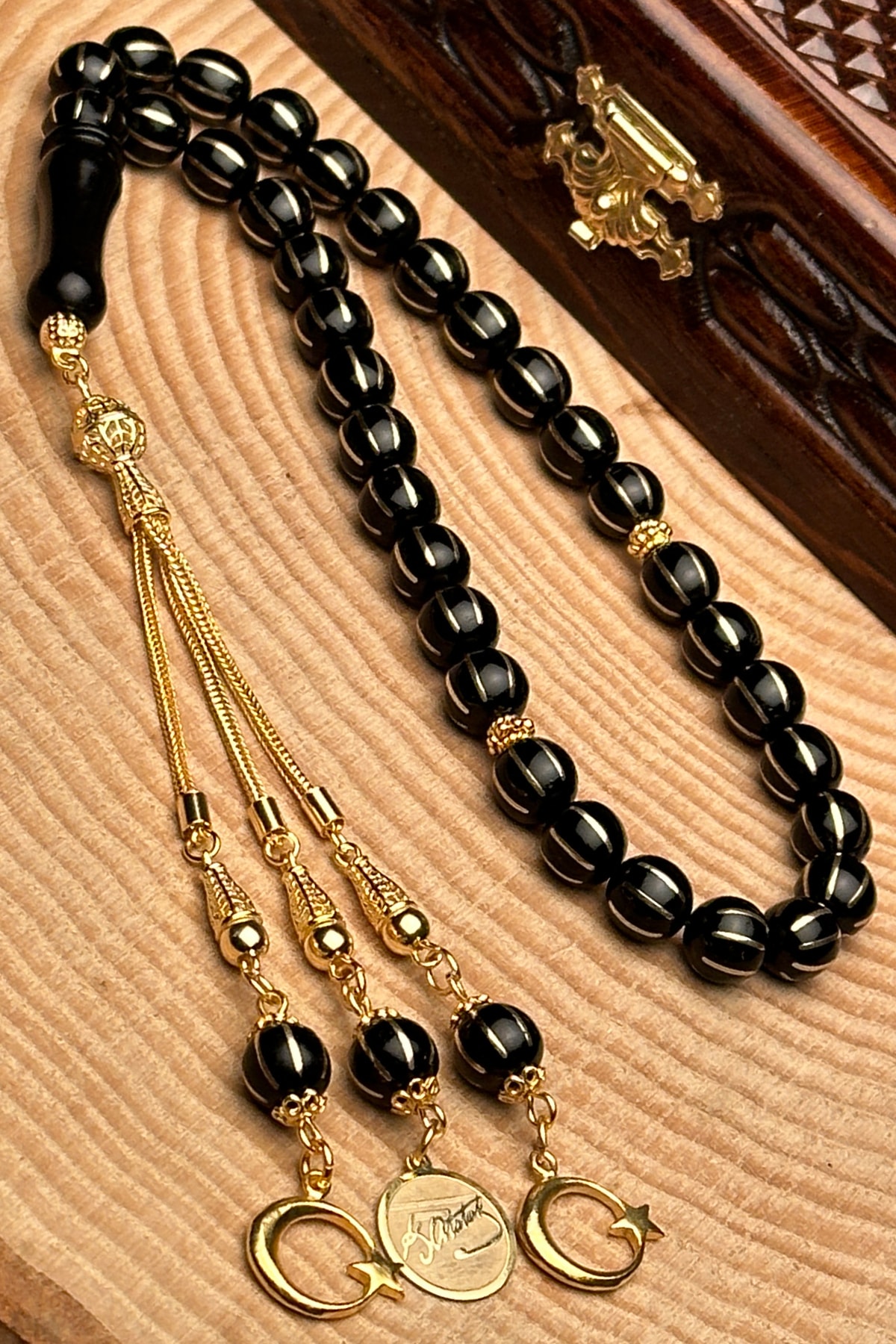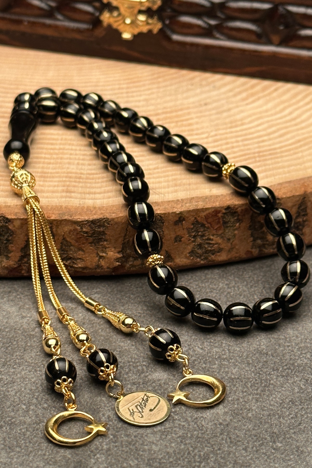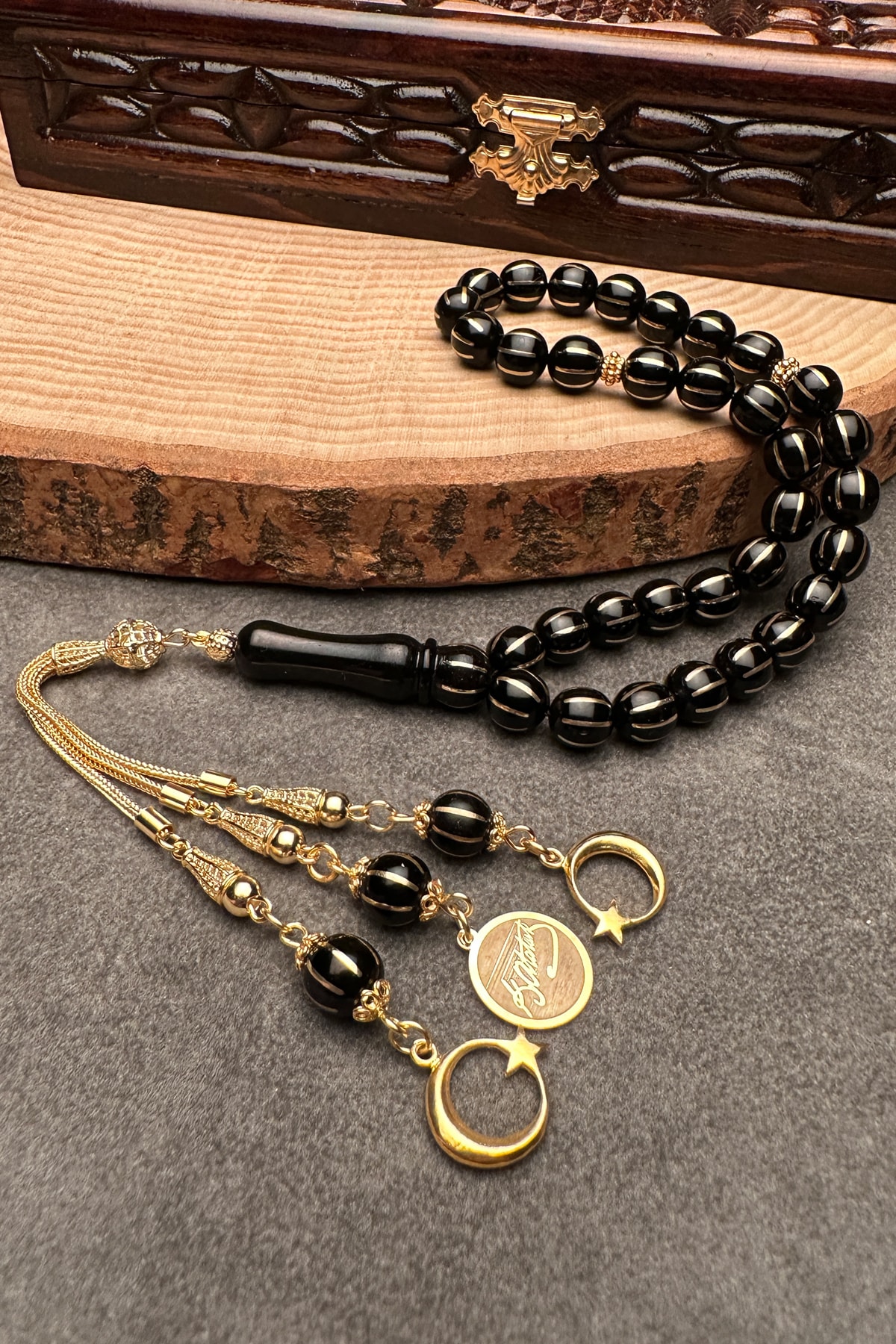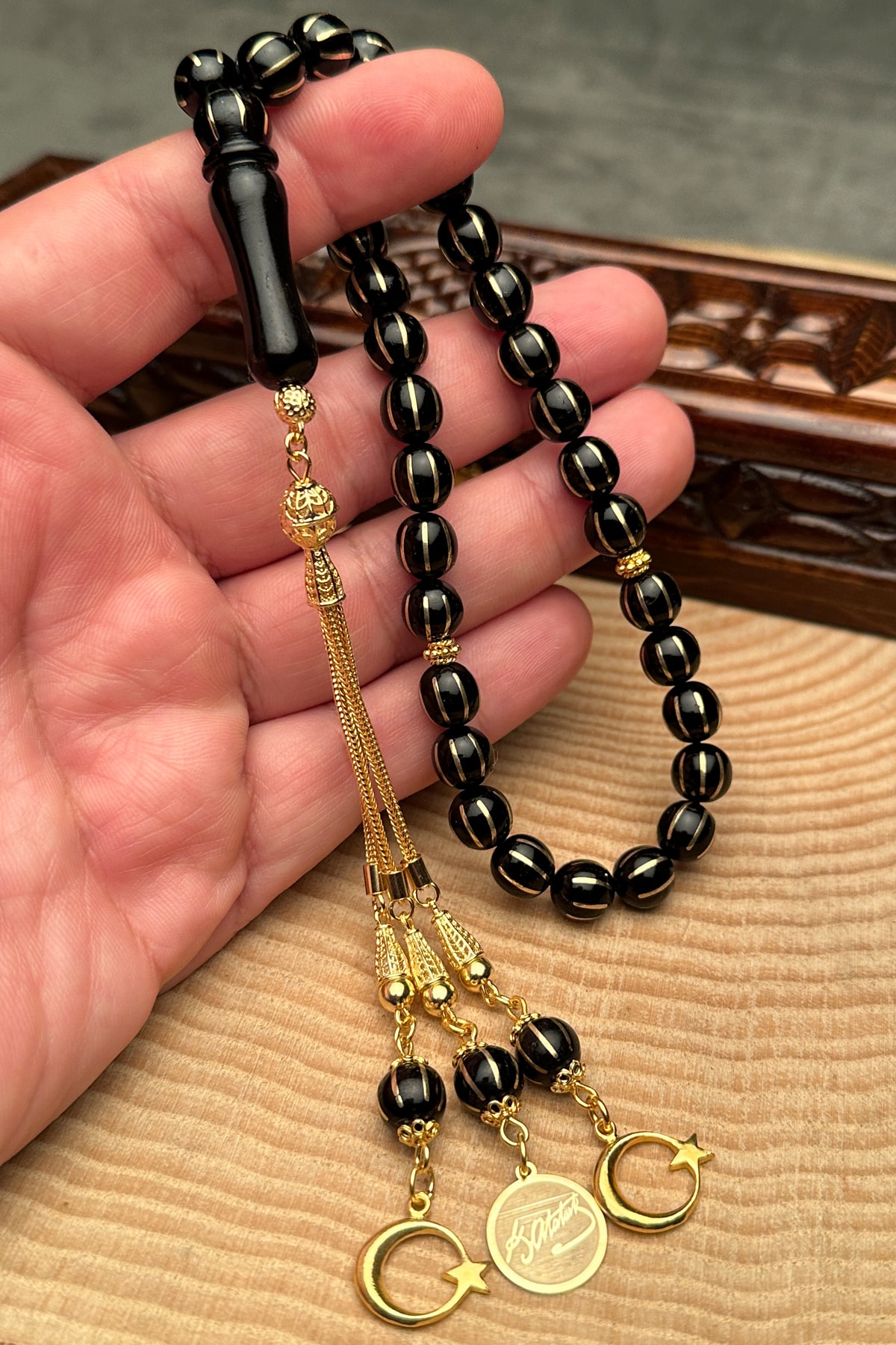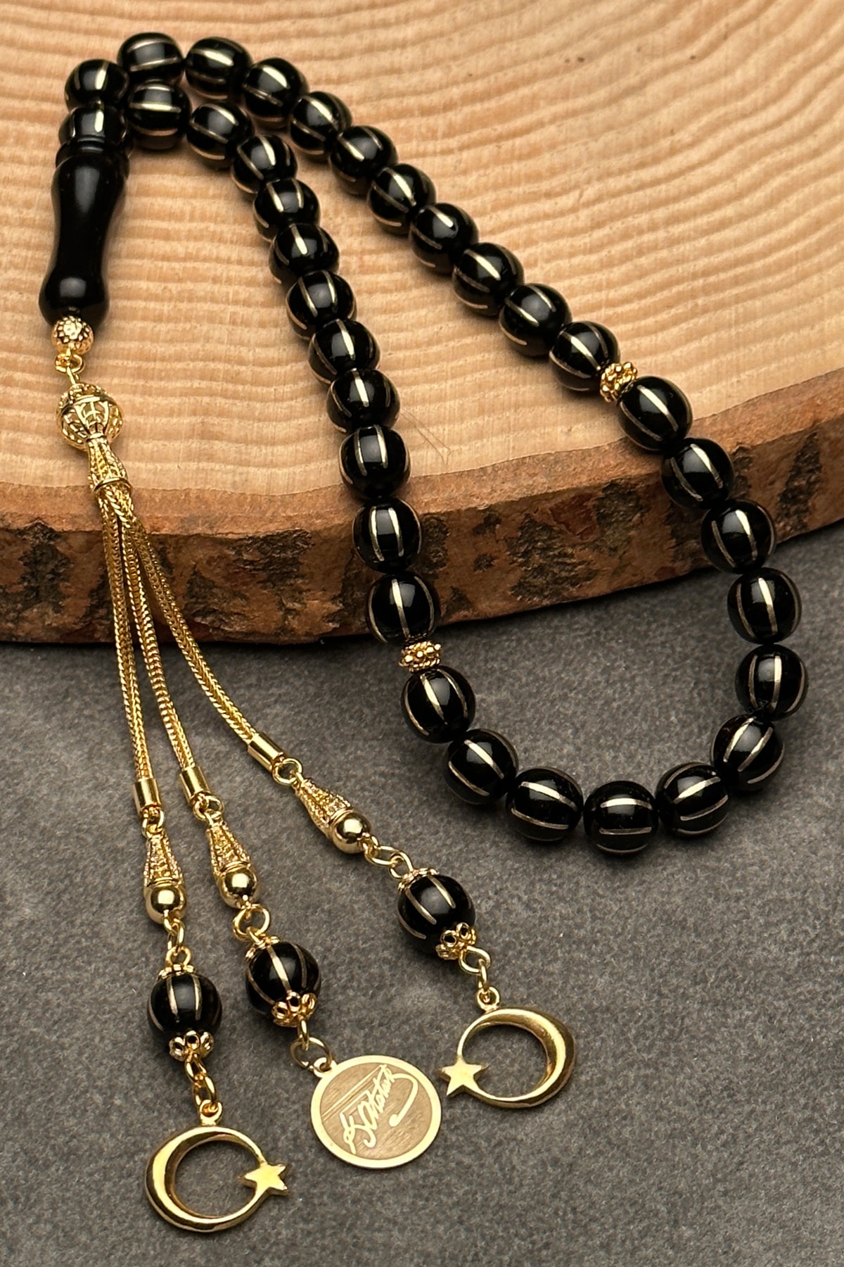 Oltu taşı, doğal güzelliği ve benzersiz desenleriyle dikkat çeken bir taş türüdür; Tesbihin her bir taşı, el işçiliğiyle işlenmiş ve özenle seçilmiştir; 24 ayar altın kaplama, tesbihin hem şık görünümünü hem de dayanıklılığını artırır; Altın kaplama, uzun süreli kullanım için idealdir ve parlaklığını korur; Karpuz kesim tasarımı, klasik ve zarif bir görünüm sunar; Bu kesim, ışığı mükemmel bir şekilde yansıtarak göz alıcı bir parlaklık sağlar; Tesbihin her bir taşı, özenle seçilmiş ve işlenmiş olup, her bir püskülün üzerinde detaylı işçilik sergilenir; Bu, her bir parçanın benzersiz ve özgün olmasını sağlar;