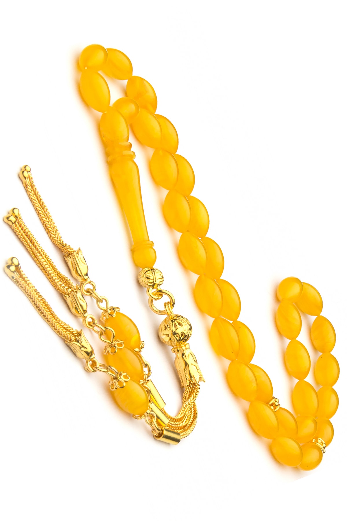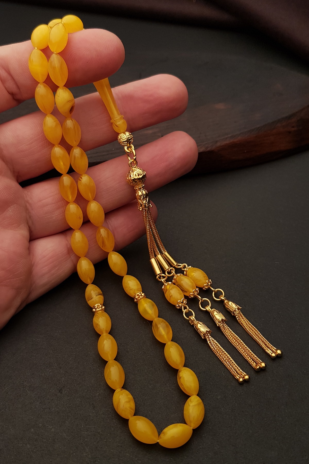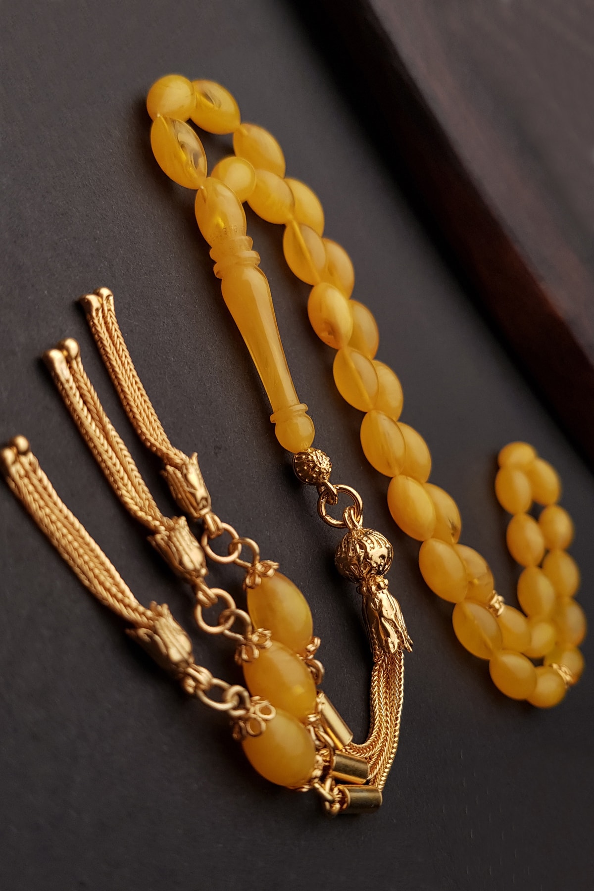 24k Altın Kaplama Gümüş Püsküllü Sarı Hareli Sıkma Kehribar Tesbih