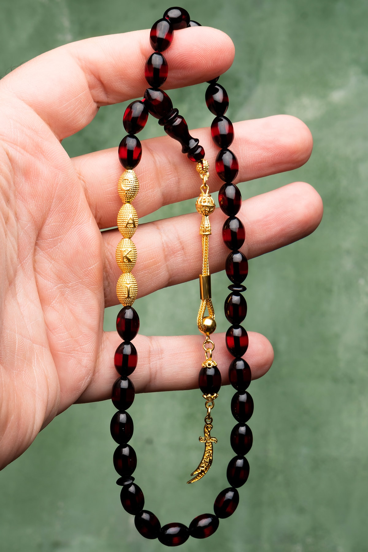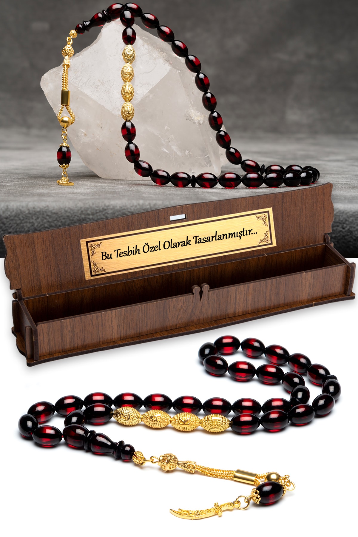 Kehribar taşı, doğal güzelliği ve benzersiz dokusuyla dikkat çeken bir materyaldir; Bu tesbih, kehribarın sıcak ve doğal tonlarını taşıyan tasarımıyla öne çıkar; Altın kaplama detayları, tesbihin şıklığını artırarak hem göz alıcı bir görünüm sunar hem de uzun süreli kullanım için dayanıklılık sağlar; İsimli tesbih, sevdiklerinize özel bir hediye olarak düşünceli bir dokunuş sunar; Kişiselleştirilmiş tasarım, her kullanımda özel anıları hatırlatır; Gümüş püskül detayları, klasik ve zarif bir görünüm kazandırarak bu tesbihin estetik değerini arttırır;