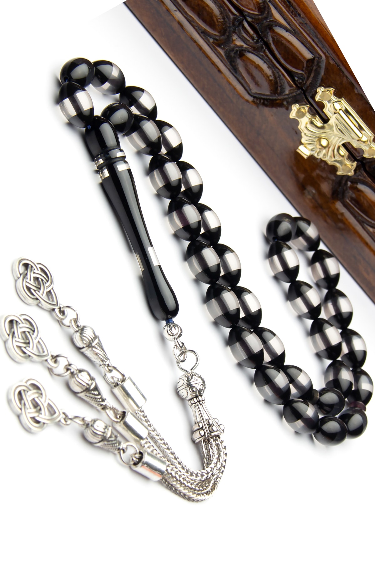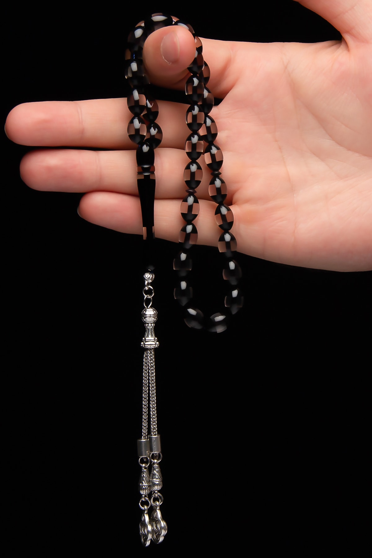 Alpaka Püsküllü Arpa Kesim Siyah Beyaz Sürmeli Toz Kehribar Tesbih