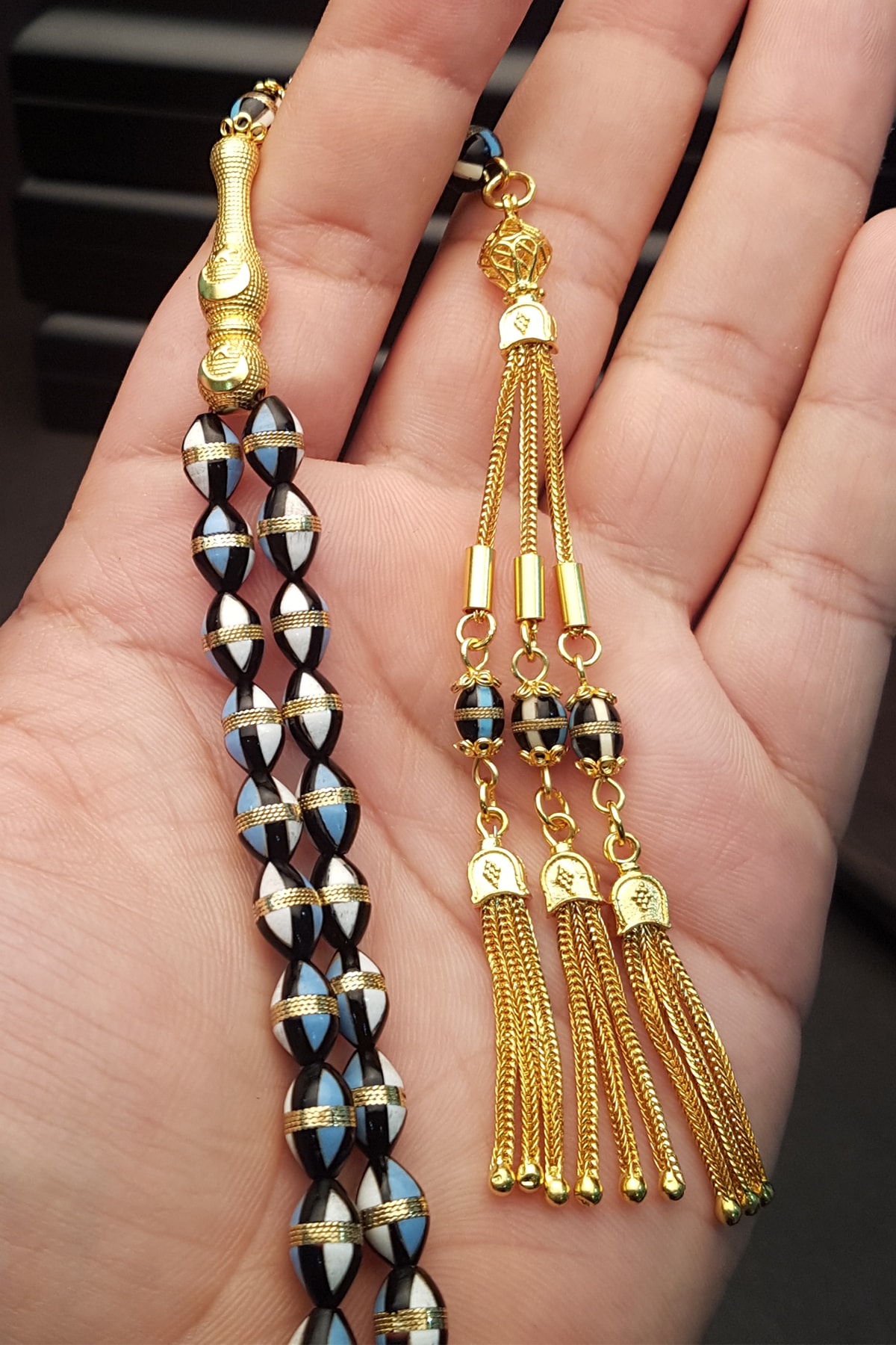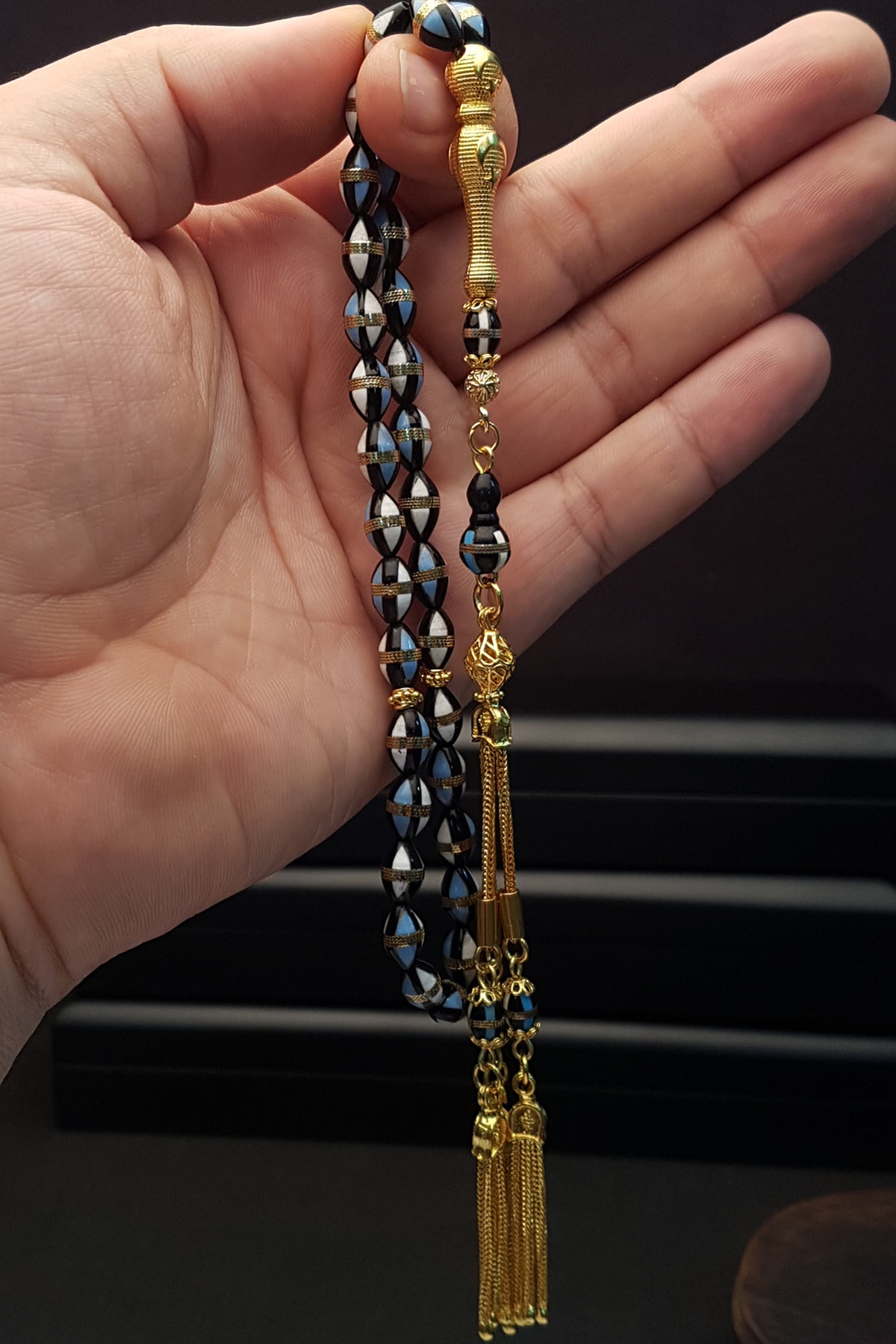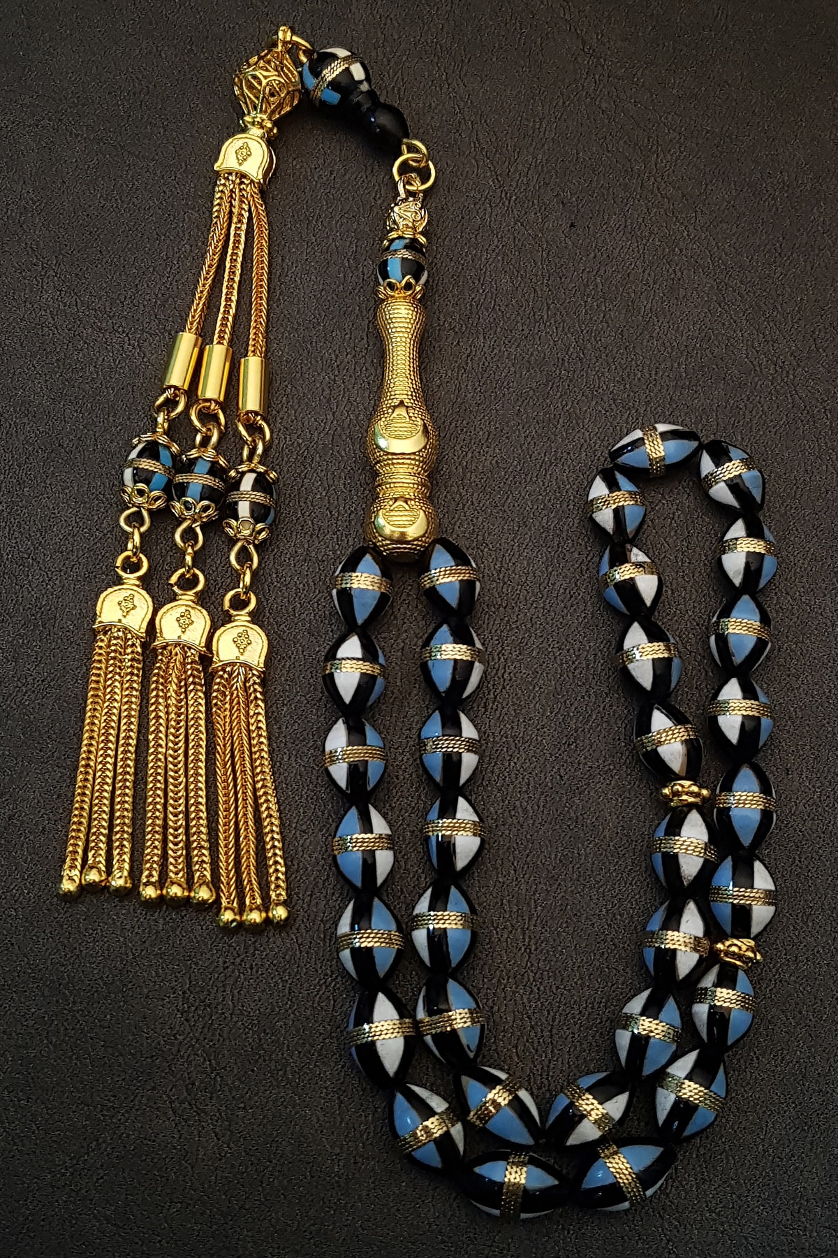 Mavi mine işlemeli pirinç sarmal kuka tesbihimizin bütün metal aksamı 925 ayar gümüş malzemedir. ; 18 ayar altın kaplama yapılmıştır. ; Koleksiyonluk özel günlerde tercih edilen bu şık modelimizi sizlerin beğenisine sunuyoruz.;