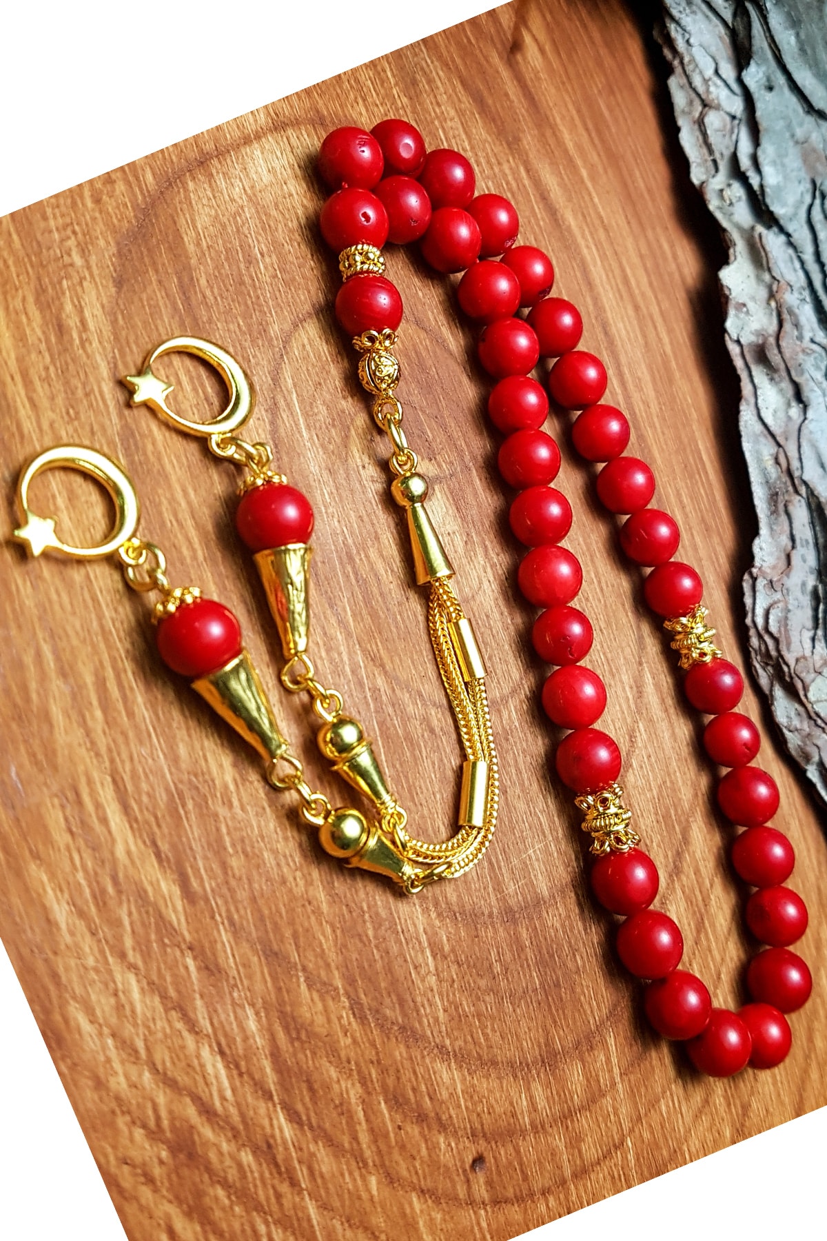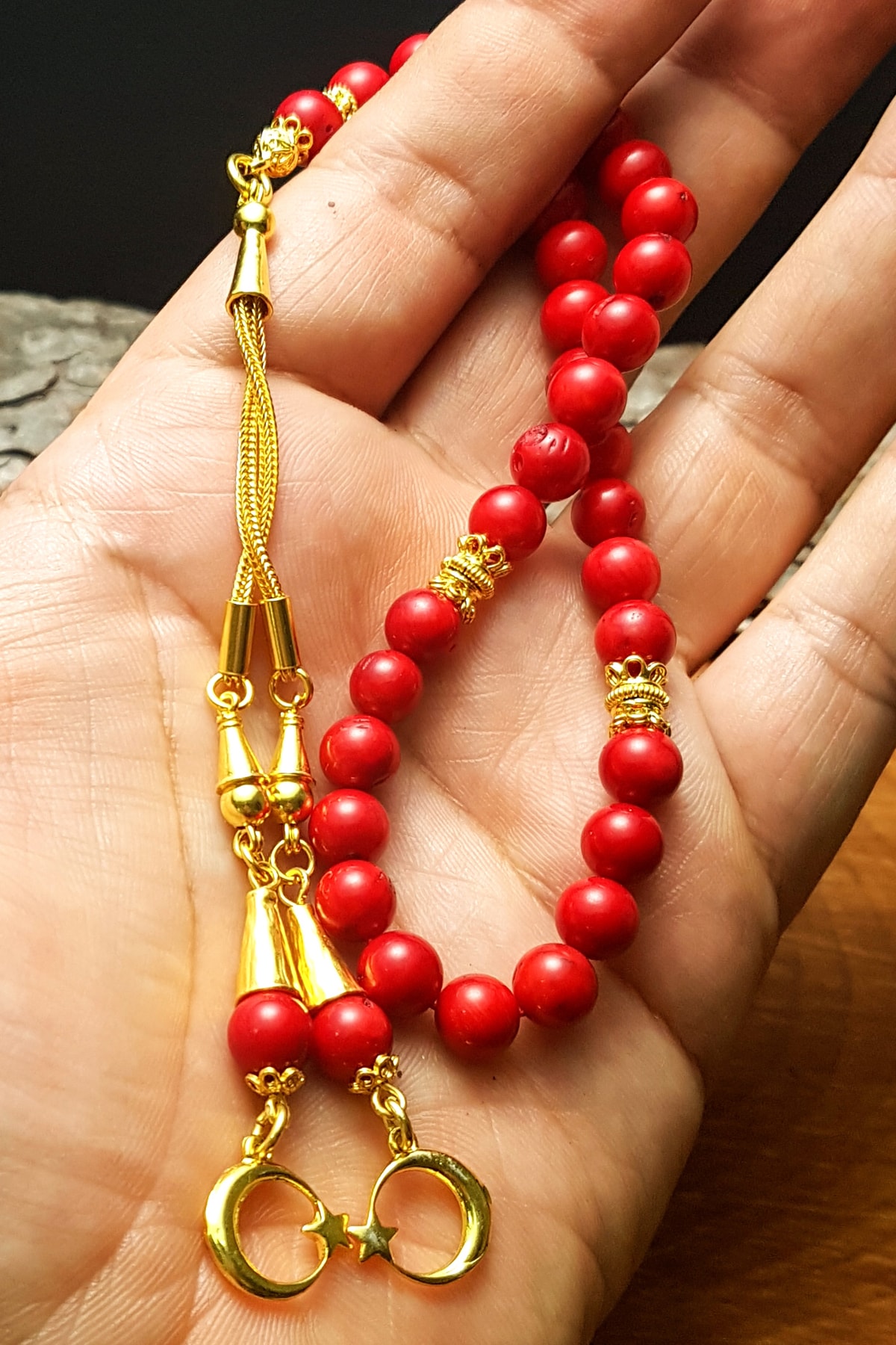 Altın Kaplama 925 Ayar Gümüş Aksesuarlı Ayyıldız Model 8mm Kırmızı Mercan Doğaltaş Tesbih