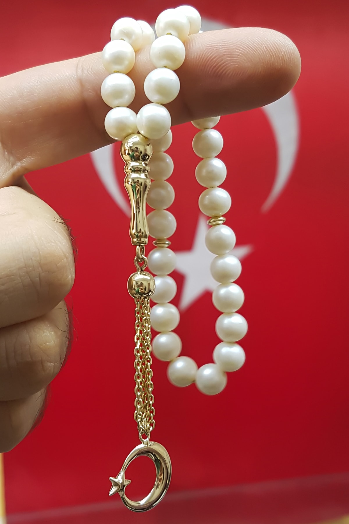 Altın Kaplama Gümüş Aksesuarlı Ayyıldızlı Doğal Inci Tesbih