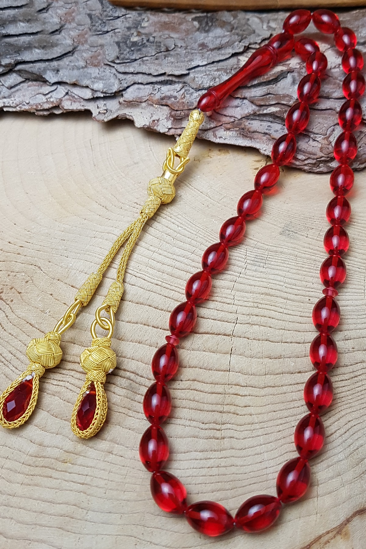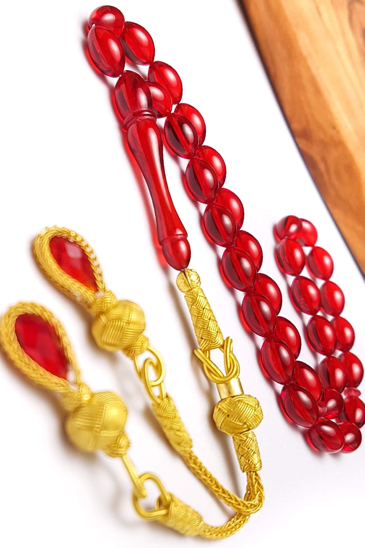 Altın Kaplama Gümüş Kazaz Püsküllü 7x11mm Kırmızı Ateş Kehribar Tesbih