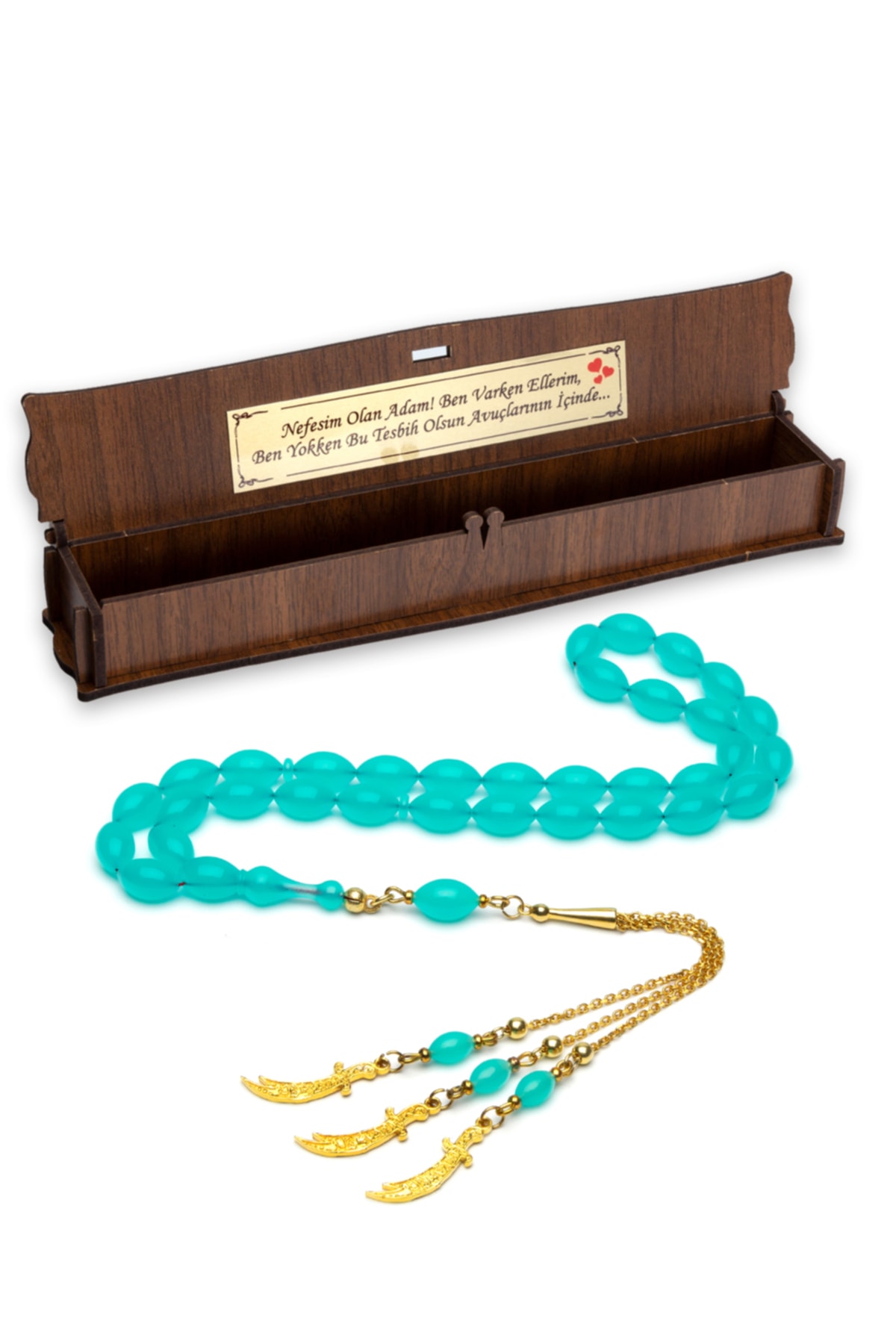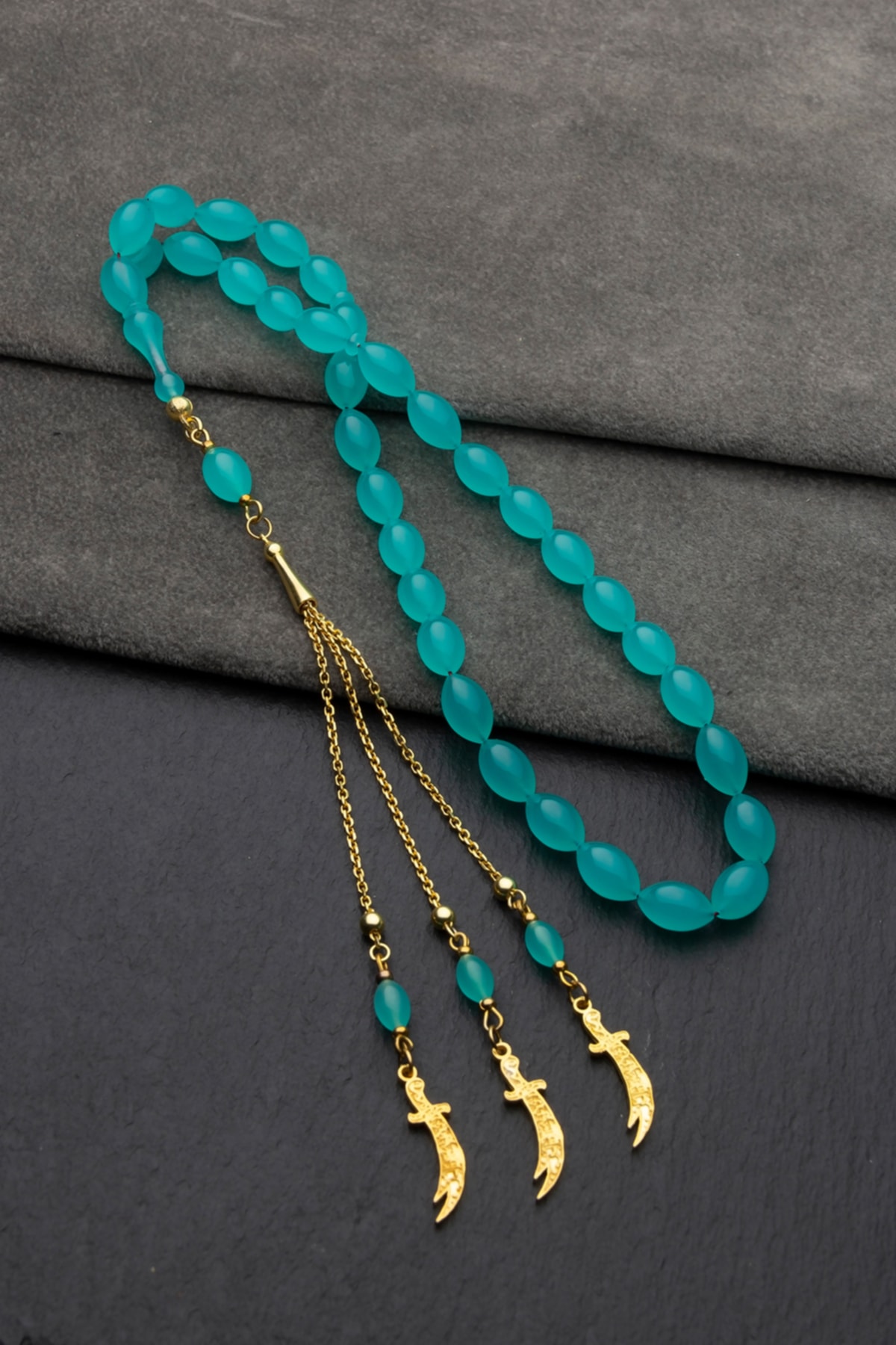 – Altın kaplama detaylarıyla zenginleştirilmiş, şık ve göz alıcı bir tasarıma sahip; – Kehribar taş kullanımı, hem estetik hem de dayanıklılık açısından üstün bir kalite sunar; – Püskül detayları ile zenginleştirilmiş, zarif ve modern bir görünüm kazandırır; – Zülfikar kılıcı figürü, geleneksel ve kültürel motifleri modern tasarım anlayışıyla buluşturur;