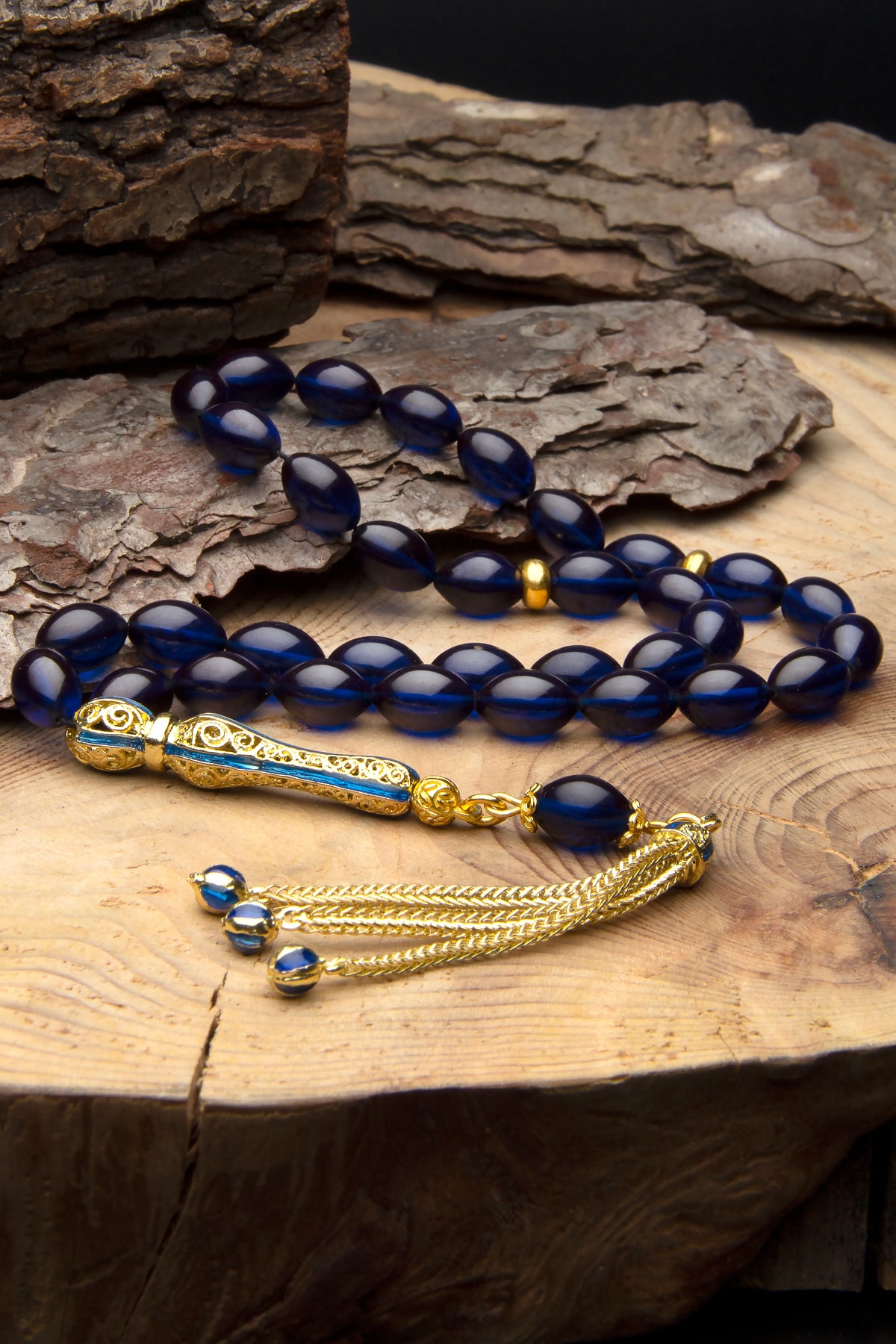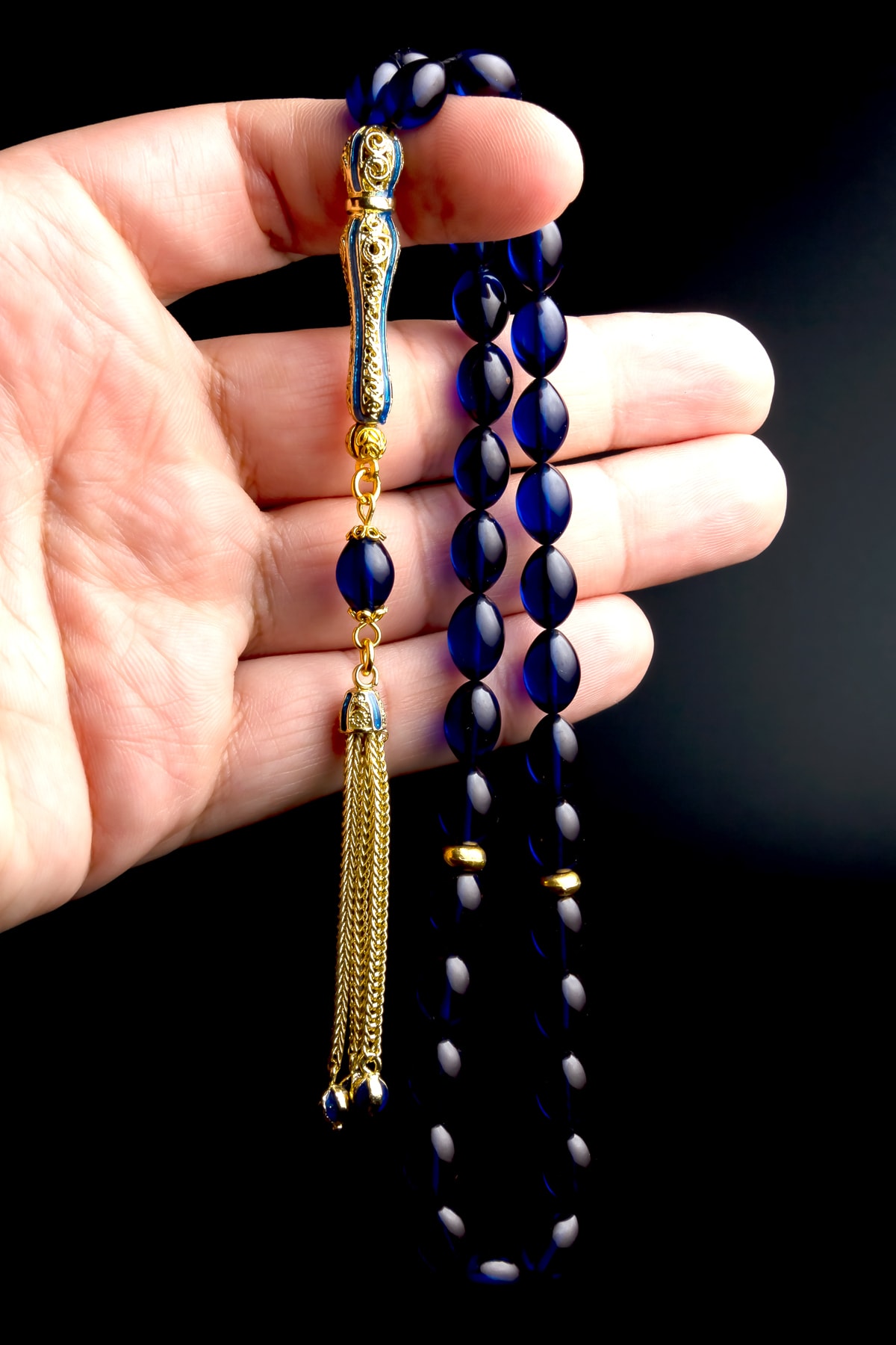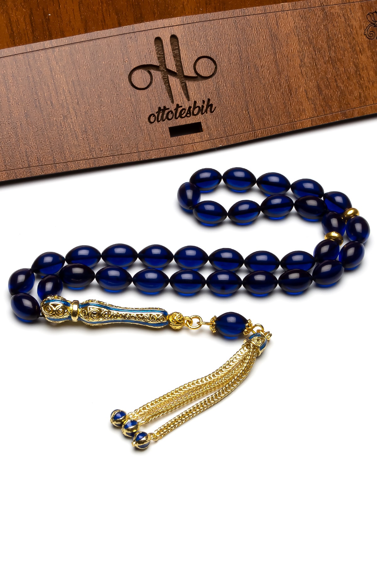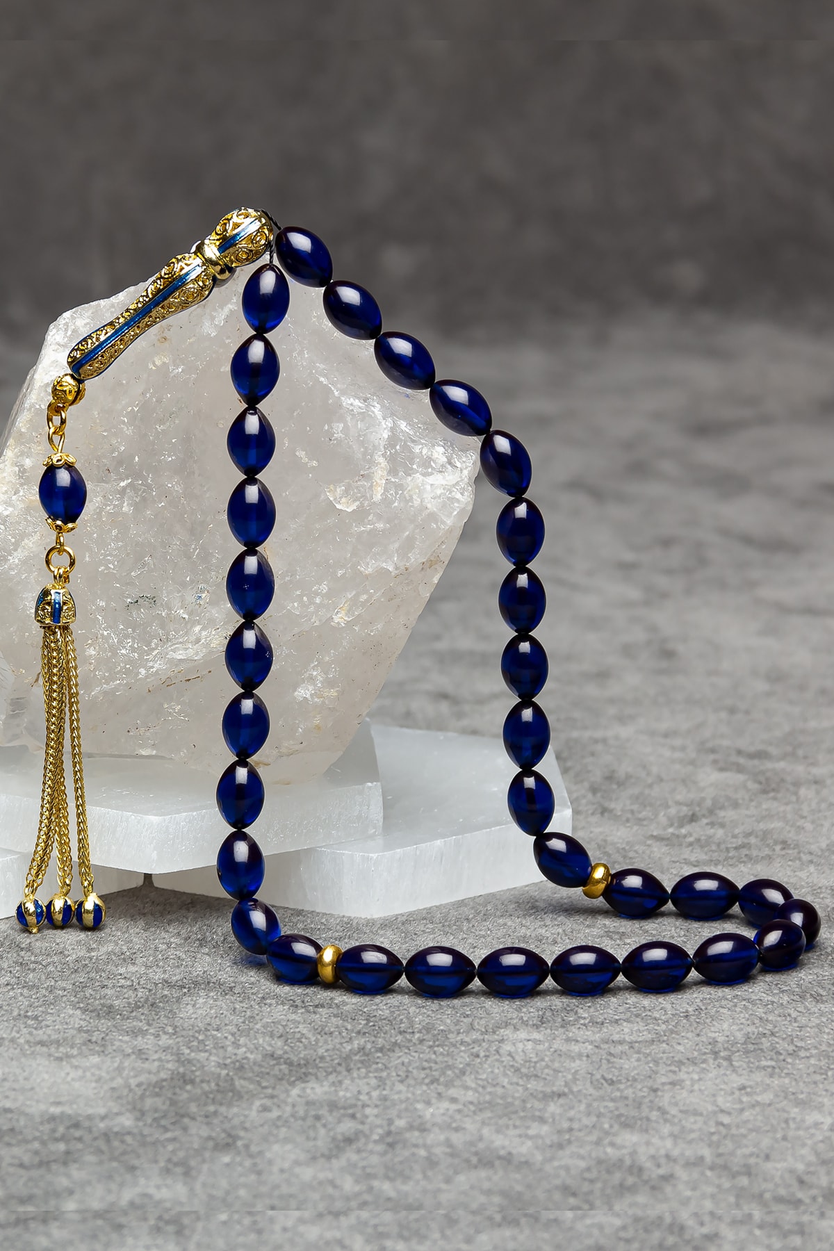 Altın Kaplama Telkari Imame Püskül Takımlı Parlament Mavisi Ateş Kehribar Tesbih