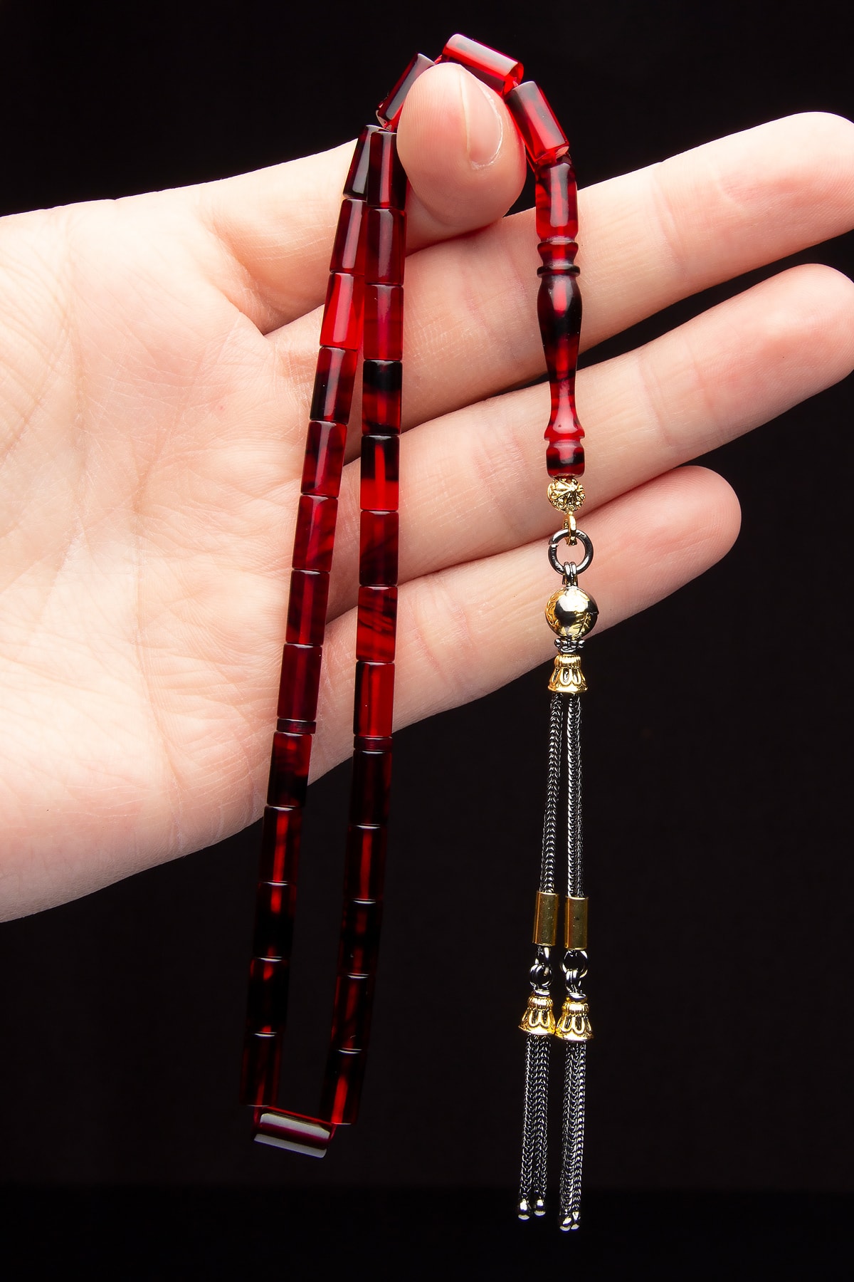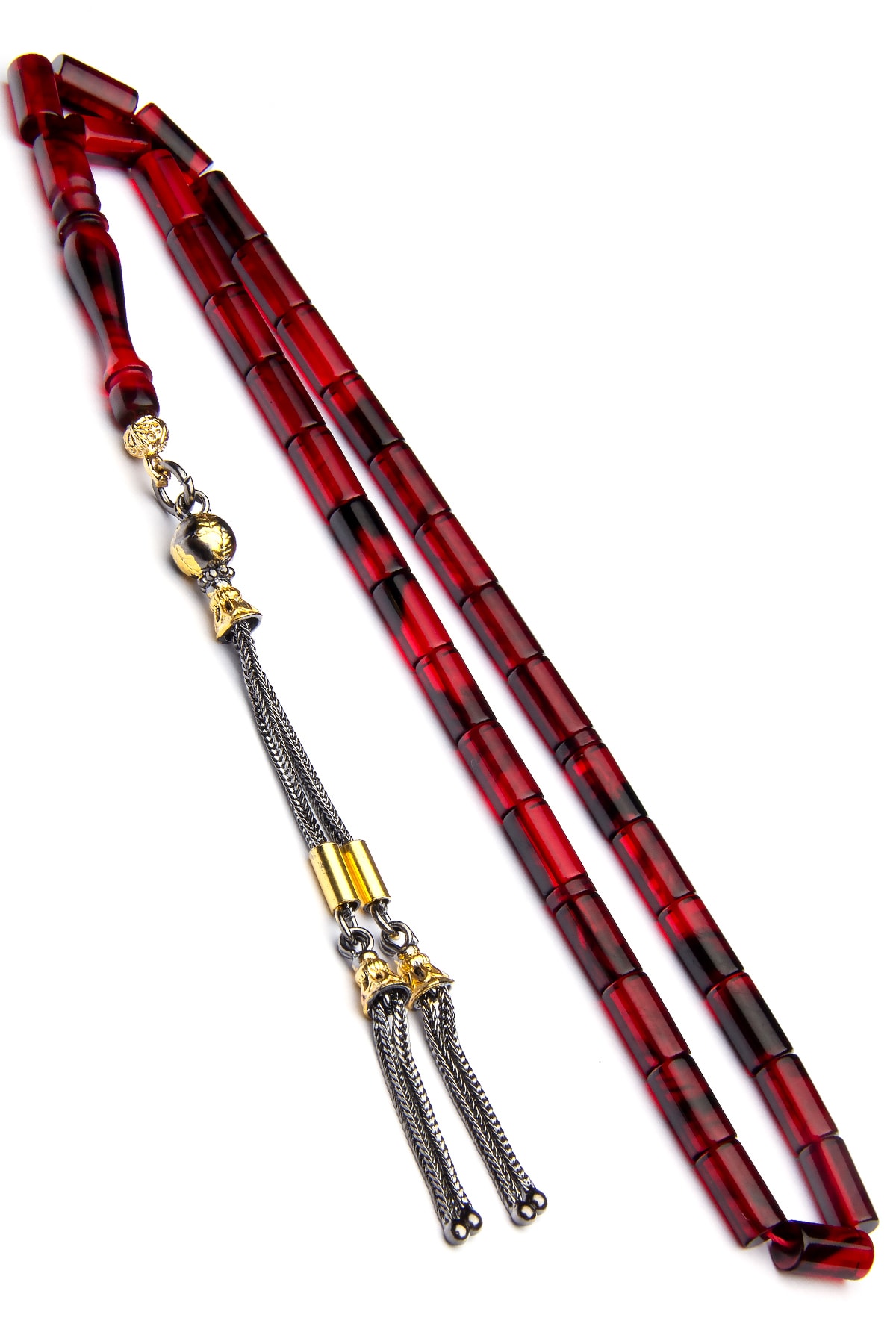 Altın Ve Rodaj Kaplama 925 Ayar Gümüş Püsküllü 5.5×10.5mm Kesme Model Kırmızı Sıkma Kehribar Tesbih