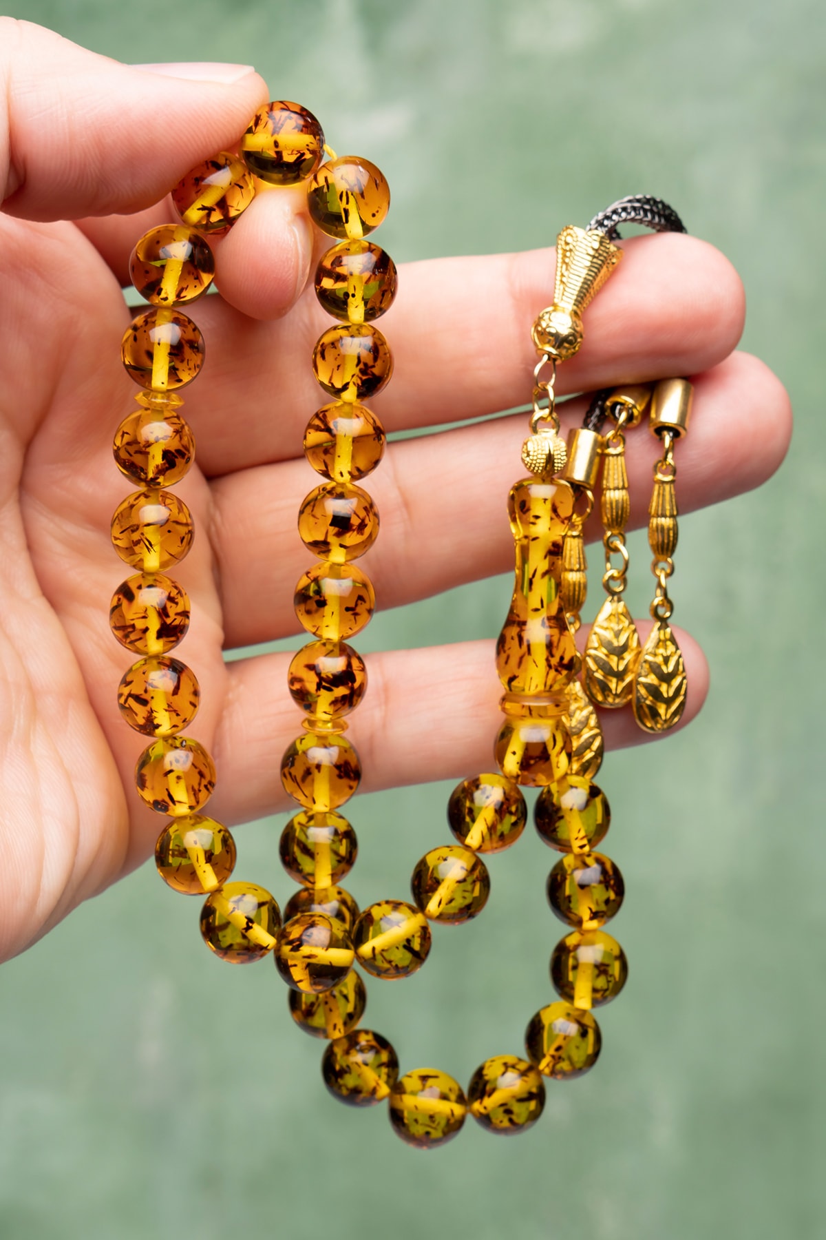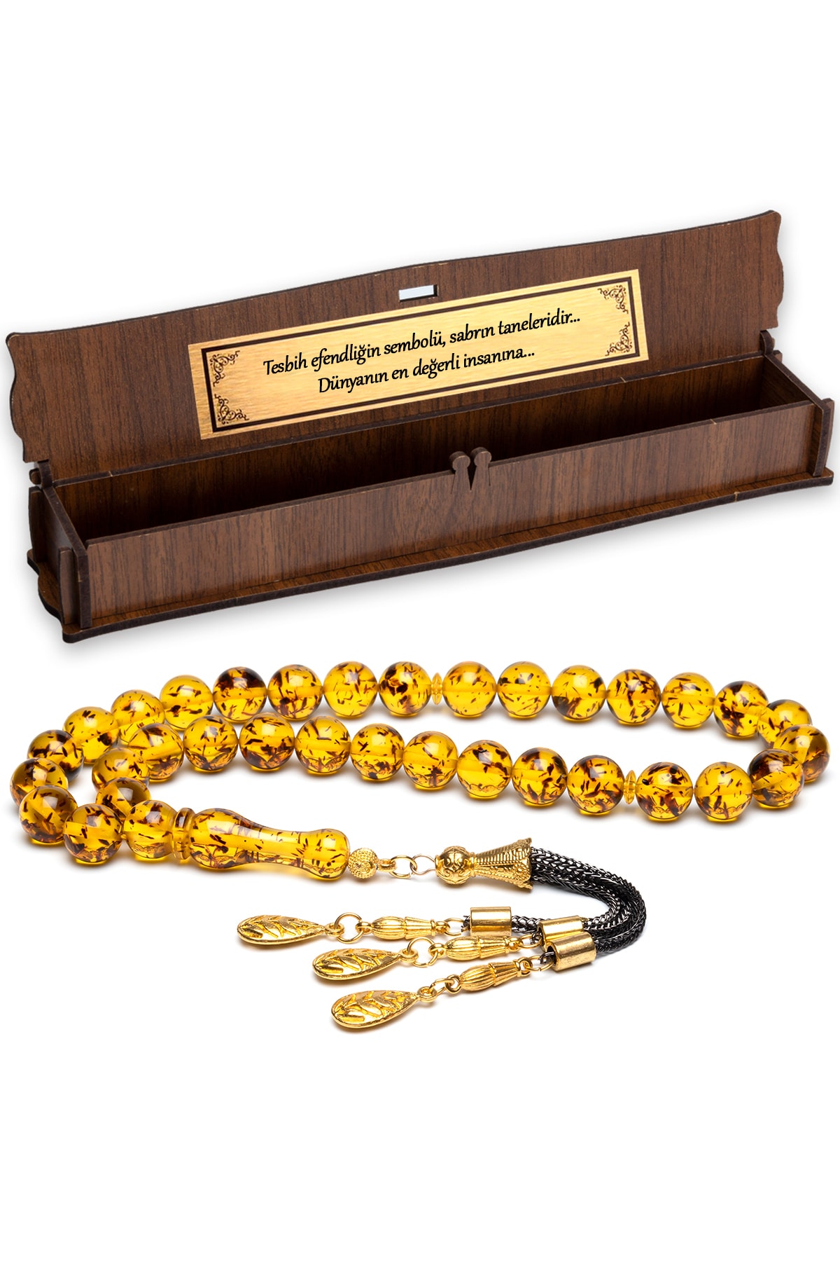 Altın kaplama detaylarıyla zenginleştirilmiş, şık ve zarif bir tasarıma sahip; Doğal kehribar taşı kullanılarak üretilmiş, her bir damla kehribarın benzersiz dokusu ve rengiyle dikkat çeker; Ahşap kutusuyla birlikte sunulan bu tesbih, hem kullanım kolaylığı hem de estetik bir görünüm sağlar;