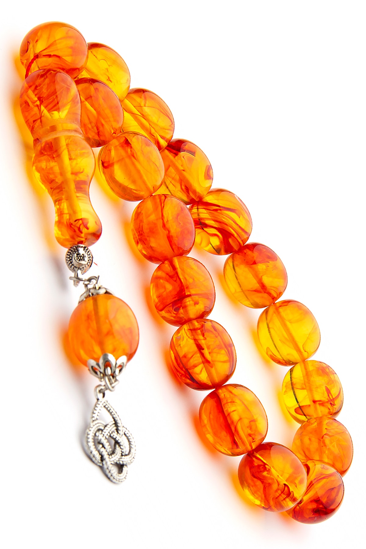 Kehribar taşı, doğal güzelliği ve benzersiz dokusuyla dikkat çeken bir malzemedir; Bu tesbih, kehribarın sıcak ve doğal tonlarını taşıyan bal rengi ile öne çıkar; Gümüş kaplama detayları, tesbihin şıklığını artırarak hem göz alıcı bir görünüm sunar hem de dayanıklılık sağlar; 14x15mm boyutlarındaki bu tesbih, rahat kullanım için idealdir ve her parmak tipine uyum sağlar; Hareli tasarım, klasik ve zarif bir görünüm kazandırarak her ortamda dikkat çekici bir aksesuar olmasını sağlar;