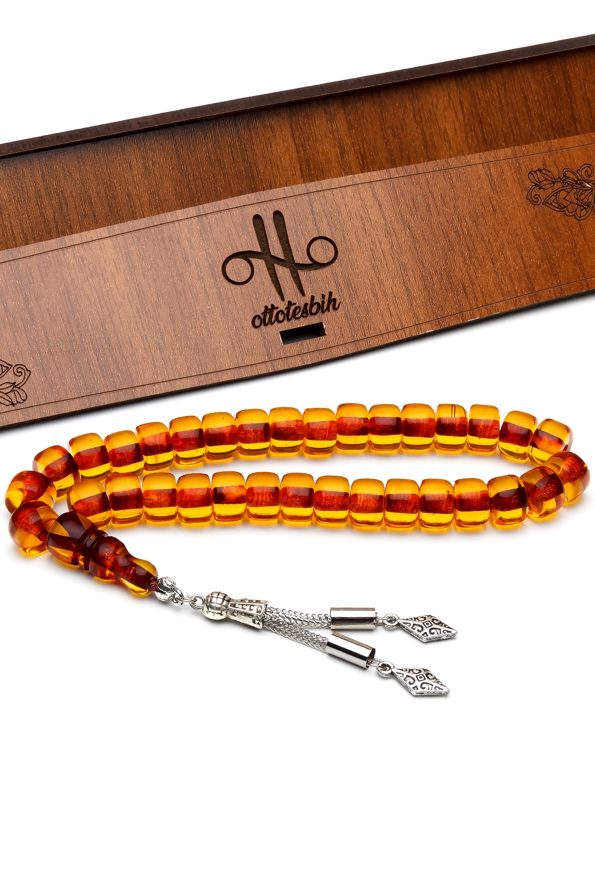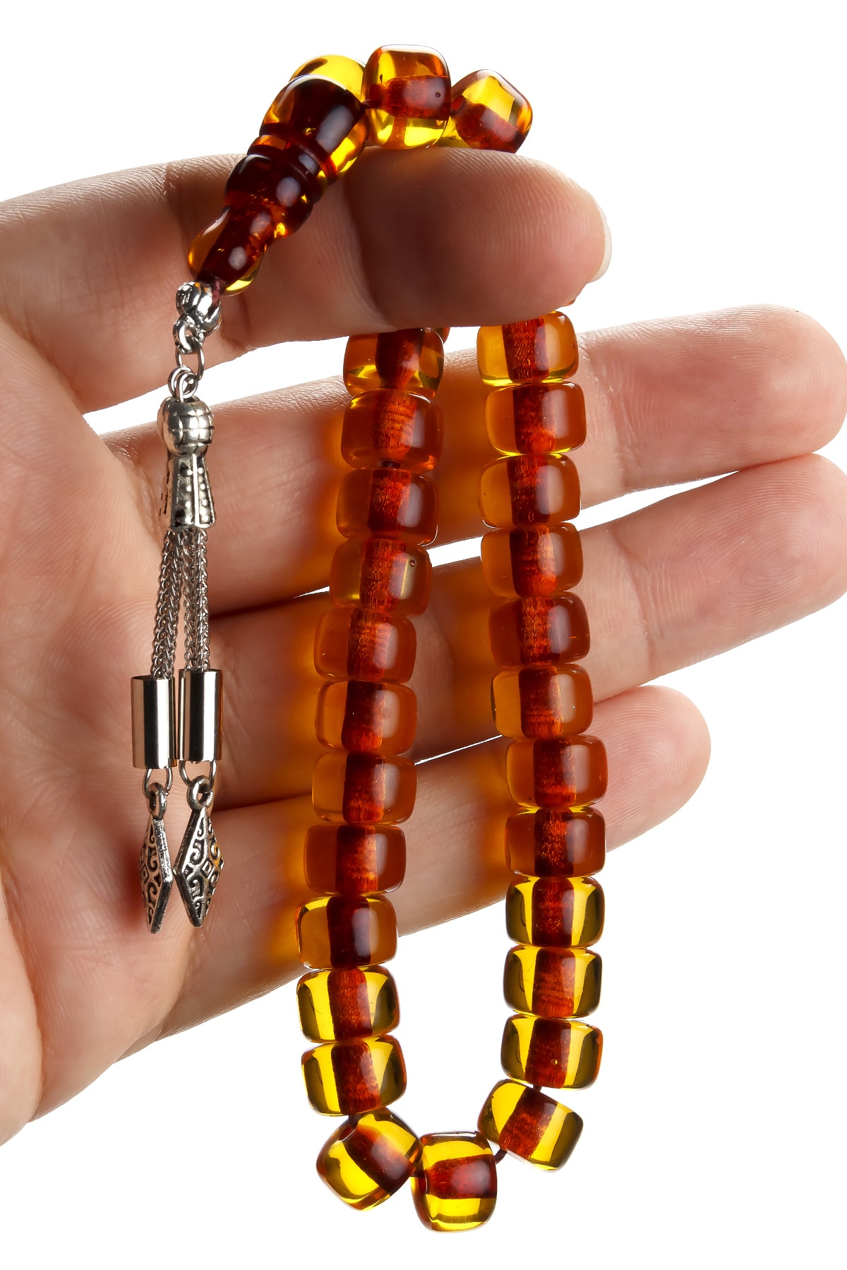 Gümüş kaplama detaylarıyla zenginleştirilmiş, şık ve modern bir tasarıma sahip; Doğal kehribar taşı kullanılarak üretilmiş, her bir tesbih tanesi el işçiliği ile özenle işlenmiştir; 8; 5x11mm boyutlarındaki bu tesbih, rahat kullanım için idealdir ve kolayca taşınabilir; Bal rengi kehribar taşı ile göz alıcı bir görünüm sunar ve her ortamda dikkat çeker;