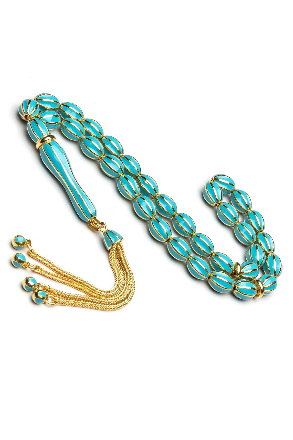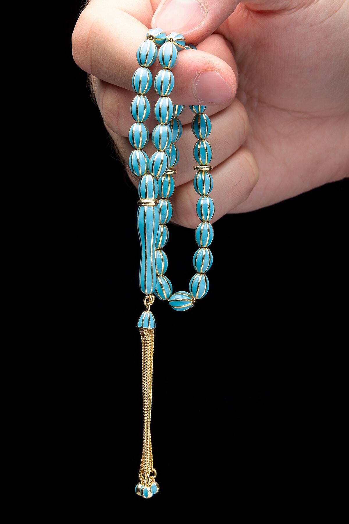 925 ayar gümüşten üretilmiş, uzun ömürlü ve kaliteli bir kullanım sunar; Altın kaplama detayları ile zenginleştirilmiş, şık ve göz alıcı bir görünüm kazandırır; Turkuaz mine işlemeli tasarımıyla dikkat çeker ve estetik bir parlaklık sağlar; Doğal taş kullanımı, her tesbihin benzersiz ve otantik bir karaktere sahip olmasını garanti eder; 6x8mm boyutlarındaki taşlar, rahat kullanım için ideal boyutlarda olup, kolayca taşınabilirlik sunar;