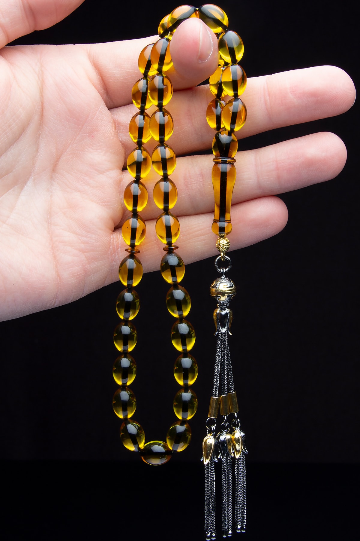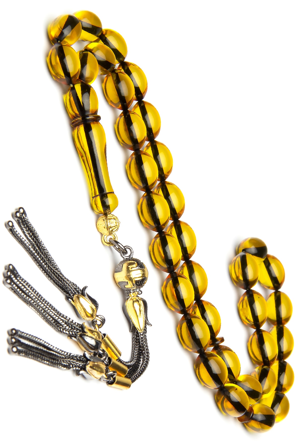 – 925 ayar gümüş malzeme ile üretilmiş, uzun ömürlü ve kaliteli bir kullanım sunar; – Altın kaplama detayları, tesbihin şıklığını artırarak göz alıcı bir görünüm kazandırır; – Bal rengi ateş kehribar taşı, doğal güzelliğiyle dikkat çeker ve her kullanımda estetik bir deneyim sağlar; – Püskül detayları, tesbihin zarifliğini tamamlar ve modern bir dokunuş katar;