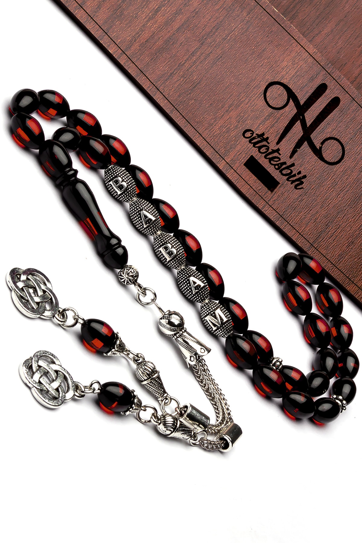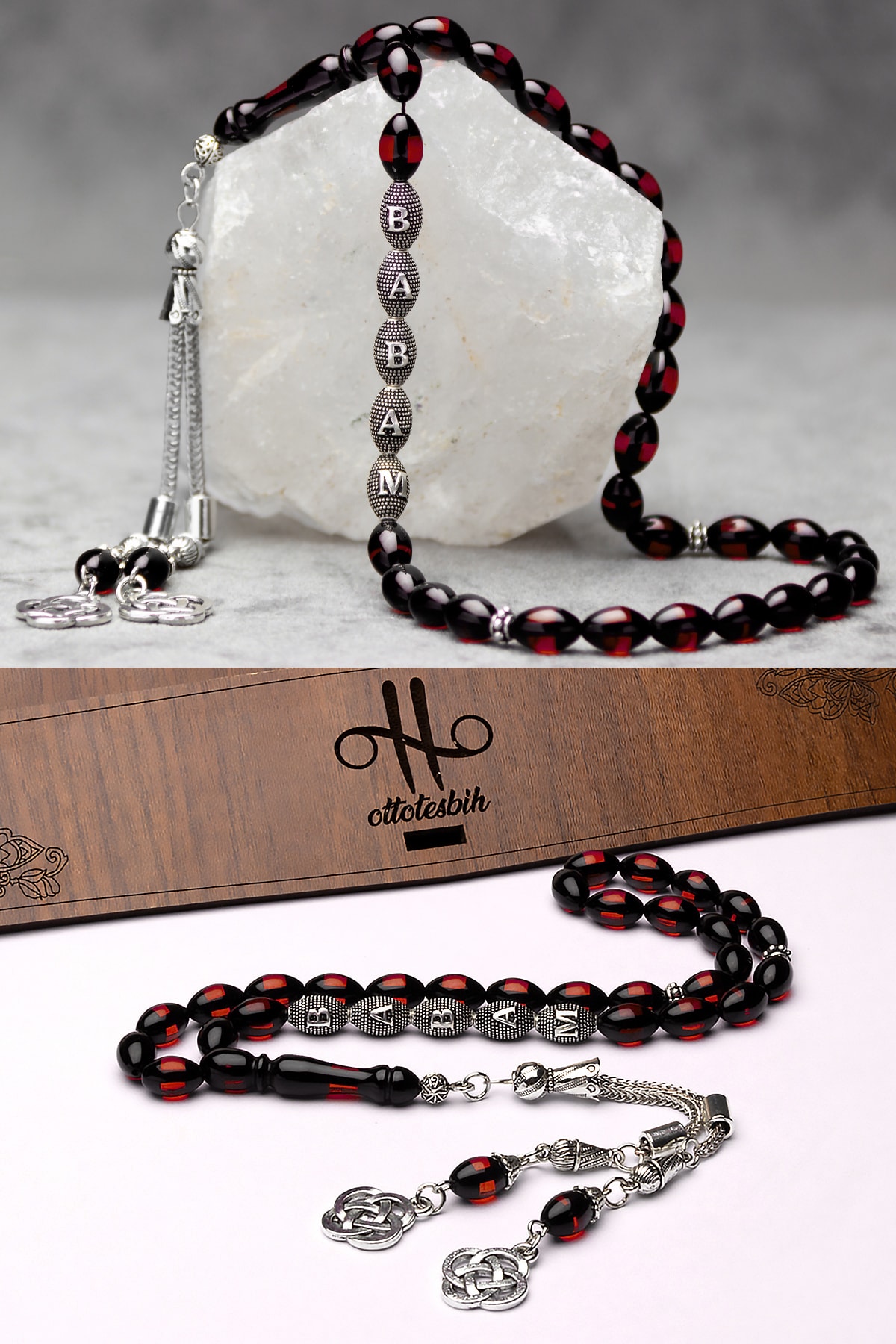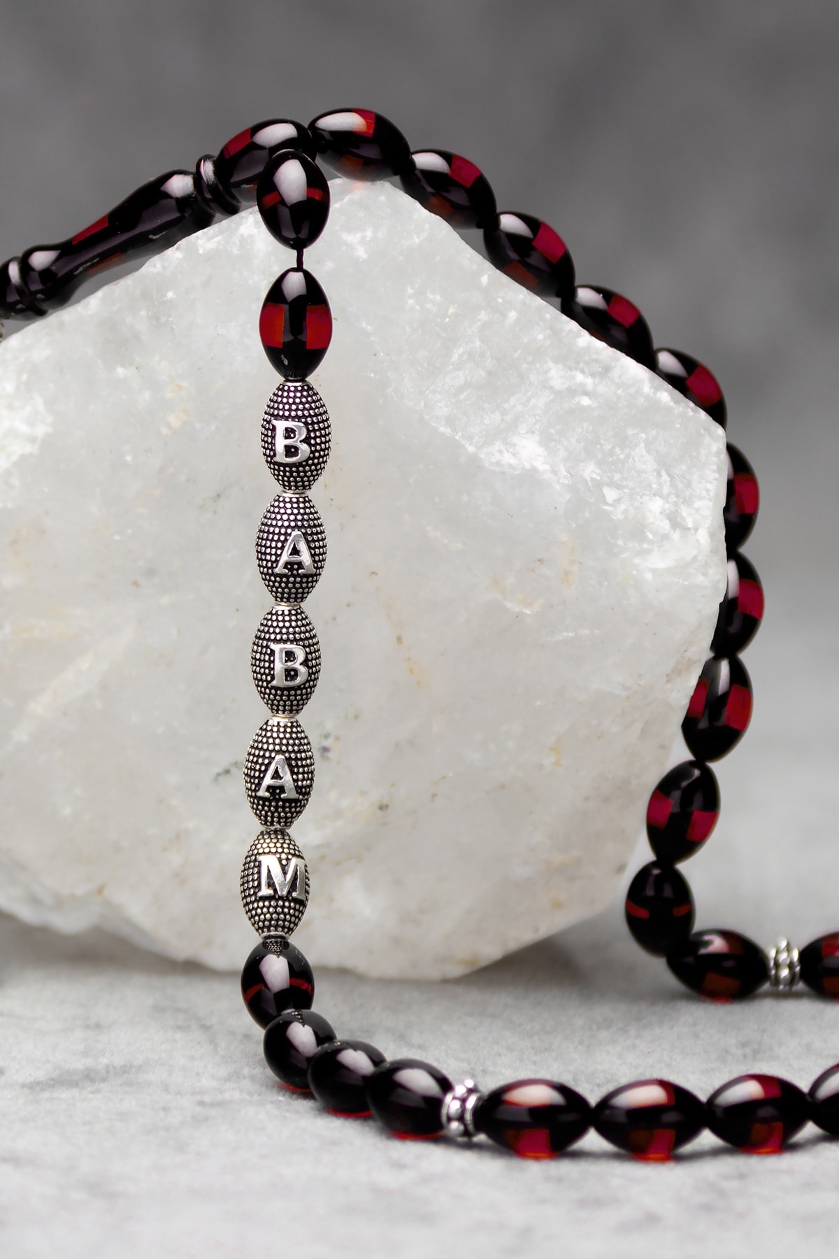 Erkek Babalar Günü 925 Ayar Gümüş Harfli 7x11mm Kırmızı Kokulu Toz Kehribar Tesbih