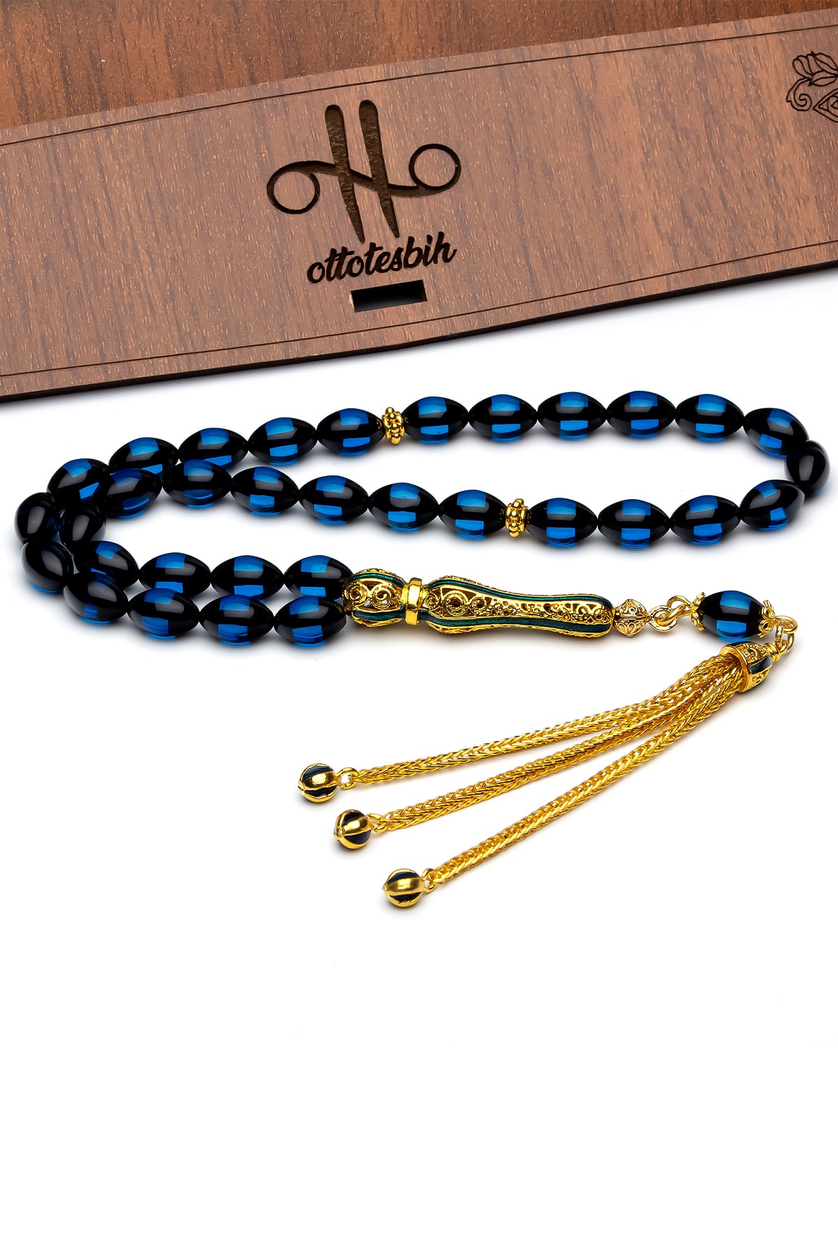 Erkek Gece Mavisi Telkari Imame Püskül Takımlı Sürmeli Kehribar Tesbih 7x11mm