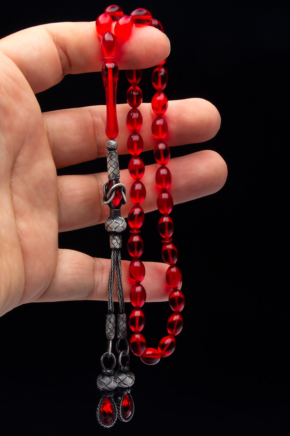 Erkek Gümüş Kazaz Püsküllü 7x11mm Kırmızı Ateş Kehribar Tesbih