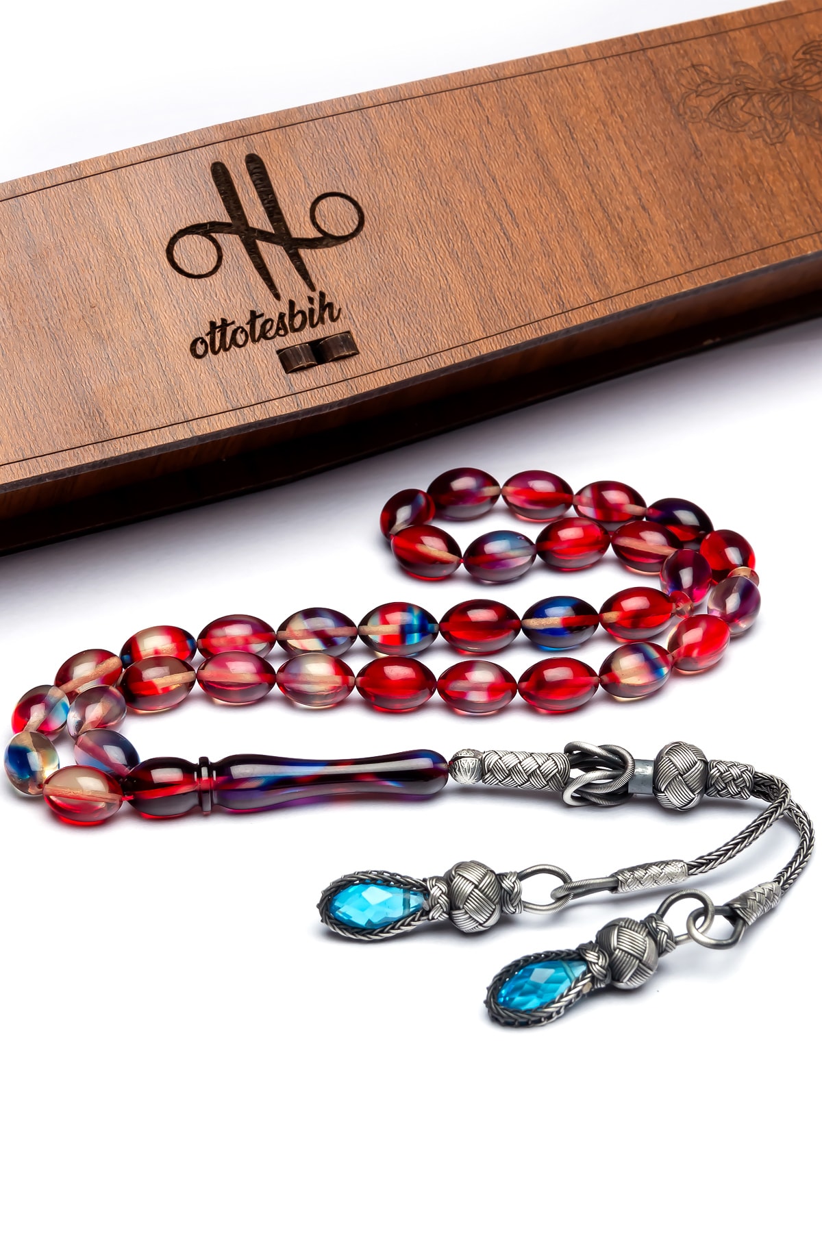 Ateş kehribar taşı, doğal güzelliği ve benzersiz dokusuyla dikkat çeken bir materyaldir; Gümüş kaplama detayları, bu tesbihin şıklığını artırarak her kullanımda göz alıcı bir görünüm sunar; 7x11mm boyutlarındaki püskül, hem estetik hem de işlevsel bir detay olarak tesbihin tasarımına zarif bir dokunuş katmaktadır; Kırmızı ve mavi renk kombinasyonu, klasik ve modern çizgileri bir arada barındırarak farklı zevklere hitap eder;