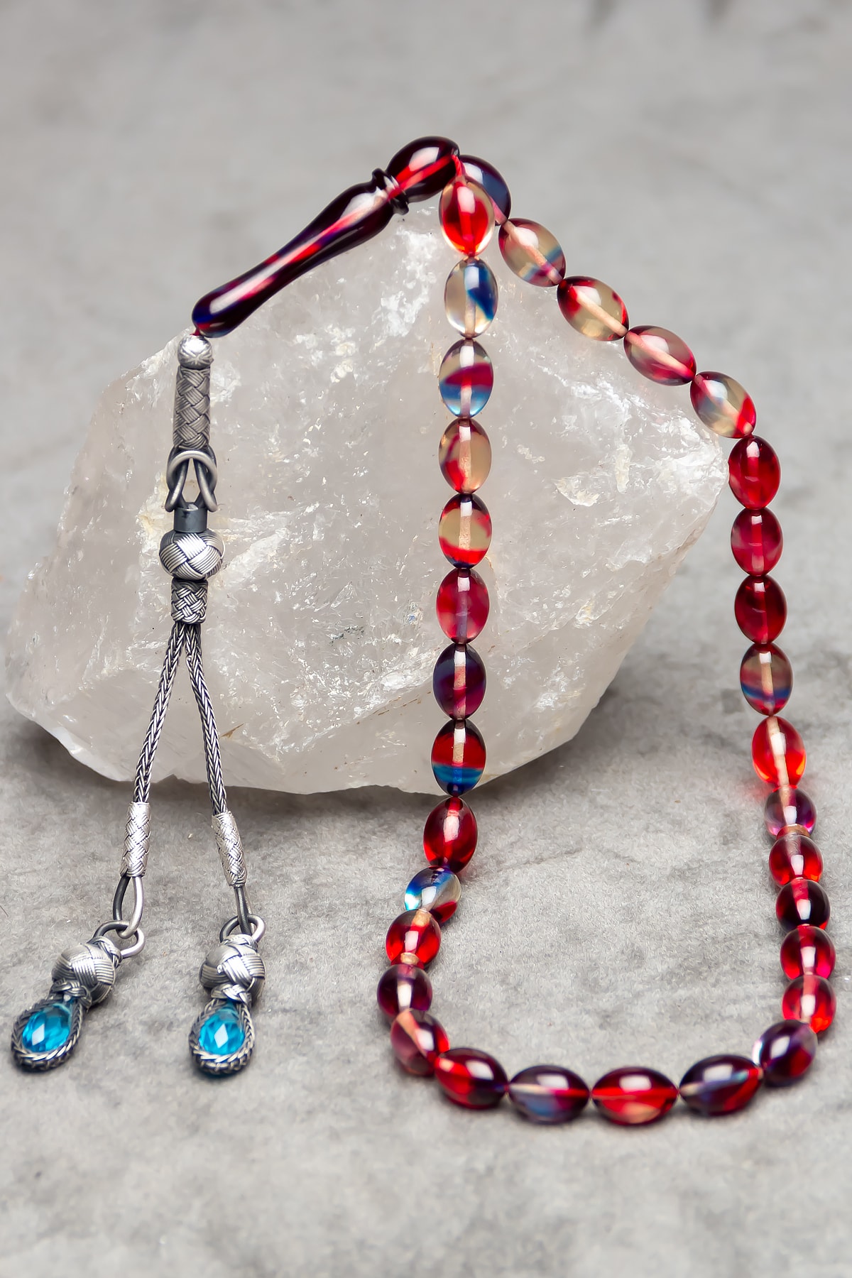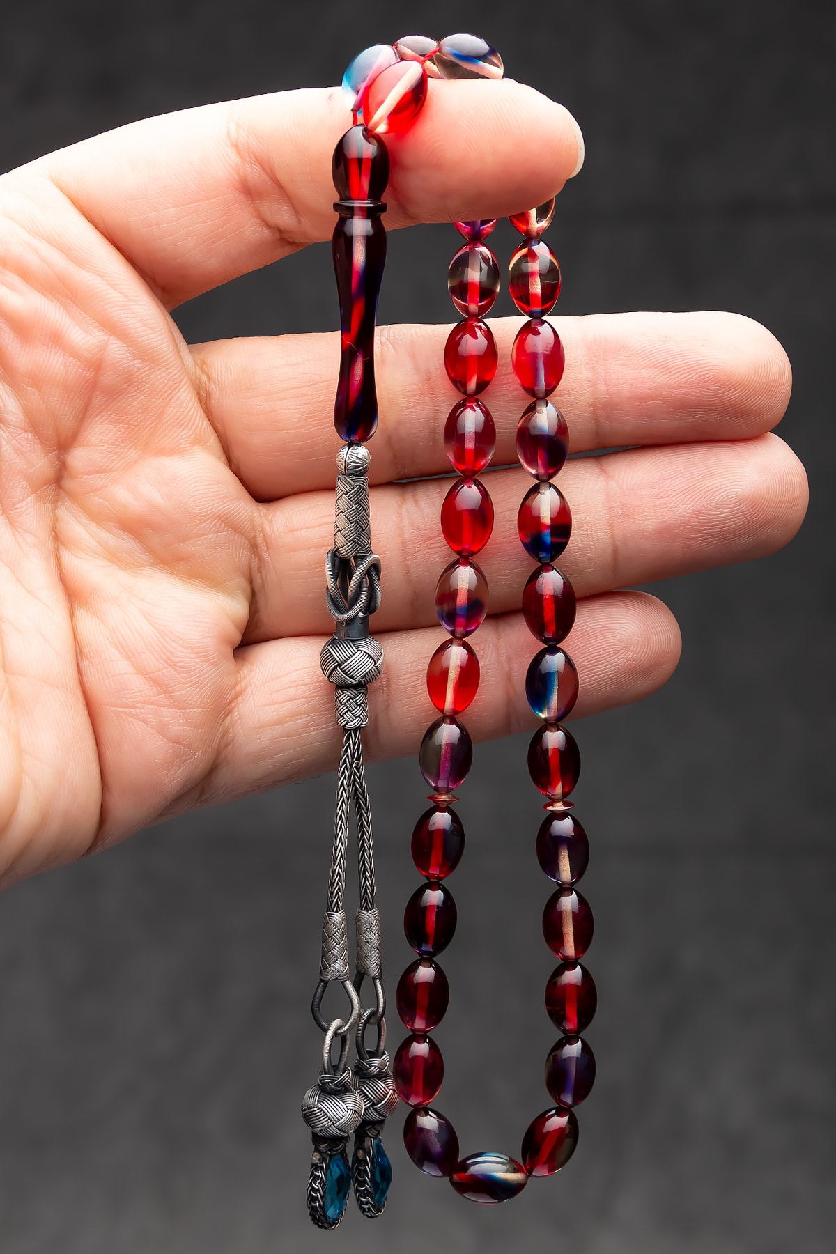 Erkek Gümüş Kazaz Püsküllü 7x11mm Kırmızı Mavi Renk Süzmesi Ateş Kehribar Tesbih
