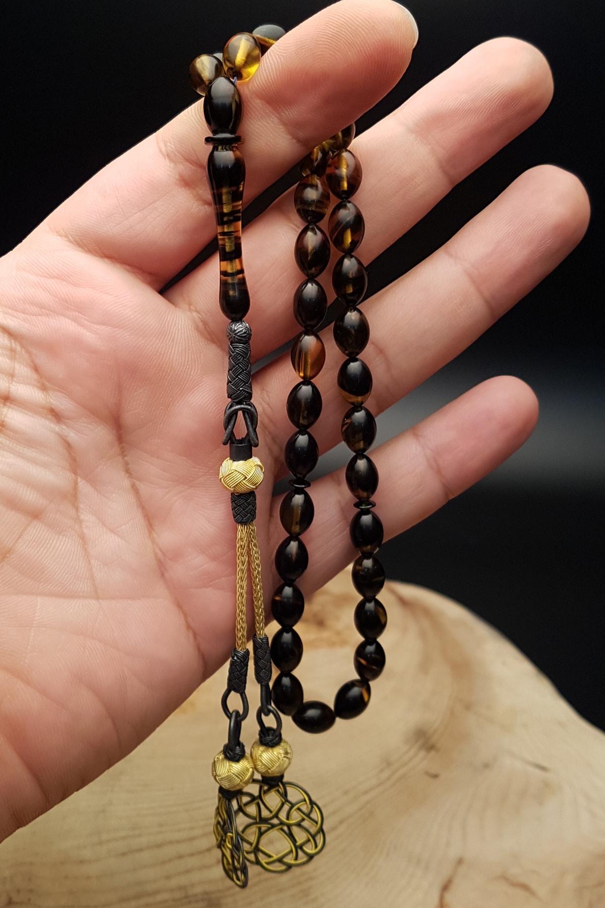 Ateş kehribarın doğal güzelliğini yansıtan bu tesbih, her kullanımda zarif bir dokunuş sunar; Sarı ve siyah renklerin uyumlu kombinasyonu ile dikkat çeken tasarım, klasik ve modern çizgileri bir arada barındırır; Püskül detayları ile zenginleştirilmiş bu tesbih, hem şıklığı hem de işlevselliği bir arada sunar; Kaliteli malzemeden üretilmiş olup, uzun ömürlü kullanım vaat eder;