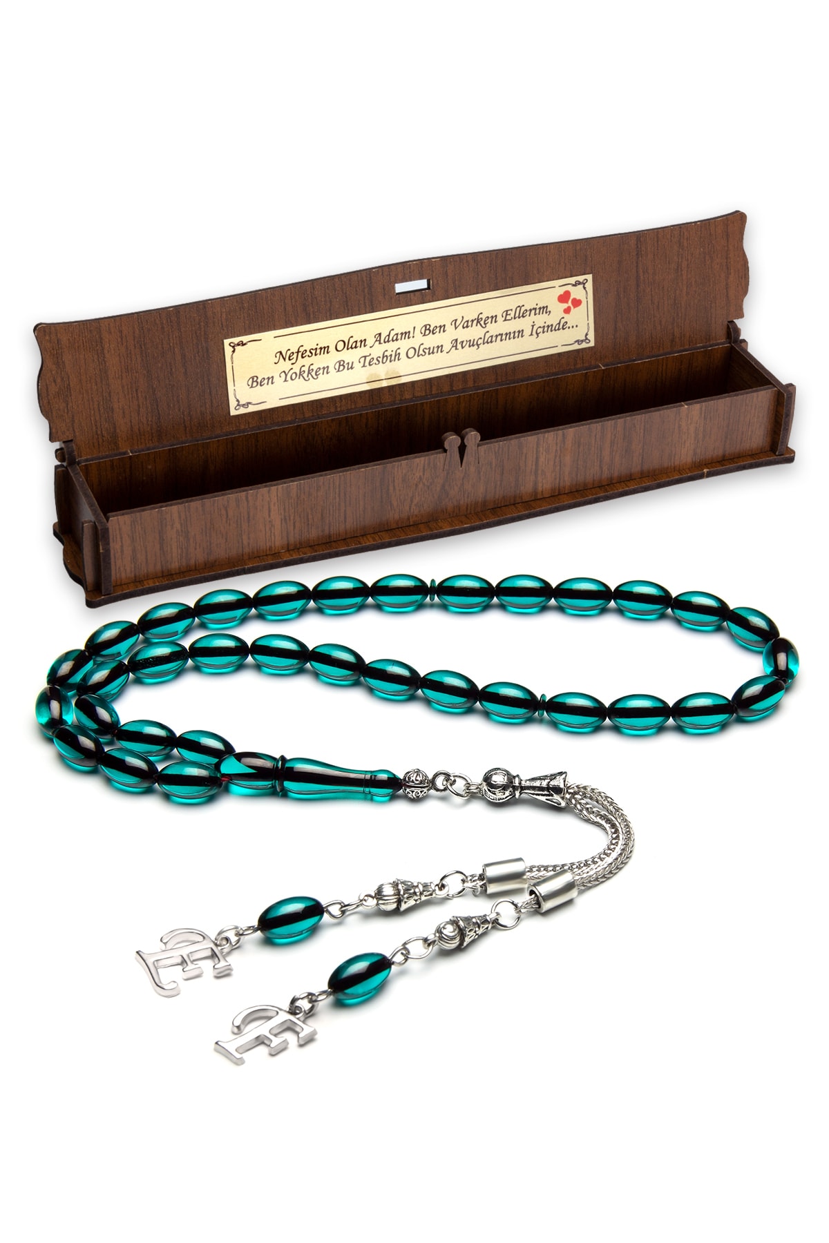• Tesbih Malzemesi: Ateş Kehribar • Tane Boyutu: 7x11mm • Kamçı (Püskül) Tipi: Alpaka Metal • Paket Içeriği: 1 Adet Tesbih, 1 Adet Şık Ahşap Tesbih Saklama Kutusu