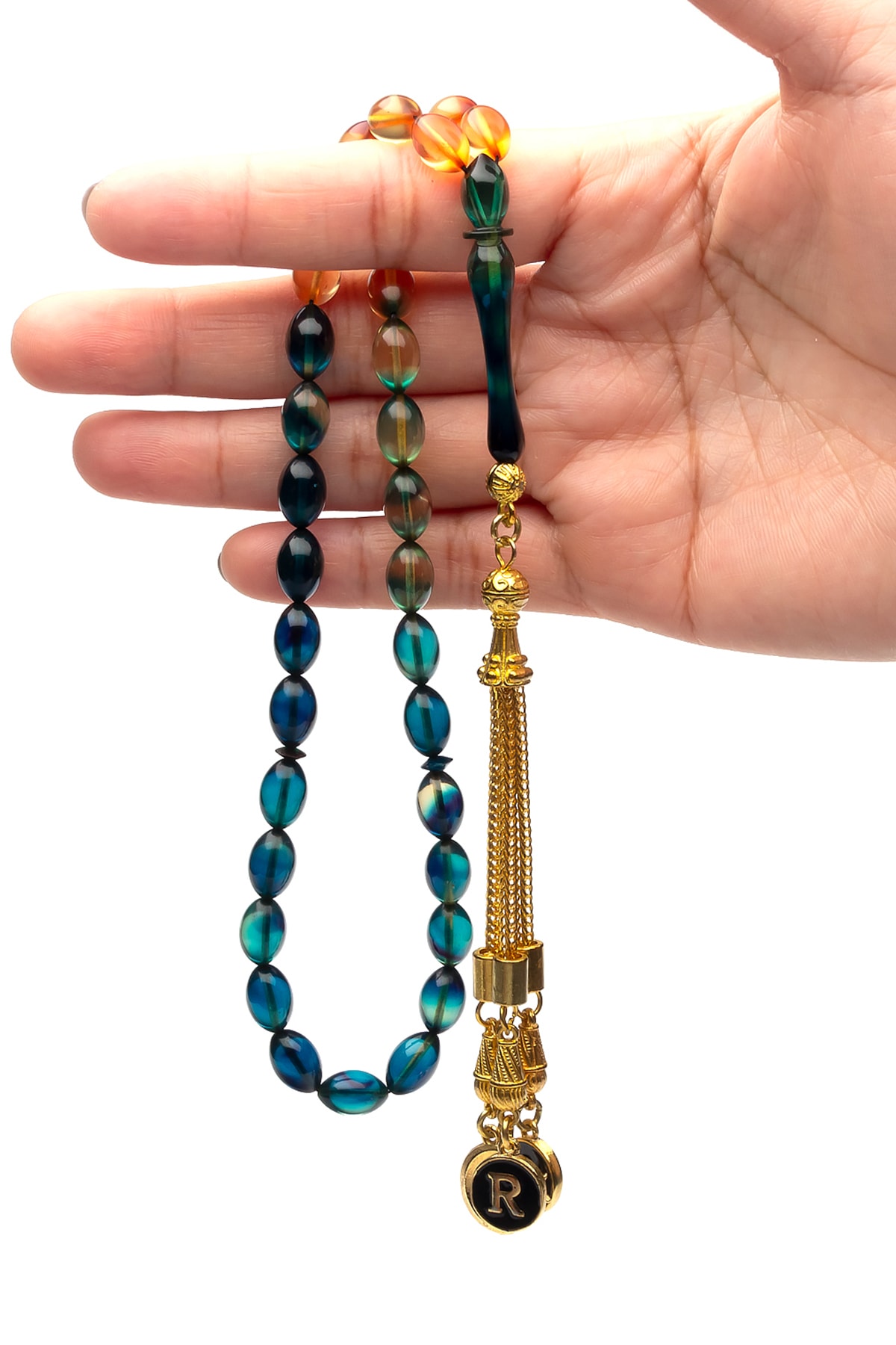 Kehribar taşı, doğal güzelliği ve benzersiz dokusuyla dikkat çeken bir malzemedir; Bu tesbih, kehribarın sıcak ve doğal tonlarını yansıtan mavi şeffaf renk süzmesiyle öne çıkar; Altın kaplama detayları, tesbihin hem şık hem de dayanıklı bir görünüm kazanmasını sağlar; Bu sayede, uzun süreli kullanım için idealdir; 7x11mm boyutlarındaki bu tesbih, rahat bir kullanım sunar ve parmaklarınızın rahatça kavrayabileceği ideal bir boyuttadır; Mavi şeffaf renk süzmesi, kehribarın doğal rengini ön plana çıkararak estetik bir görünüm sağlar; Bu özellik, tesbihin her açıdan dikkat çekici olmasını sağlar;