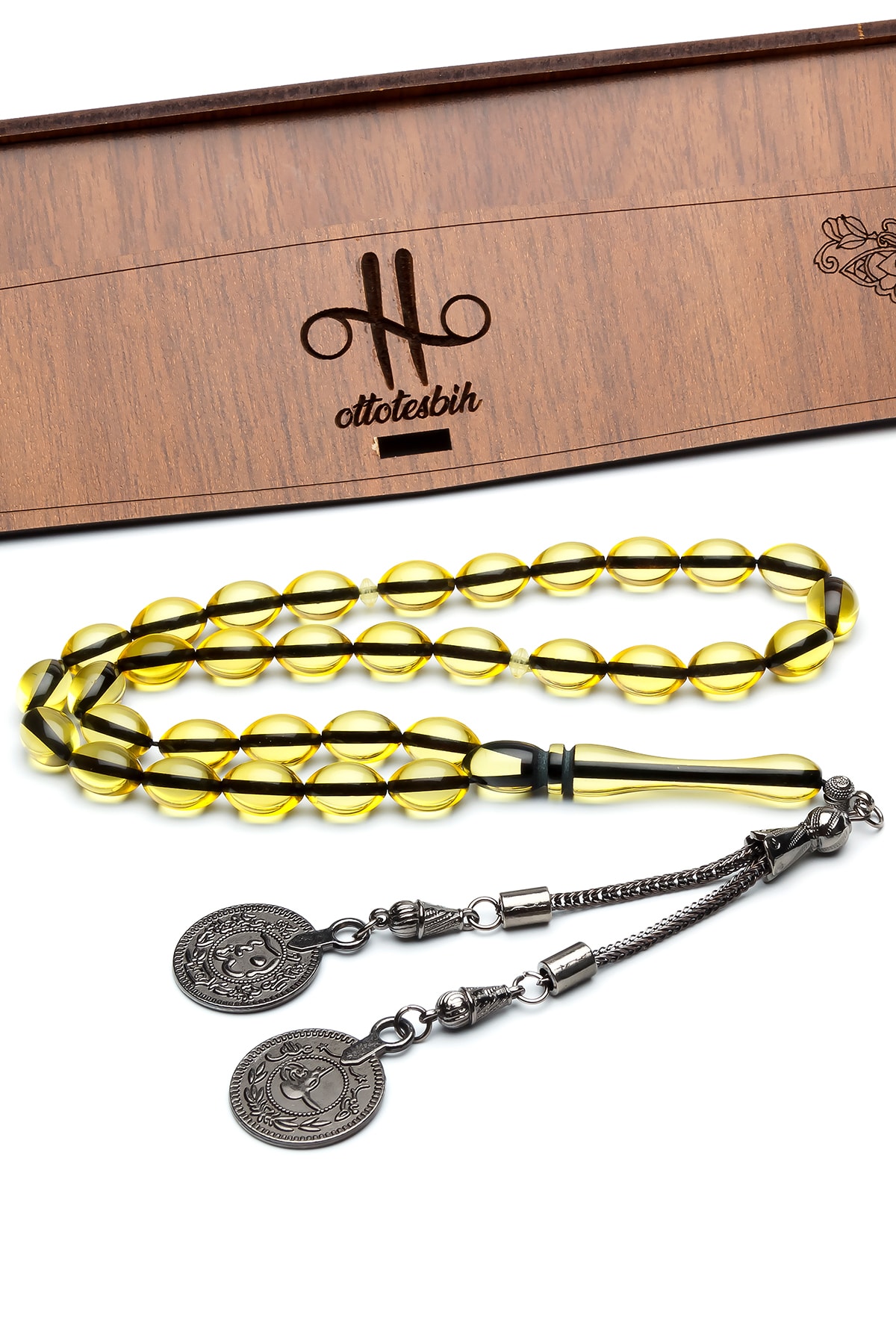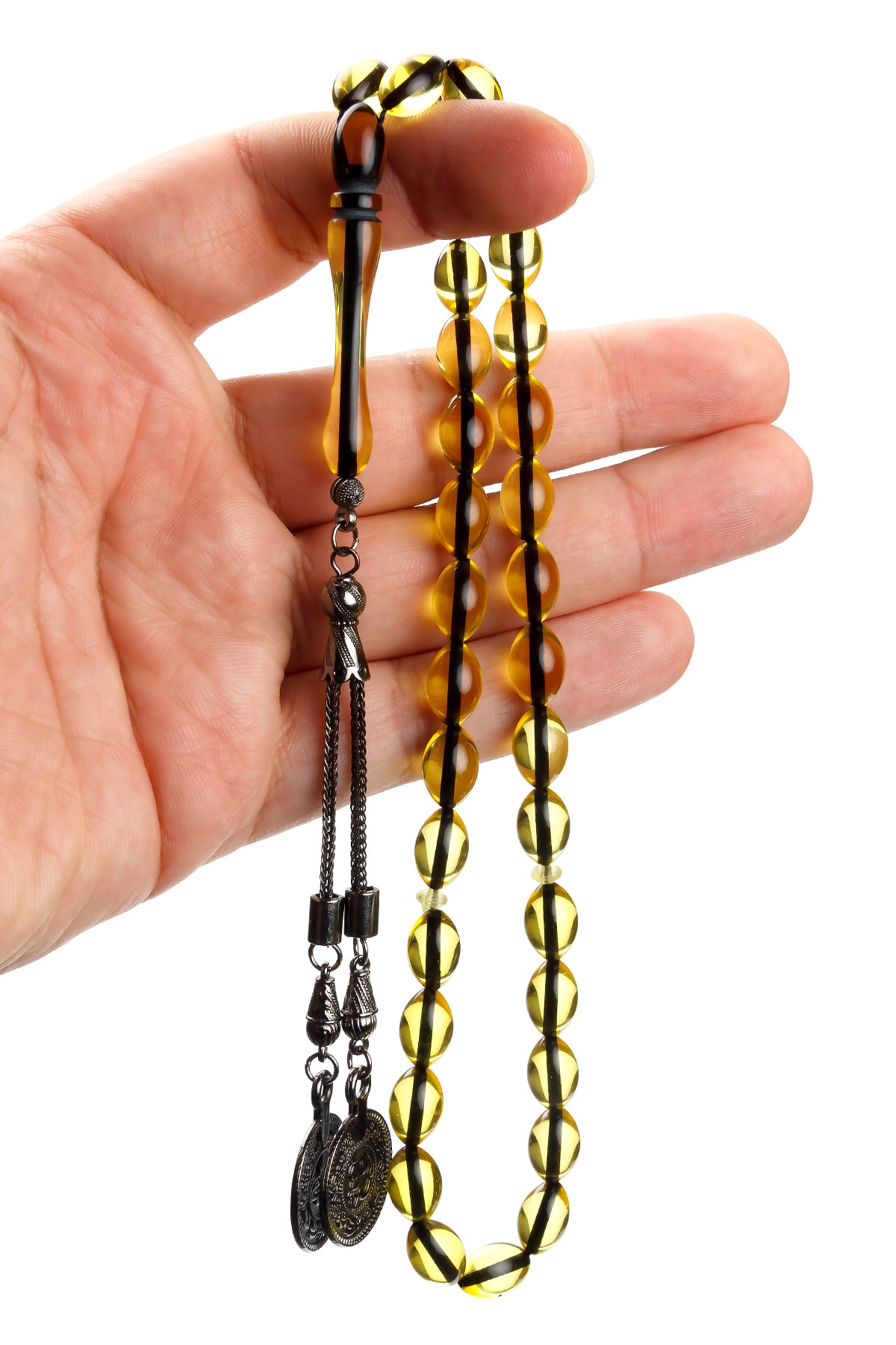 Gümüş kaplama detaylarıyla zenginleştirilmiş, şık ve modern bir tasarıma sahip; Doğal kehribar taşı kullanılarak üretilmiş, her bir tesbih tanesi el işçiliğiyle özenle işlenmiştir; 8x12mm boyutlarındaki bu tesbih, rahat kullanım için ideal boyutlarda tasarlanmıştır; Sarı renkli kehribar taşı ile dikkat çekici bir görünüm sunar ve şeffaf yapısıyla ışığı yansıtarak göz alıcı bir parlaklık kazandırır; Kokulu yapısı sayesinde her kullanımda hoş bir koku deneyimi yaşatır;