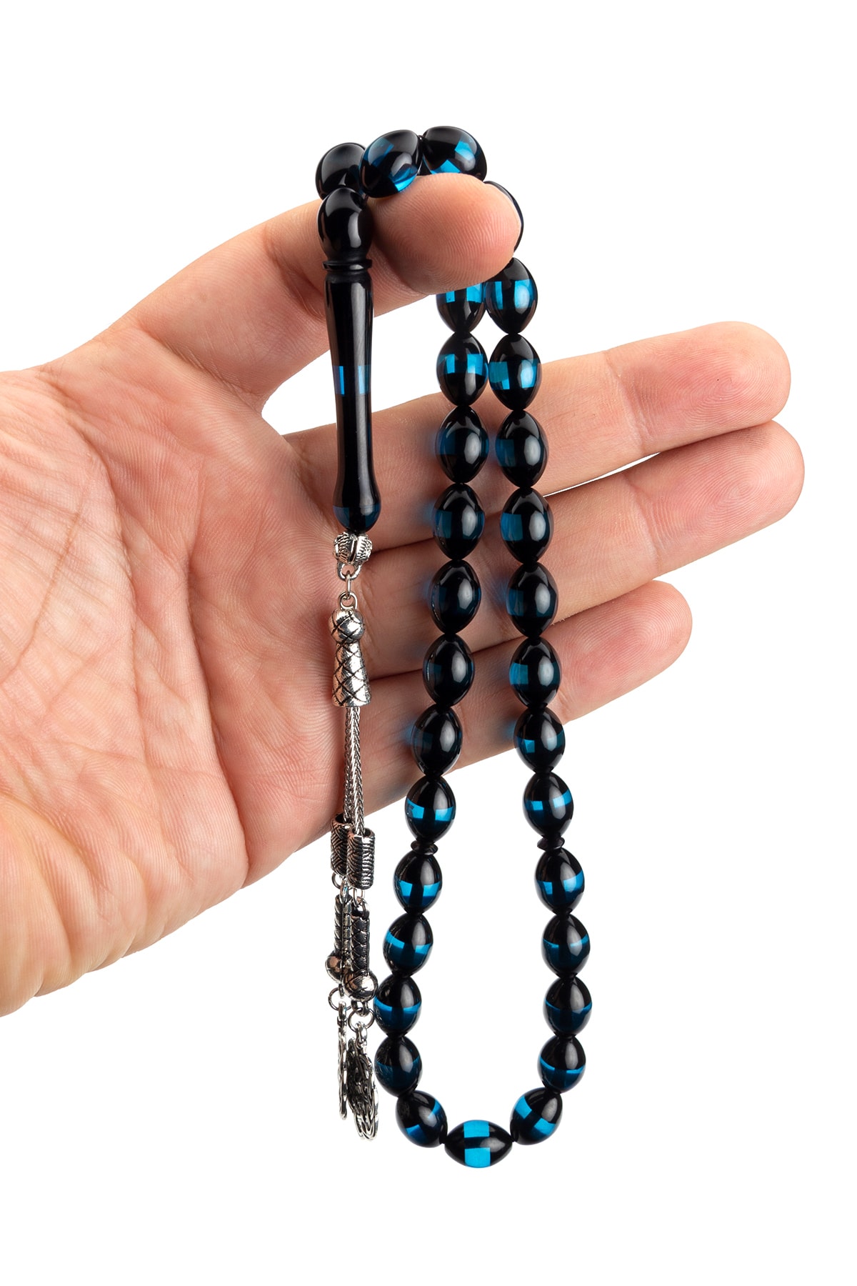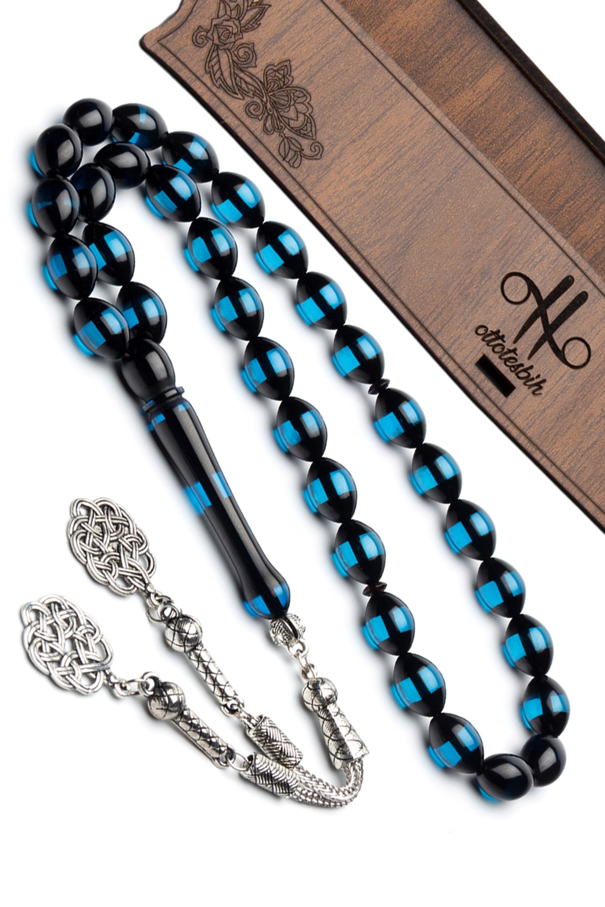 Kehribar taşı, doğal güzelliği ve benzersiz dokusuyla dikkat çeken bir malzemedir; Bu tesbih, kehribarın sıcak ve doğal tonlarını taşıyan mavi sürmeli tasarımıyla öne çıkar; Gümüş kaplama detayları, tesbihin şıklığını artırarak her kullanımda göz alıcı bir görünüm sunar; Hem dayanıklılığı hem de estetik görünümü ile uzun süreli kullanım için idealdir; Püskül detayları, klasik ve zarif bir dokunuş katarken, aşk düğümü tasarımıyla özel günlerde anlamlı bir hediye seçeneği oluşturur;
