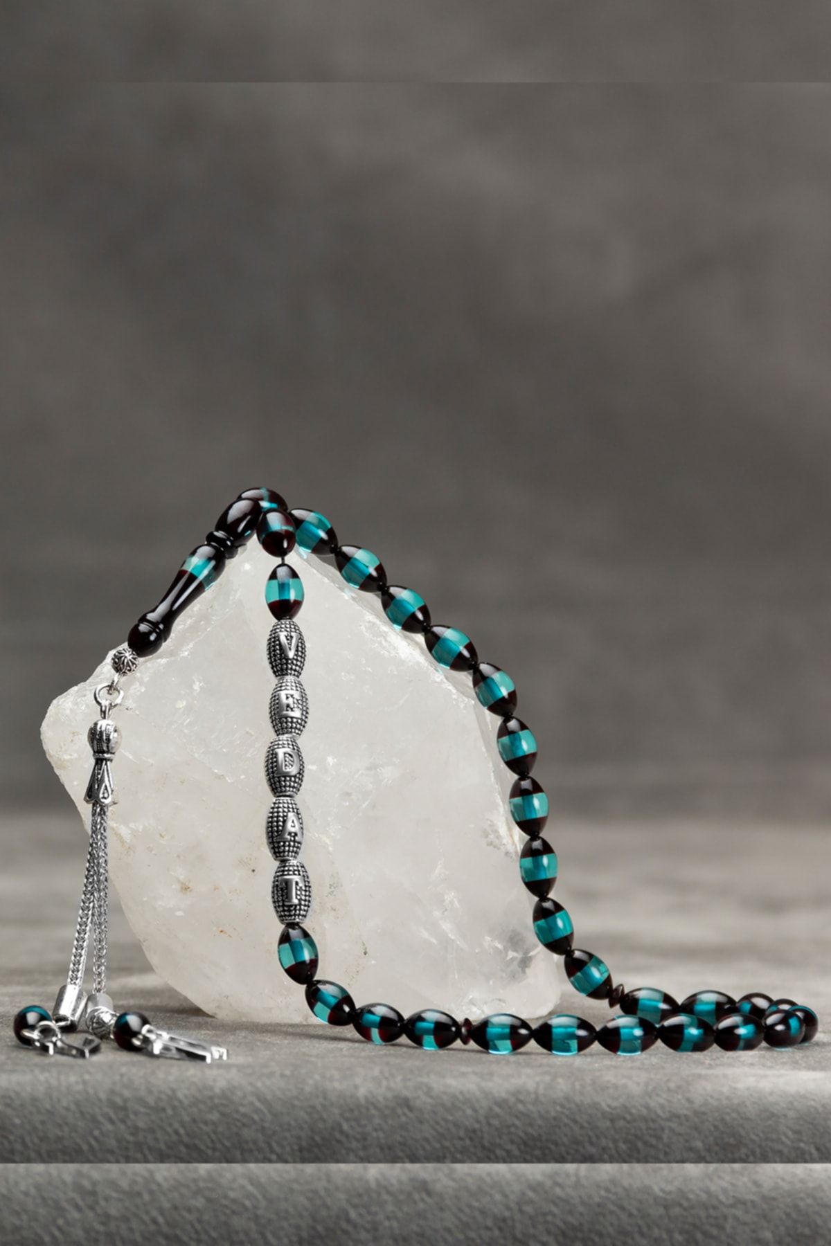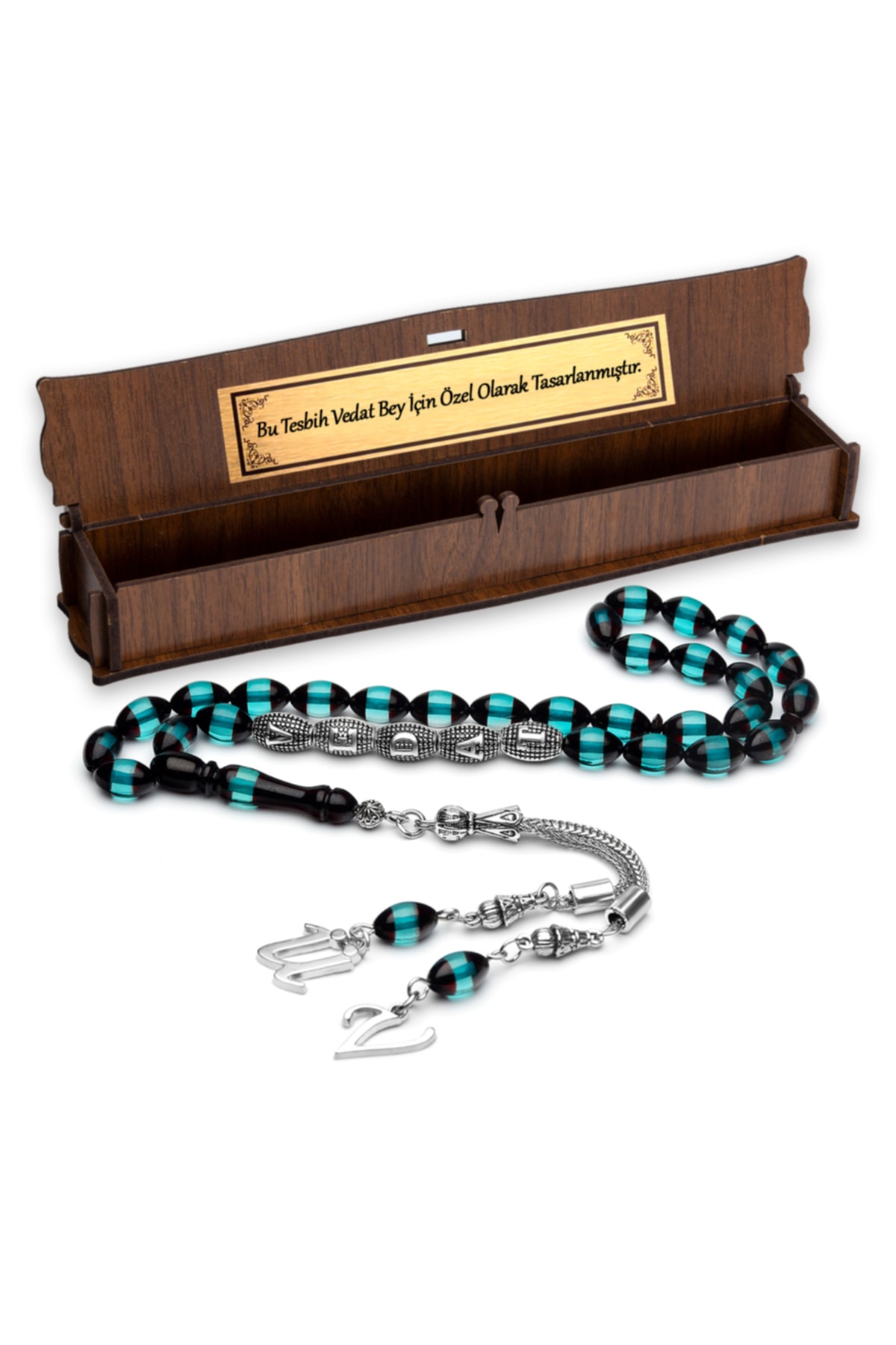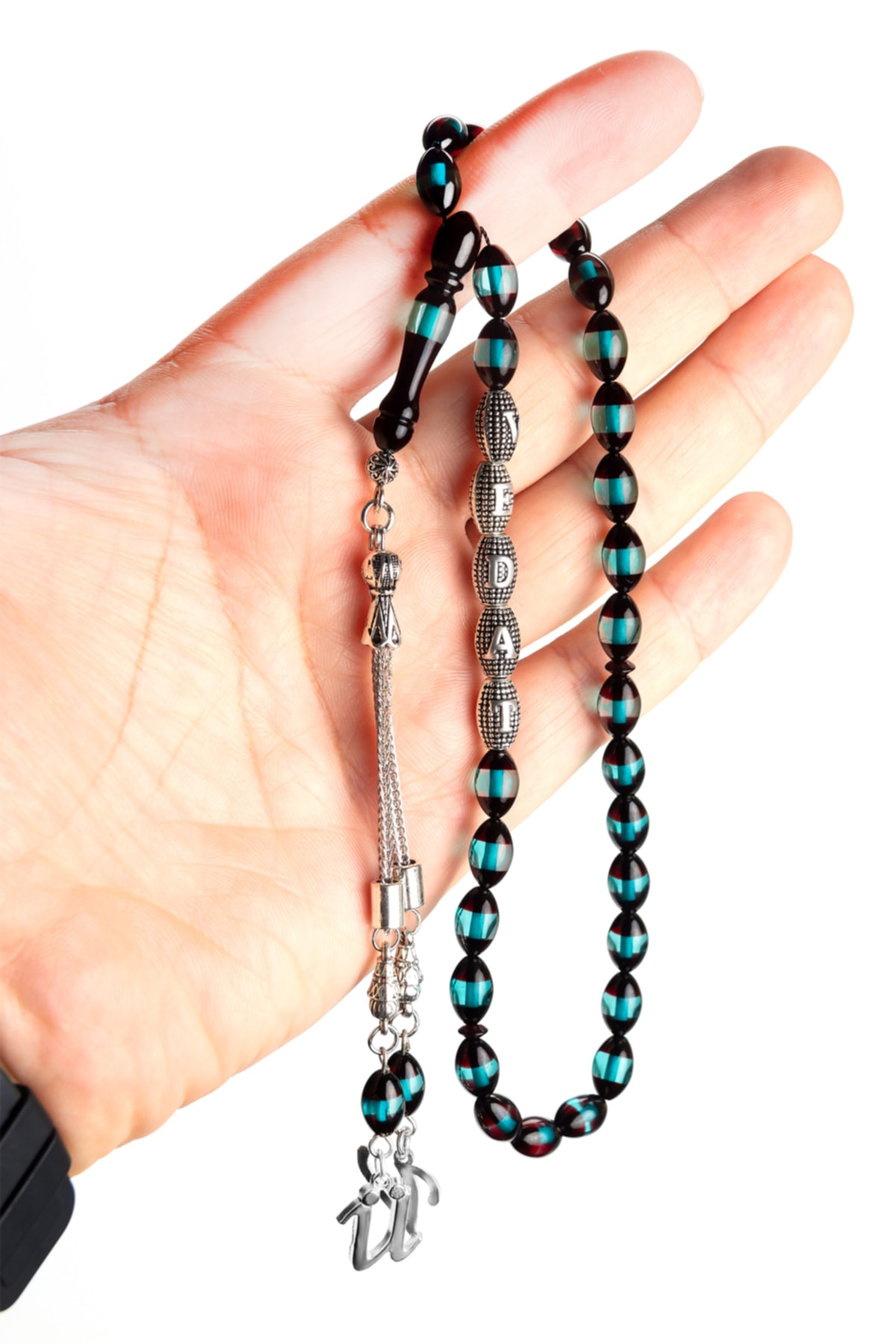 Kehribar taşı, doğal güzelliği ve benzersiz dokusuyla dikkat çeken bir materyaldir; Bu tesbih, kehribarın sıcak ve doğal tonlarını yansıtarak her kullanımda özel bir his sunar; Gümüş kaplama detayları ile zenginleştirilmiş tasarım, hem şıklığı hem de dayanıklılığı bir arada sunar; Tespihin parlak yüzeyi, ışığı mükemmel şekilde yansıtarak göz alıcı bir görünüm sağlar; İsimli tasarım özelliği sayesinde, sevdiklerinize kişisel bir hediye olarak sunabileceğiniz bu tesbih, onların ismini taşıyarak özel anıları ölümsüzleştirir; Su yeşili bordo renk kombinasyonu, klasik ve asil bir görünüm kazandırarak her ortamda dikkat çekici bir aksesuar olmasını sağlar;