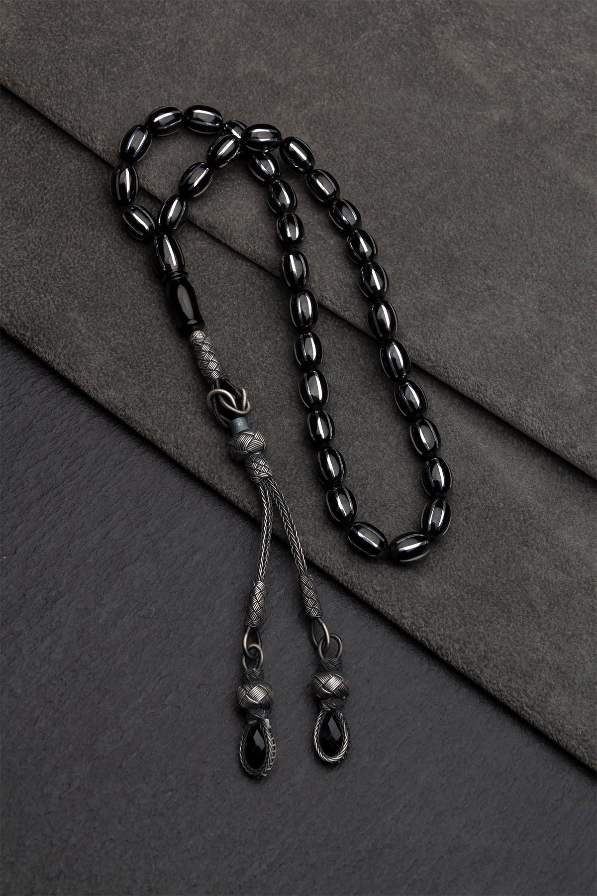 1000 Ayar Gümüş Kazaz Püsküllü İşlemeli Arpa Kesim Oltu Tesbih