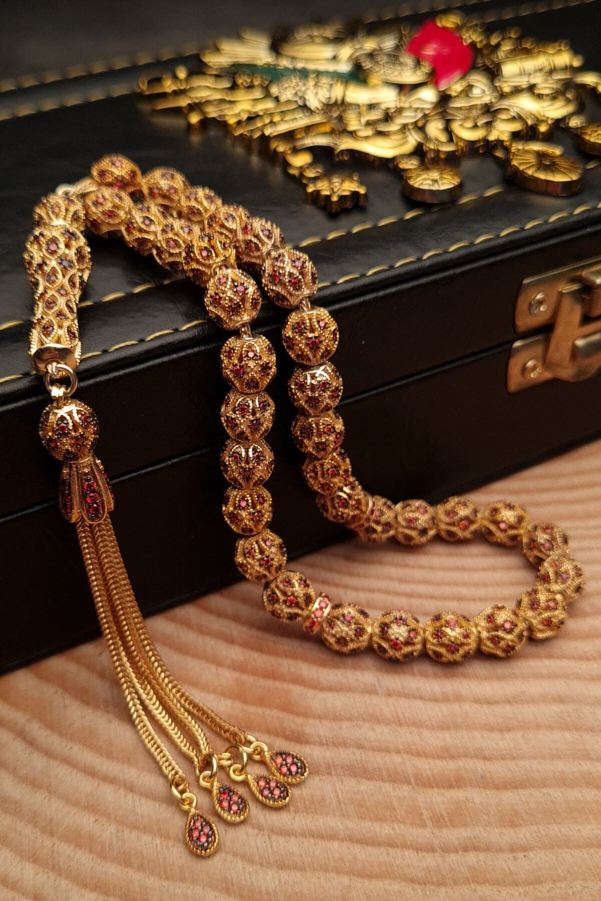 – Özel günlerinizde sevdiklerinize hediye edebileceğiniz, altın kaplama gümüş tespih ile şıklığınızı tamamlayın.; – Doğal taş kullanımı sayesinde her bir tane benzersizdir ve koleksiyonunuza değer katar.; – 45 Gr ağırlığı ve taş işlemeleri ile estetik bir görünüm sunar.; – Altın rengi materyali ile göz alıcı bir parlaklık sağlar ve dikkat çekici bir aksesuar olur.; – Altın sarısı renk tonuyla zarifliği ön plana çıkarır ve her türlü kombininize uyum sağlar.