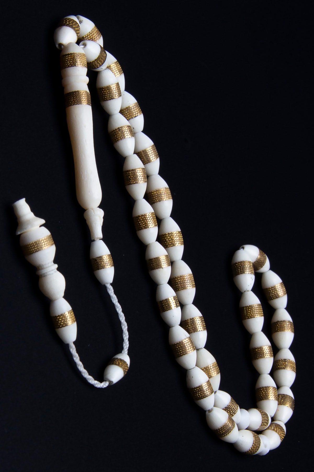 Altın kaplama malzemesiyle üretilmiş, uzun ömürlü ve şık bir görünüm sunar; Pirinç sarmal deve kemiği tasarımı, geleneksel ve zarif bir estetik anlayışını yansıtır; Püskül detayları ile zenginleştirilmiş, göz alıcı bir tasarıma sahiptir; Tesbihin her bir bileşeni özenle işlenmiş olup, kalite ve dayanıklılık ön planda tutulmuştur;