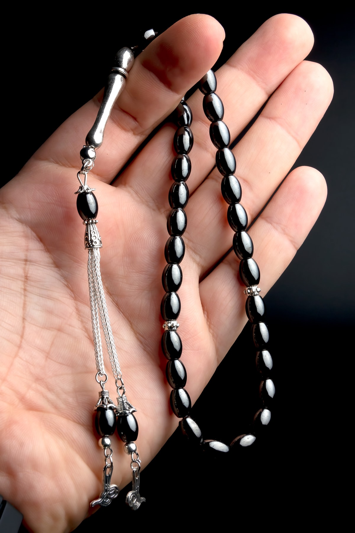 Gümüş kaplama detaylarıyla zenginleştirilmiş, şık ve zarif bir tasarıma sahip; Doğal hematit taşı kullanılarak üretilmiş, her bir tesbih tanesi benzersiz ve özgün bir görünüm sunar; Hematit taşı, dayanıklılığı ve estetik çekiciliği ile bilinir; uzun süreli kullanım için idealdir; Özel günlerde veya anlamlı anları simgelemek için mükemmel bir hediye seçeneği;