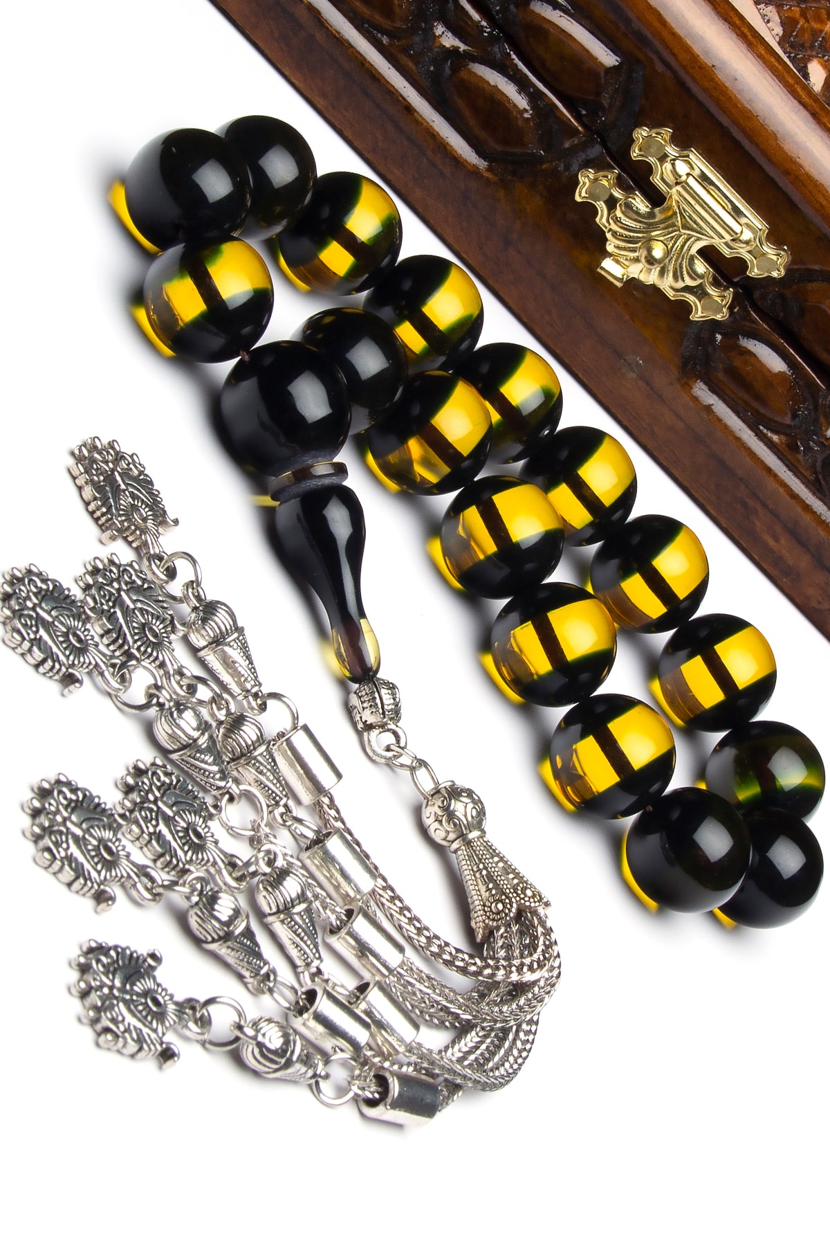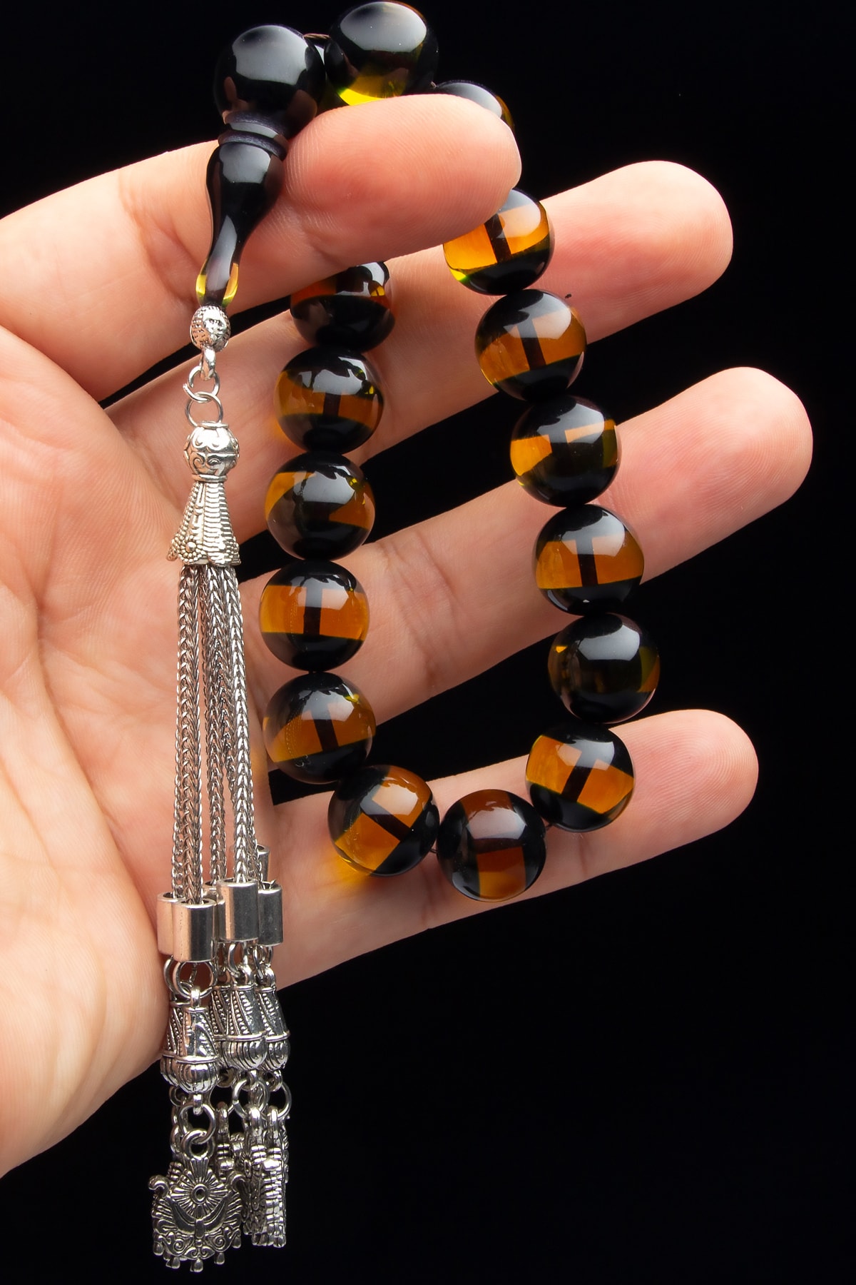 Gümüş kaplama detaylarıyla zenginleştirilmiş, şık ve modern bir tasarıma sahip; Doğal kehribar taşı kullanılarak üretilmiş, her bir tesbih tanesi el işçiliğiyle süslenmiştir; 13; 5mm boyutlarındaki bu tesbih, rahat kullanım için idealdir ve kolay taşınabilir; Kokulu yapısı sayesinde her kullanımda hoş bir koku deneyimi sunar;
