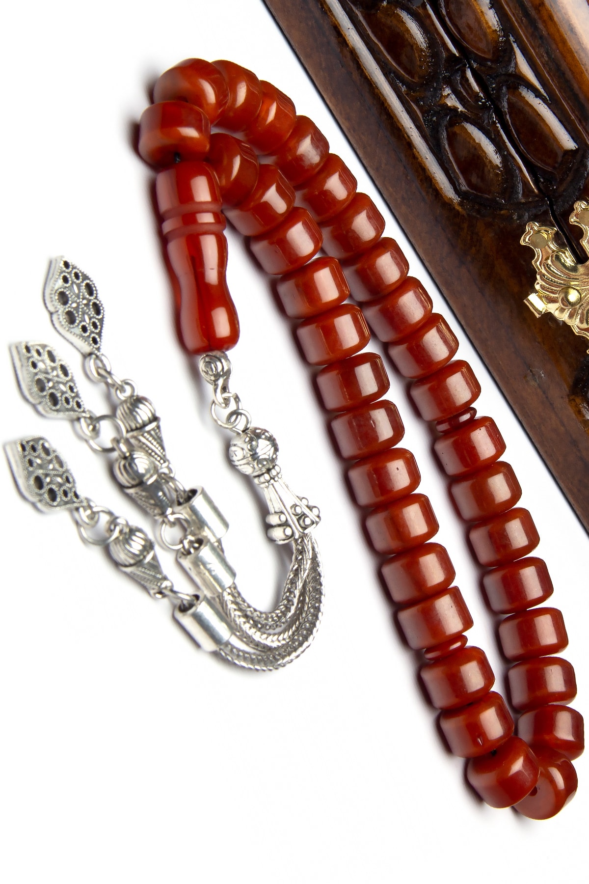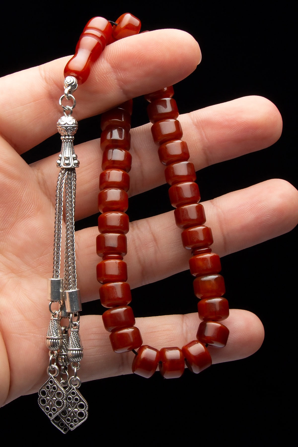Osmanlı tonlarında tasarlanmış, zarif ve şık bir görünüm sunan kehribar tesbih; 7×10 mm boyutlarındaki bilek boyu, rahat kullanım ve konforlu bir deneyim sağlar; Gümüş kaplama detayları ile zenginleştirilmiş, uzun ömürlü ve dayanıklı bir yapıya sahiptir; Kehribarın doğal dokusu ve sıcak tonları, her kullanımda benzersiz bir hissiyat yaratır;