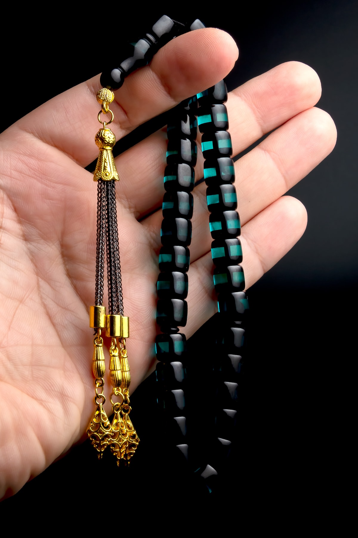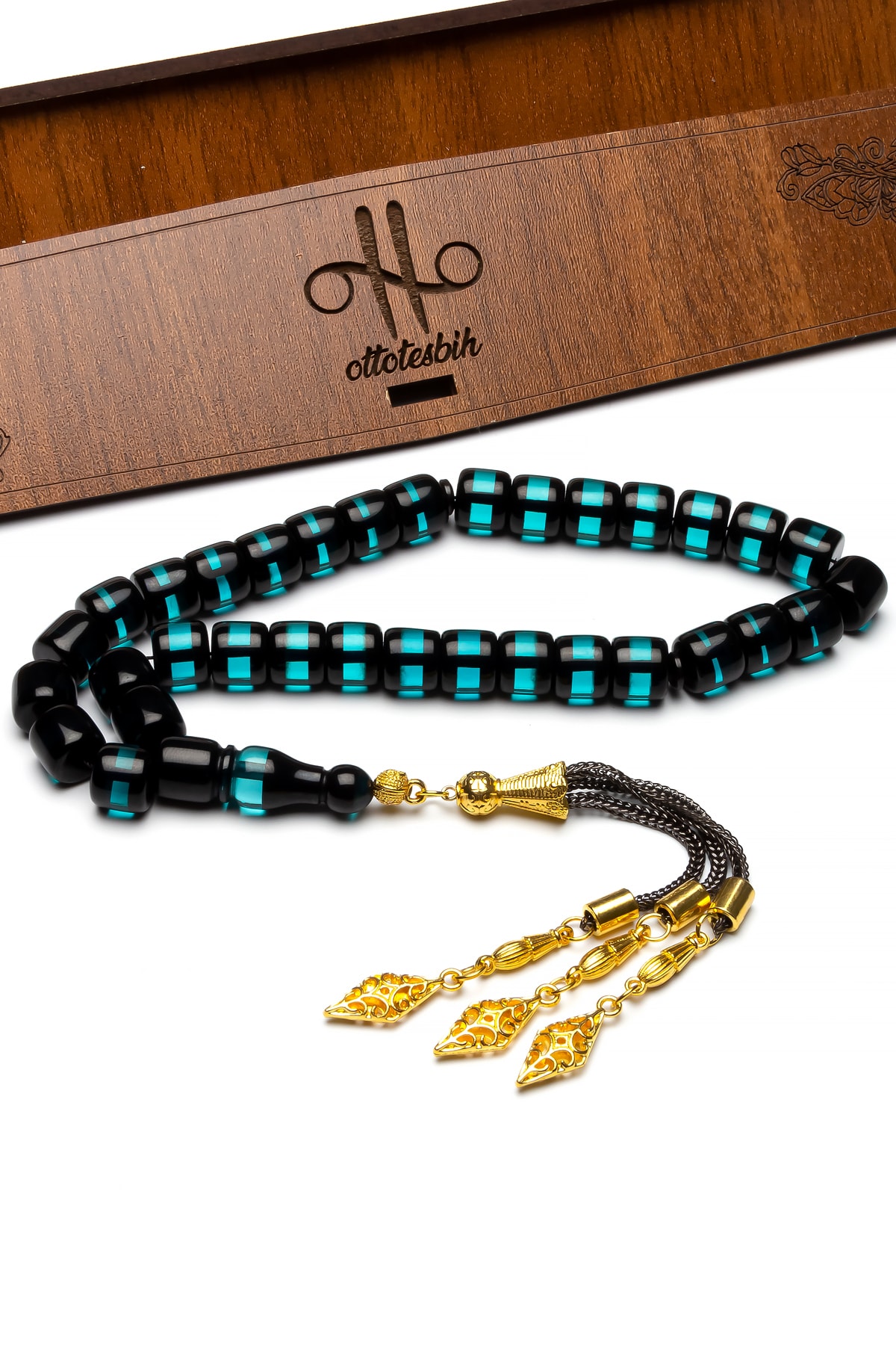 Kehribar taşı, doğal güzelliği ve benzersiz dokusuyla dikkat çeken bir materyaldir; Tesbih yapımında kullanılan kehribar, her bir tanesi özenle seçilmiş ve işlenmiş olup, uzun ömürlü kullanım sunar; Altın kaplama detayları ile zenginleştirilmiş bu tesbih, hem şıklığı hem de dayanıklılığı bir arada sunar; Altın kaplama, tesbihin estetik görünümünü artırırken aynı zamanda parlaklığını korumasına yardımcı olur; 9x10mm boyutlarındaki tekerlek kesim tasarım, klasik ve zamansız bir görünüm sağlar; Bu boyut, hem rahat bir kullanım sunar hem de her tür elbiseyle uyum sağlayarak stilinizi tamamlar; Su yeşili rengi, kehribarın doğal tonlarını ön plana çıkaran zarif bir seçenektir; Bu renk, tesbihin hem göz alıcı hem de sofistike bir hava katmasına olanak tanır; Sürmeli işlemeli detaylar, her bir tanesi el emeğiyle işlenmiş olan bu tesbihin benzersizliğini artırır; Bu detaylar,;