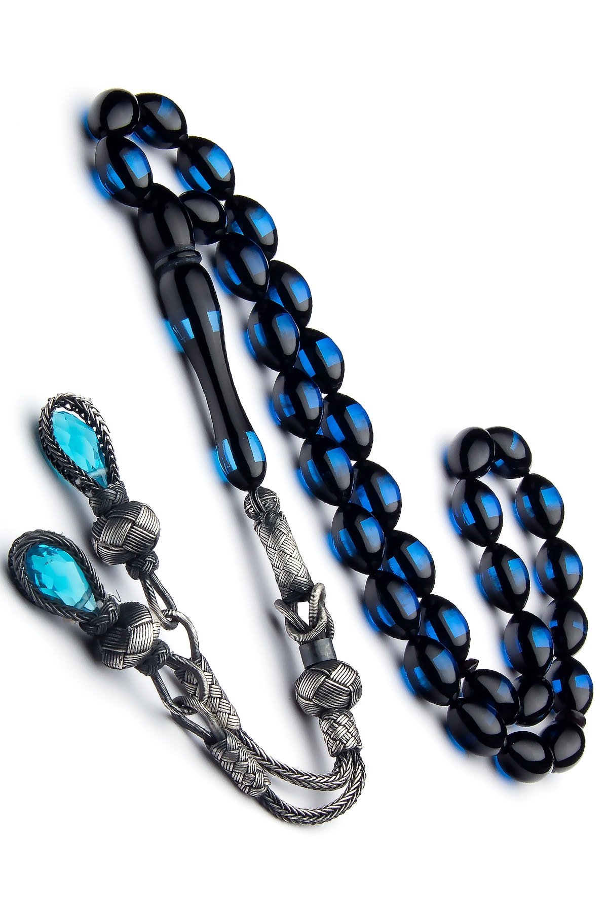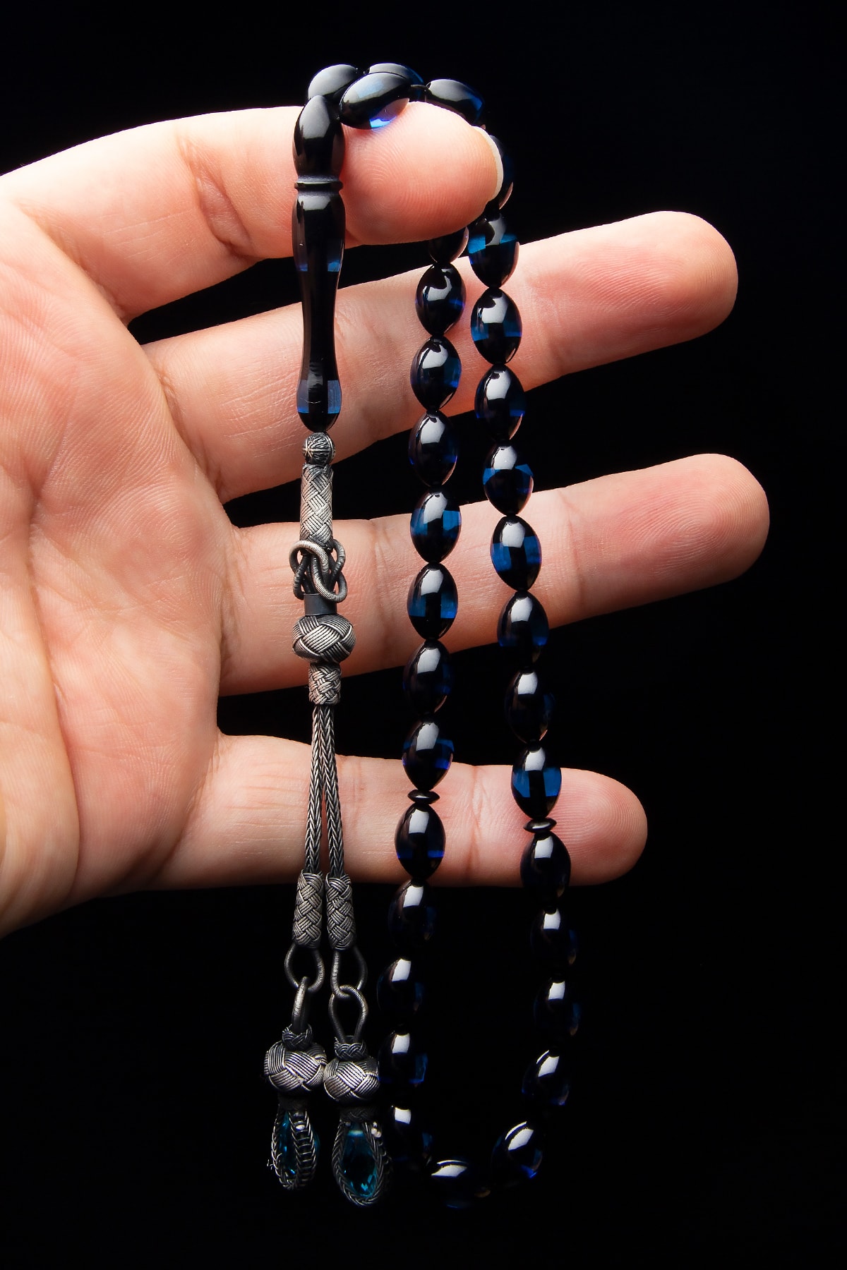 Gümüş Kazaz Püsküllü 7x11mm Arpa Kesim Sürmeli Kehribar Tesbih