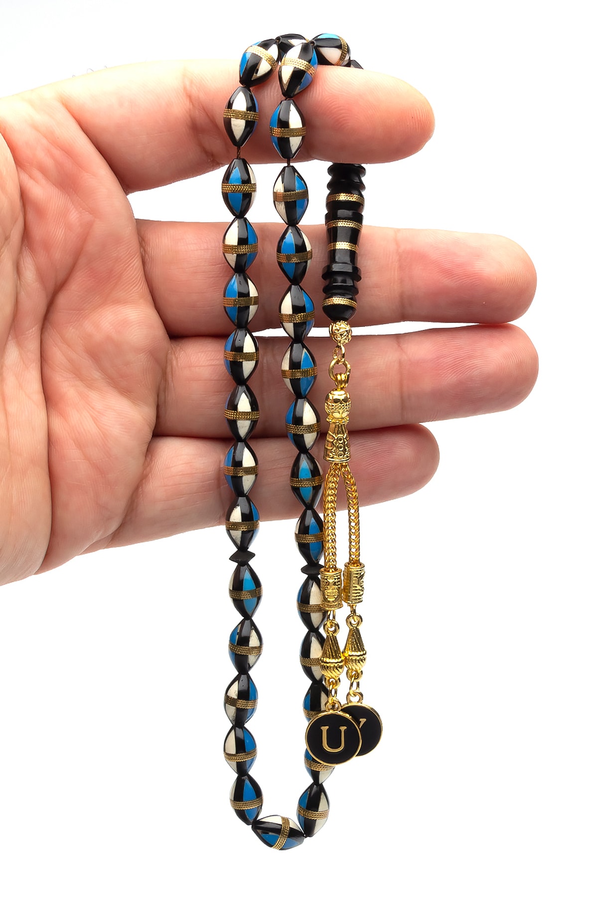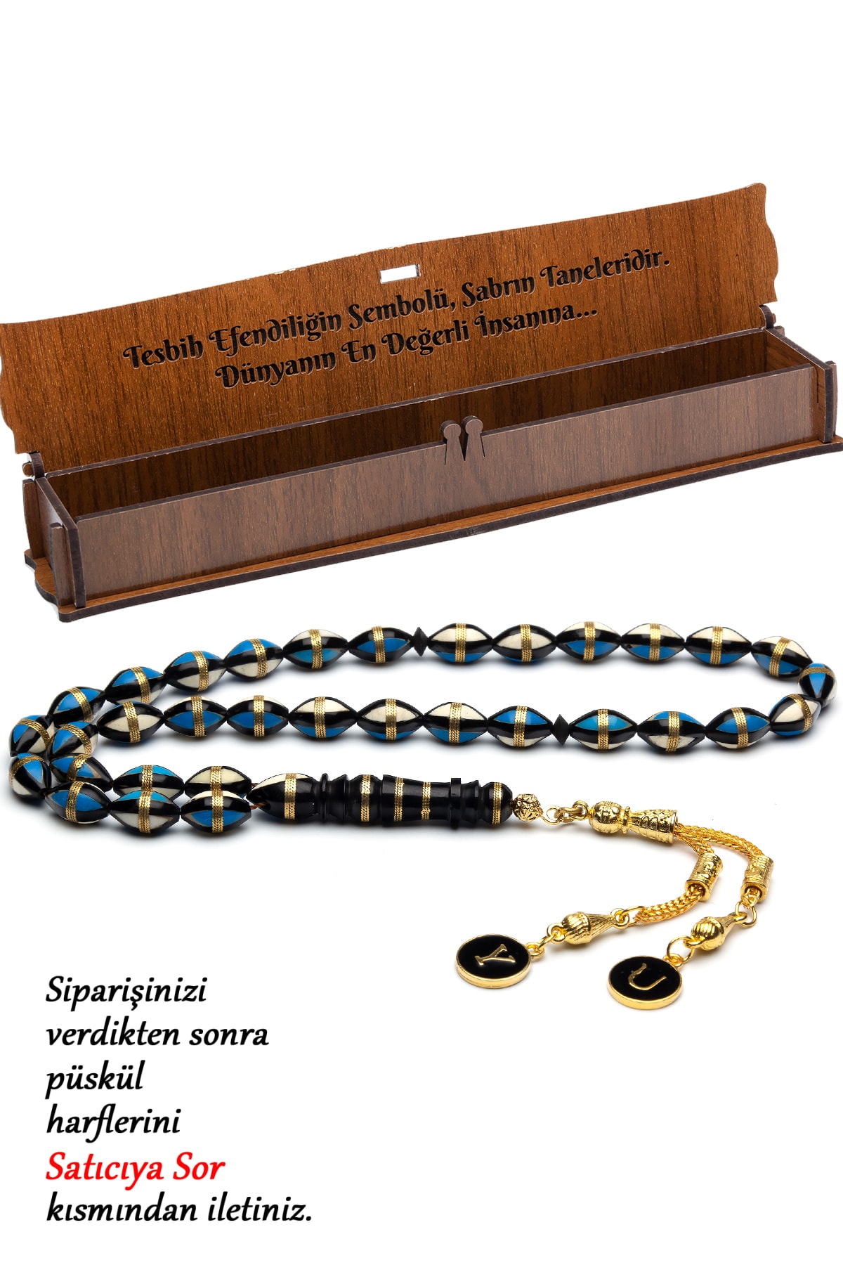 Ağaç malzemesi kullanılarak üretilmiş, dayanıklı ve uzun ömürlü bir kullanım sunar; Altın kaplama detayları ile zenginleştirilmiş, şık ve göz alıcı bir görünüm kazandırır; 7x11mm boyutlarındaki püskül detayları, her bir tesbih tanesini zarif bir şekilde süsleyerek estetik bir dokunuş sağlar; Mavi mine işlemeli harflerle kişisel bir dokunuş eklenmiş, özel tasarımıyla dikkat çeker; Ahşap kutusu sayesinde tesbihleriniz için güvenli ve şık bir saklama çözümü sunar;