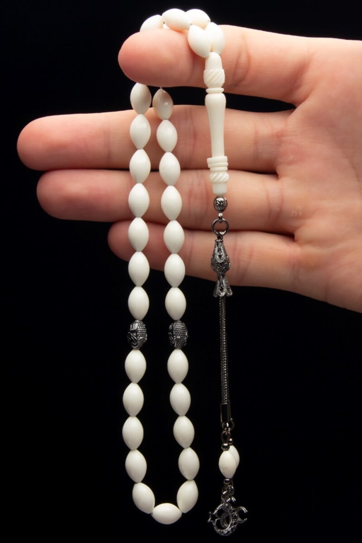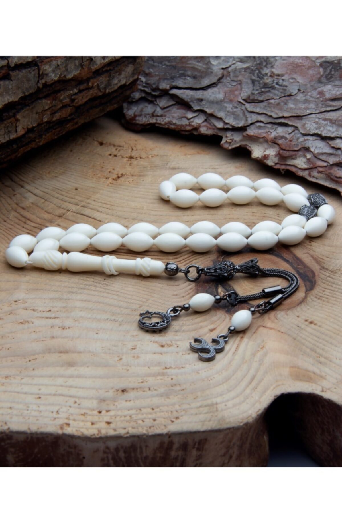 Hediyelik, Oksit Kaplama 925 Ayar Gümüş Aksesuarlı 3 Hilal ve Ayyıldızlı Deve Kemiği Tesbih