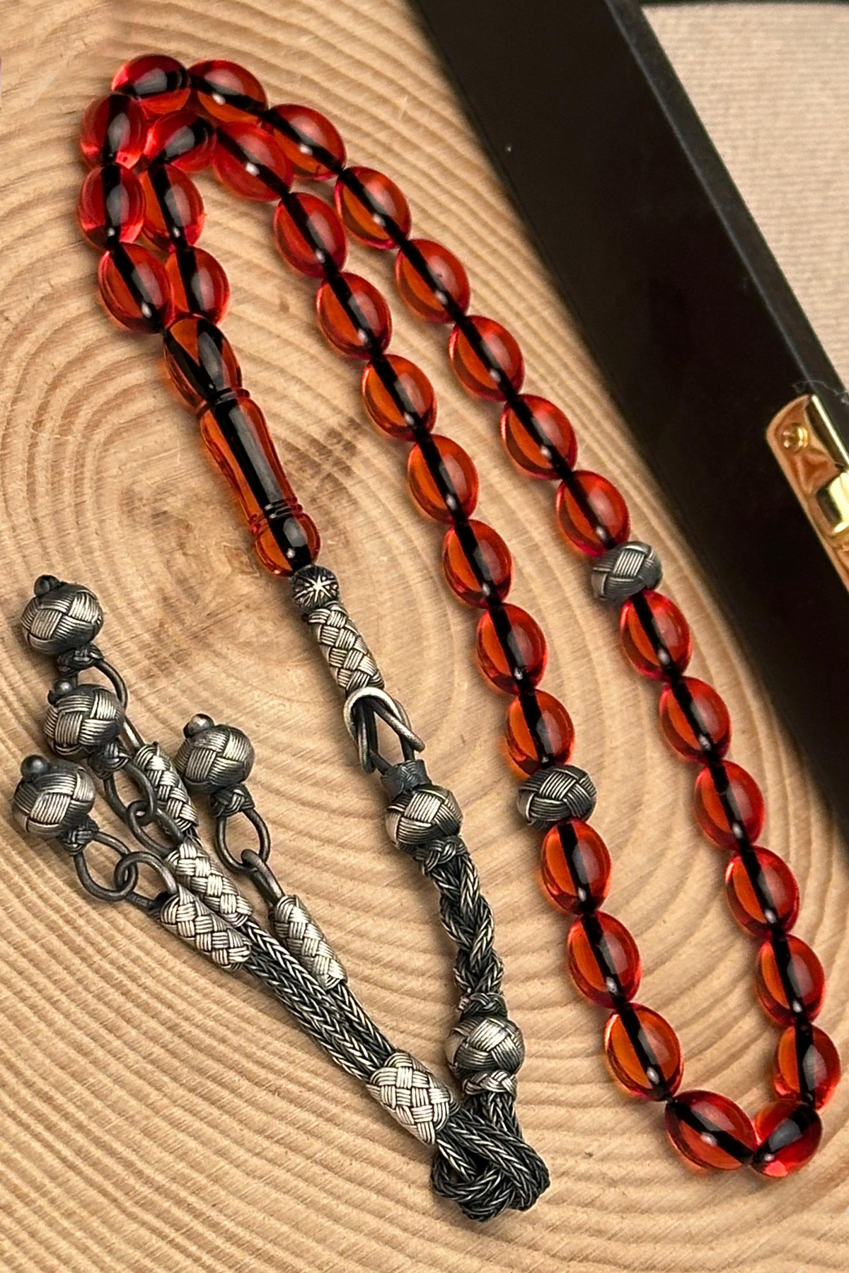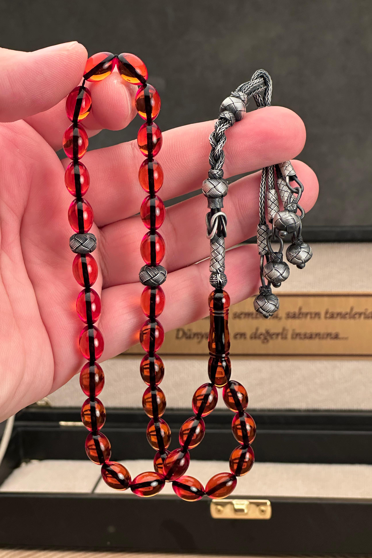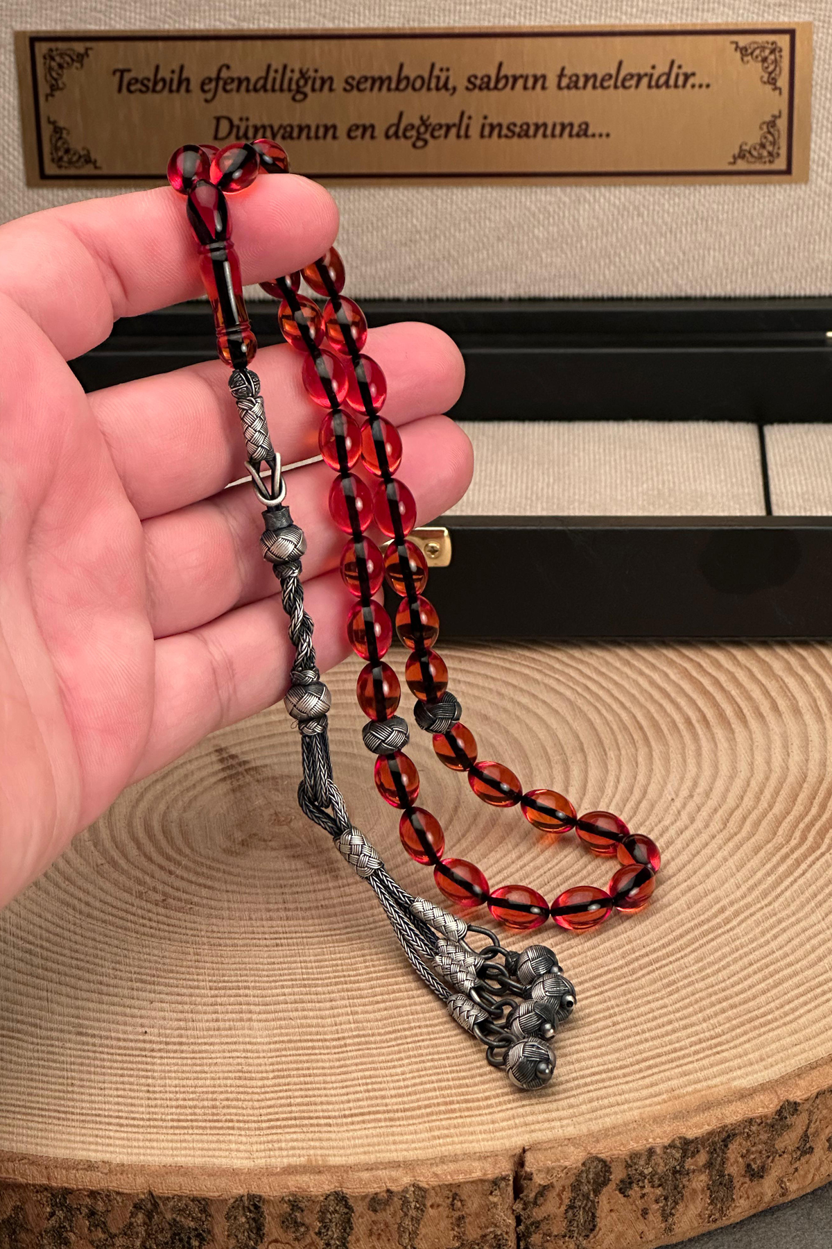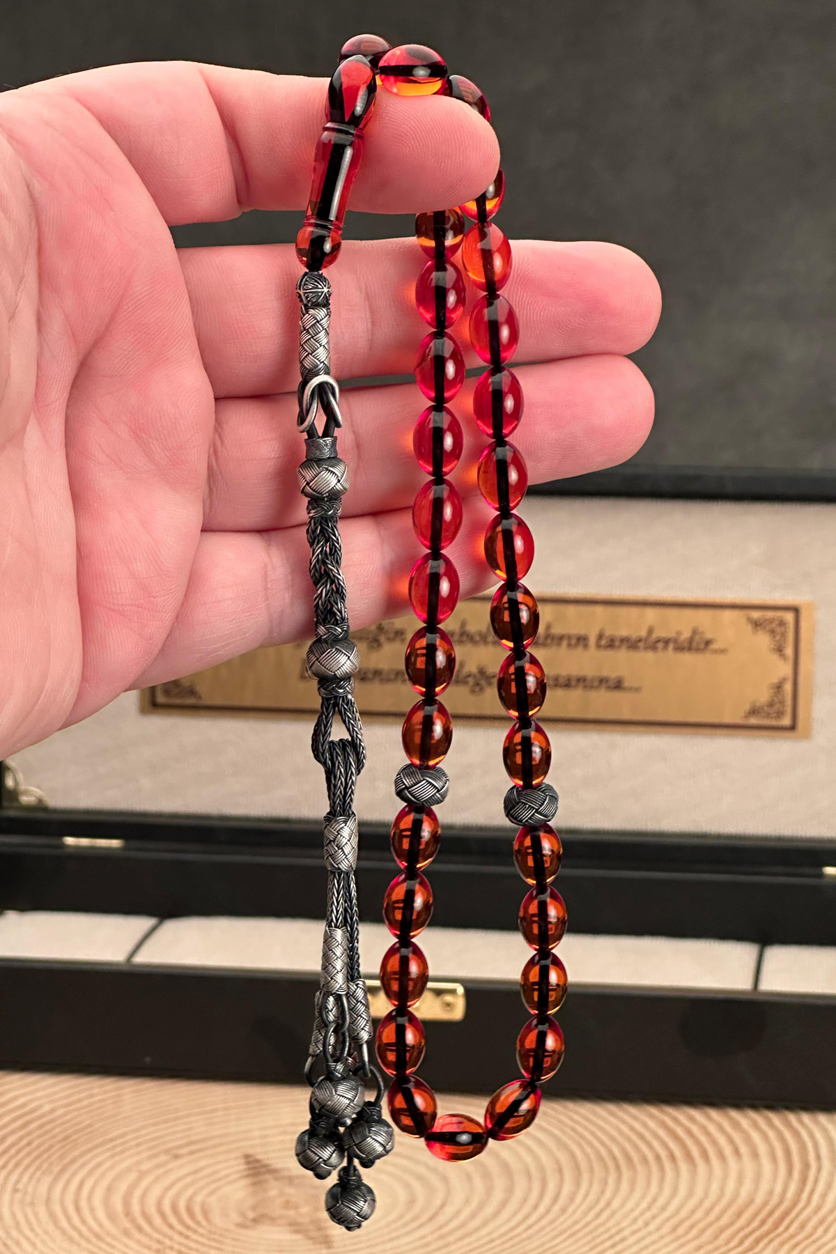 – 1000 ayar gümüş kazaziye ile süslenmiş, şıklığı ve zarafeti bir arada sunan Hızır Çakırbeyli Tesbih.; – 8x12mm boyutlarındaki bal rengi ateş kehribar taşı, her kullanımda göz alıcı bir parlaklık sağlar.; – Türkiye’de üretilmiş olup yerel malzemelerle el işçiliğinin özgün dokunuşunu yansıtır.; – Gümüş materyali sayesinde hem dayanıklı hem de uzun ömürlü kullanım vaat eder.; – Düz deseniyle sade ve modern tasarımıyla her tür kıyafetle uyum sağlar.