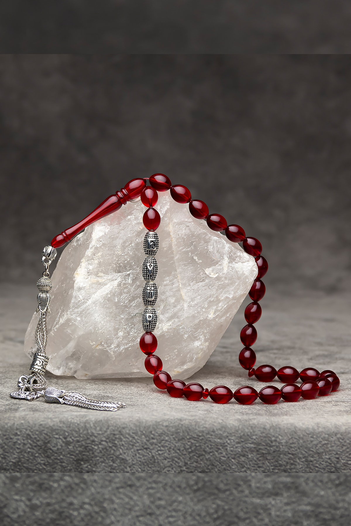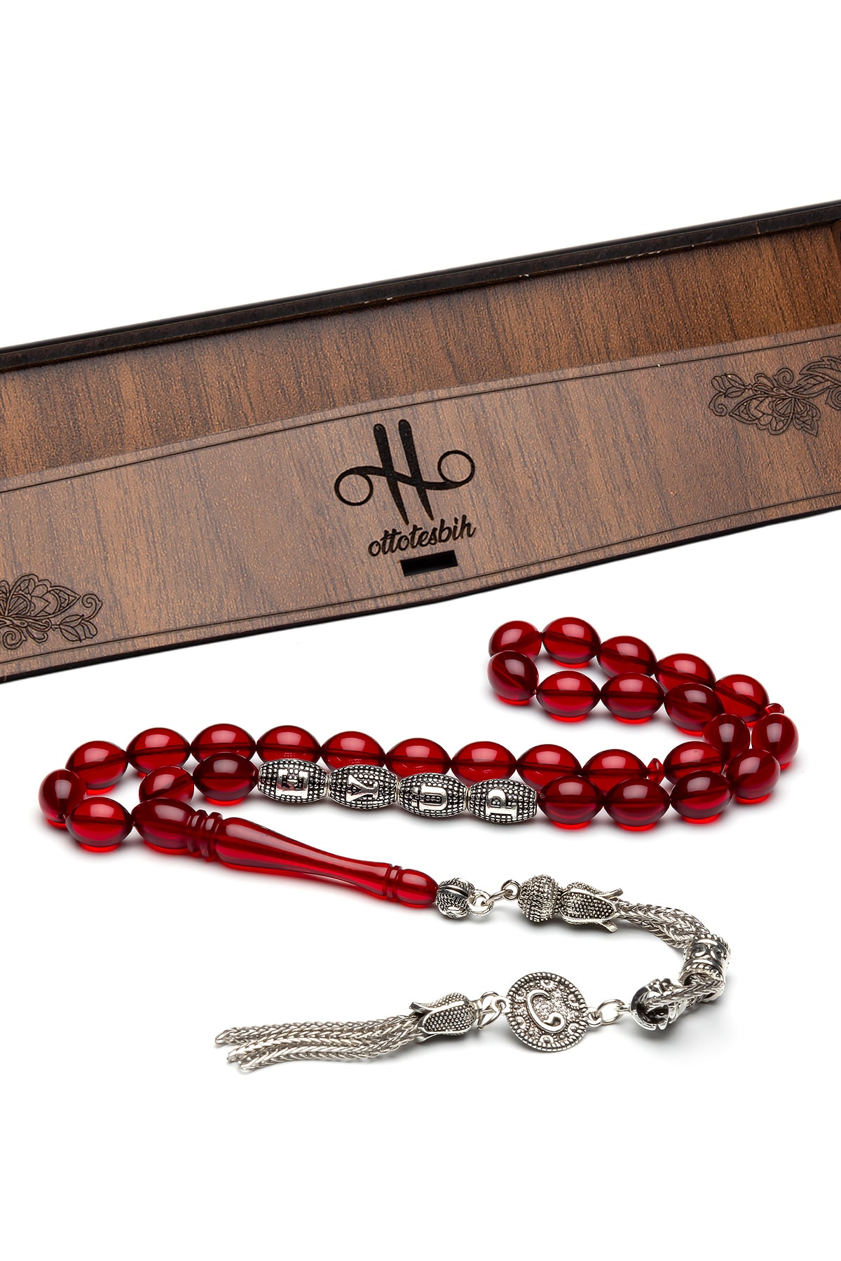 Tesbih Malzemesi: Akrilik Toz Kehribar Tane Ebatı: 7x11mm Kullanılan Harfler: Alpaka Metal Kamçı (Püskül) Tipi: Alpaka Metal Paket Içeriği: 1 Adet Tesbih 1 Adet Ahşap Tesbih Saklama Kutusu