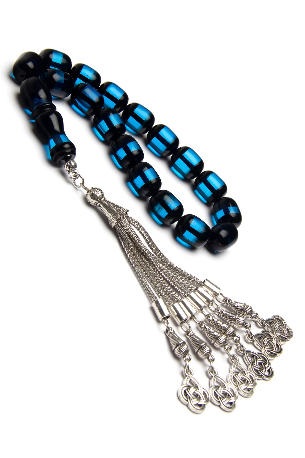 Gümüş kaplama detaylarıyla zenginleştirilmiş, şık ve modern bir tasarıma sahip; Doğal kehribar taşı kullanılarak üretilmiş, her bir tesbih tanesi benzersiz bir dokunuş sunar; Mavi ve siyah renk kombinasyonu ile göz alıcı bir görünüm kazandırır; Kokulu yapısı sayesinde her kullanımda hoş bir koku deneyimi yaşatır;