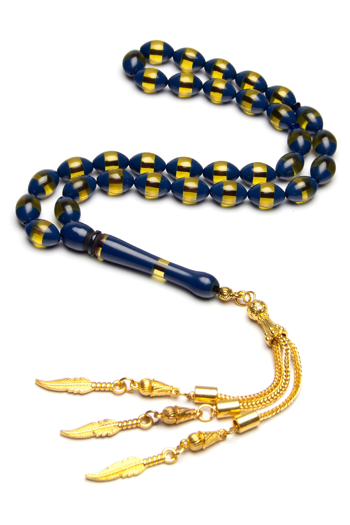 Altın kaplama detaylarıyla zenginleştirilmiş, şık ve zarif bir tasarıma sahip; Doğal kehribar taşı kullanılarak üretilmiş, her bir tesbih tanesi benzersiz bir dokunuş sunar; Sarı ve mavi renk kombinasyonu ile göz alıcı bir görünüm kazandırır; Kokulu yapısı sayesinde her kullanımda hoş bir koku deneyimi yaşatır;