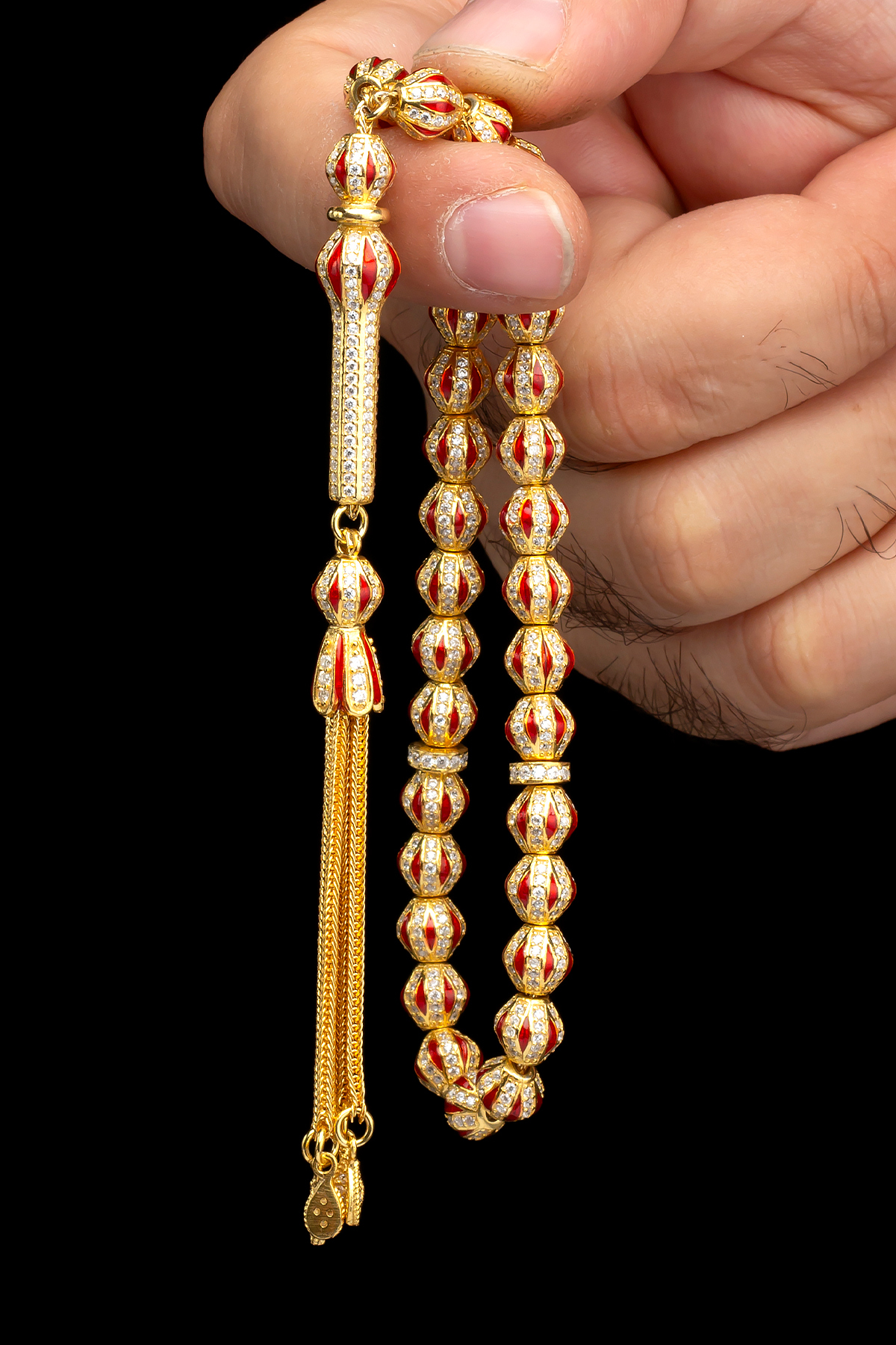 – Altın kaplama ile zenginleştirilmiş, 925 ayar gümüşten üretilmiş bu tespih, şıklığı ve dayanıklılığı bir arada sunar.; – Materyal bileşeni olarak tamamen altın kaplama ve doğal taş kullanarak hem estetik hem de kaliteyi ön planda tutar.; – Doğal taş kullanımı sayesinde her bir tesbih tanesi benzersiz ve otantik bir görünüm kazanır.; – Nakışlı ve işlemeli deseniyle göz alıcı detaylara sahip olup, her türlü özel gün veya günlük kullanım için idealdir.; – Türkiye’de üretilmiş olmasıyla yerel el işçiliğini desteklerken aynı zamanda uluslararası standartlarda kaliteye sahiptir.