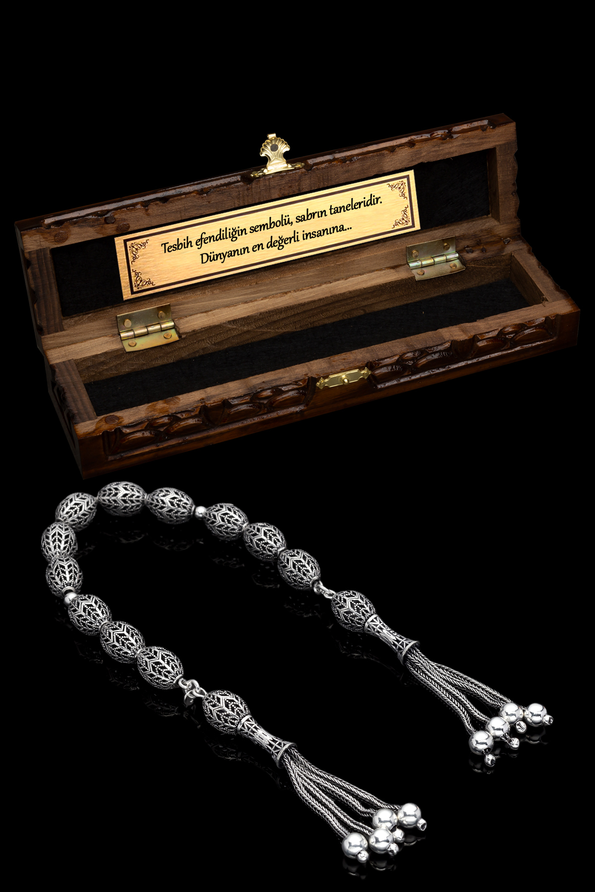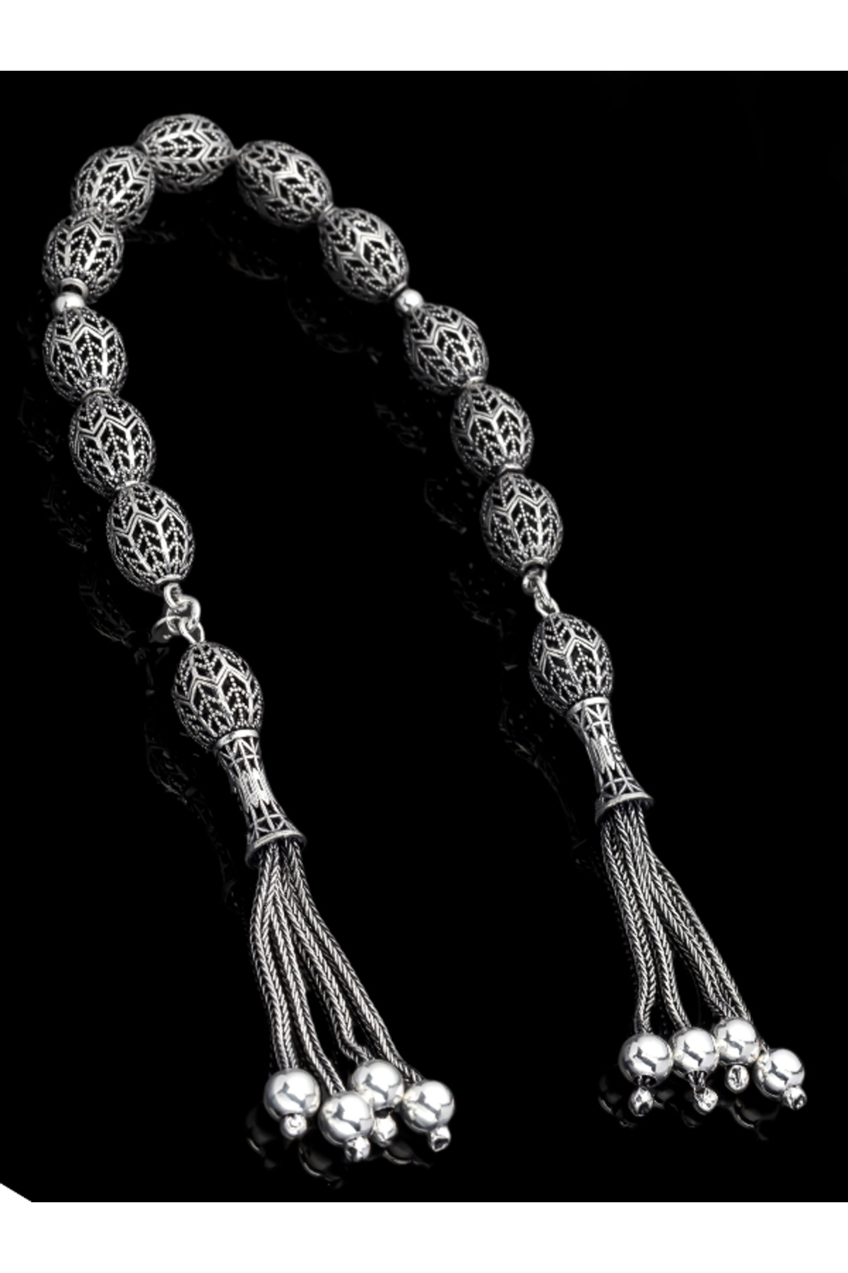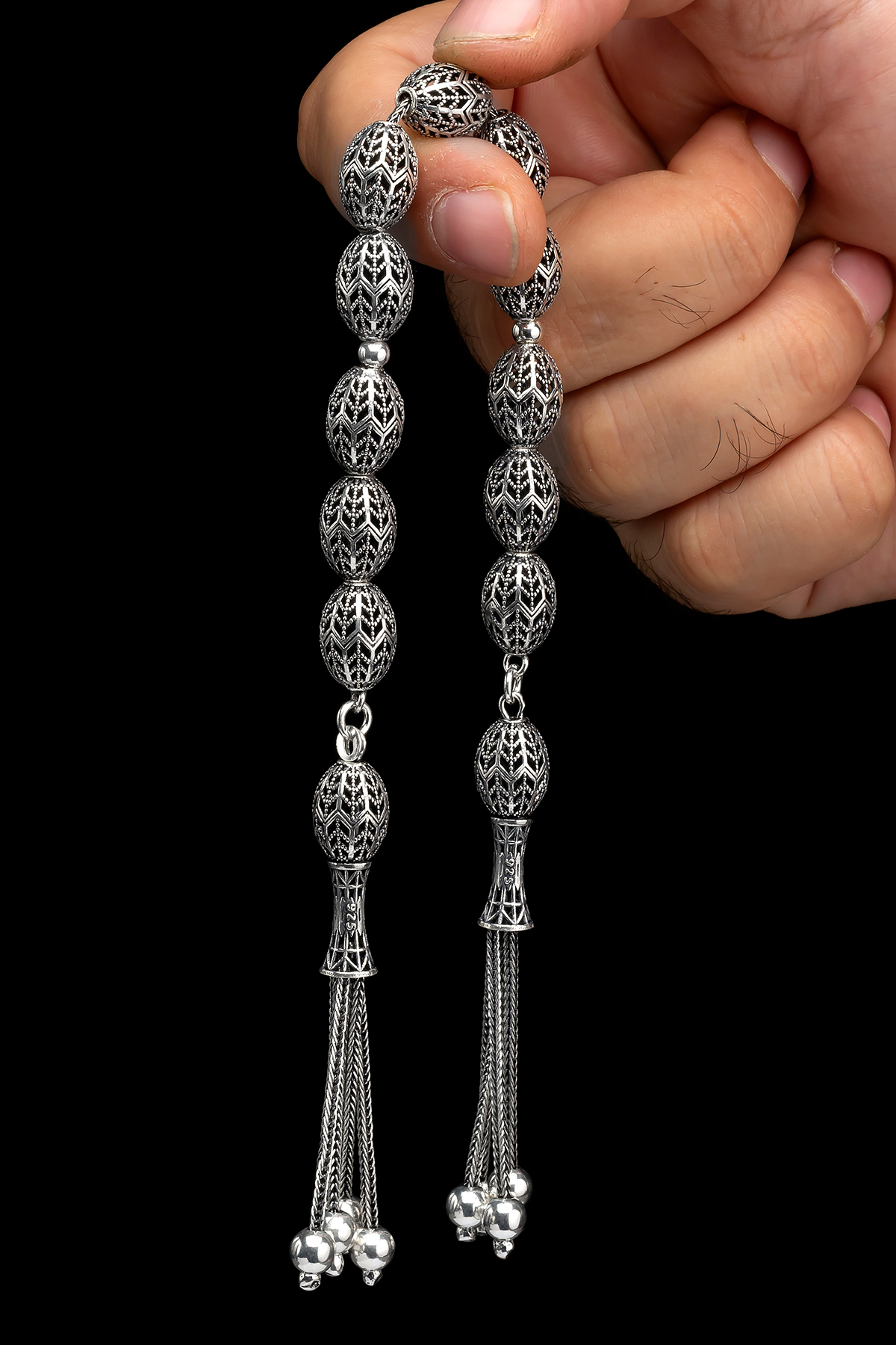 – 925 ayar gümüşten üretilmiş, uzun ömürlü ve kaliteli bir kullanım sunar.; – Arpa kesim tasarımı ile modern ve şık bir görünüm kazandırırken, geleneksel tesbih yapım tekniklerini yansıtır.; – Materyal bileşeni olarak saf gümüş kullanıldığından, alerji riski minimize edilir ve cilt dostu bir deneyim sağlar.; – Tesbihin her bir tanesi el işçiliğiyle hazırlanmış olup, detaylara verilen önem hissedilir.; – Nakışlı ve işlemeli deseniyle göz alıcı bir estetik sergileyerek kişisel zevkinizi yansıtmanızda yardımcı olur.