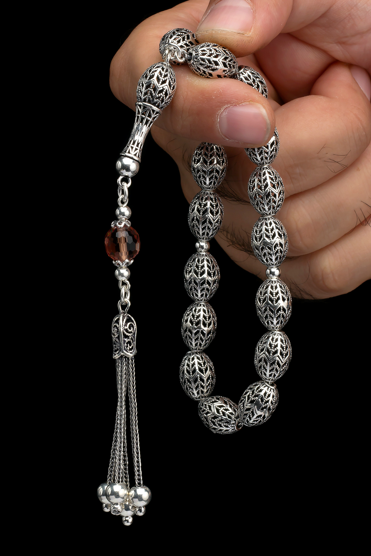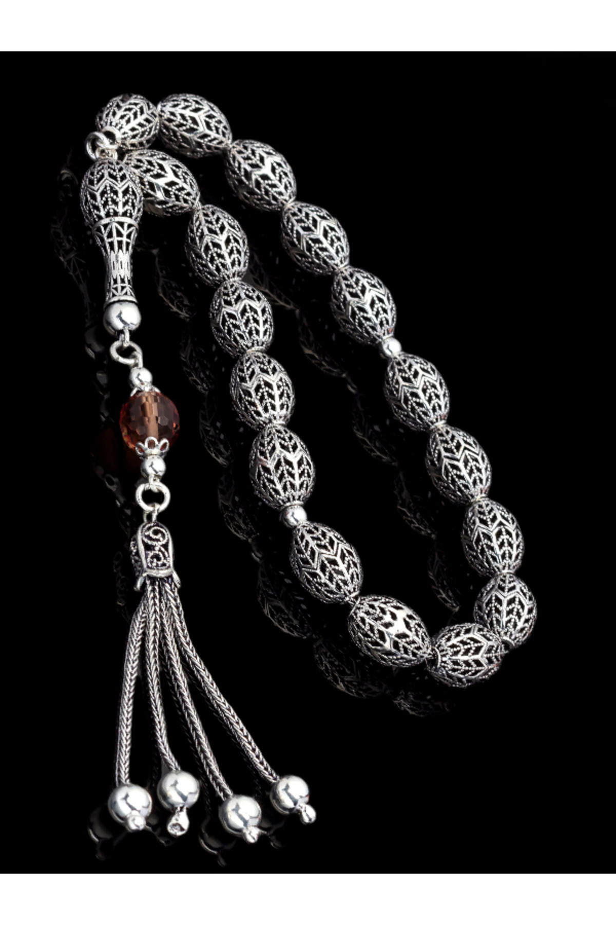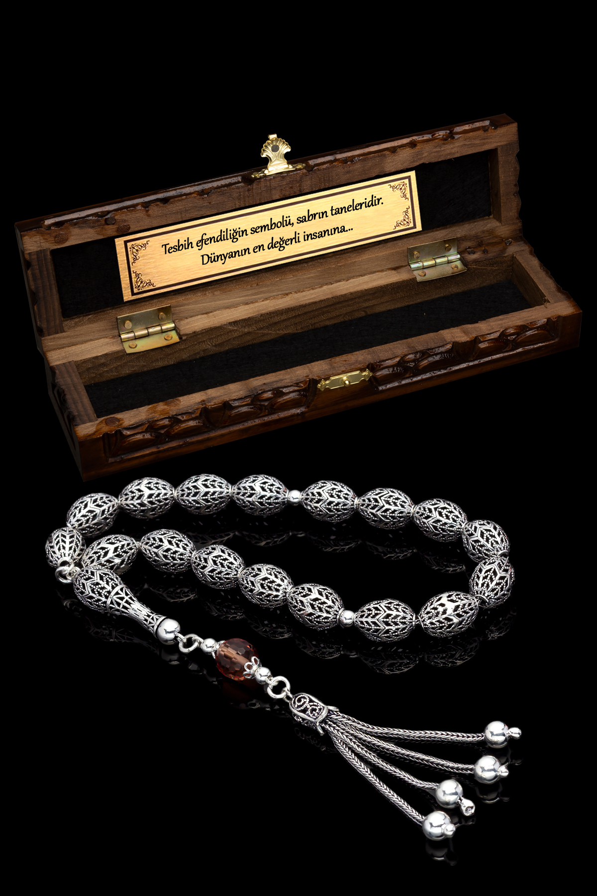 – 925 ayar gümüşten üretilmiş olup, kalite ve dayanıklılığı ile öne çıkar.; – Türkiye’de el işçiliğiyle tasarlanmış ve üretilmiştir; yerel zanaatkarların becerisini yansıtır.; – Doğal taş kullanımı sayesinde her tesbih benzersizdir ve kişisel bir dokunuş sunar.; – Materyal olarak saf gümüş tercih edilerek, uzun süreli kullanım için idealdir.; – Nakışlı ve işlemeli desenleriyle estetik bir görünüm kazandırırken, aynı zamanda manevi değeri arttırır.