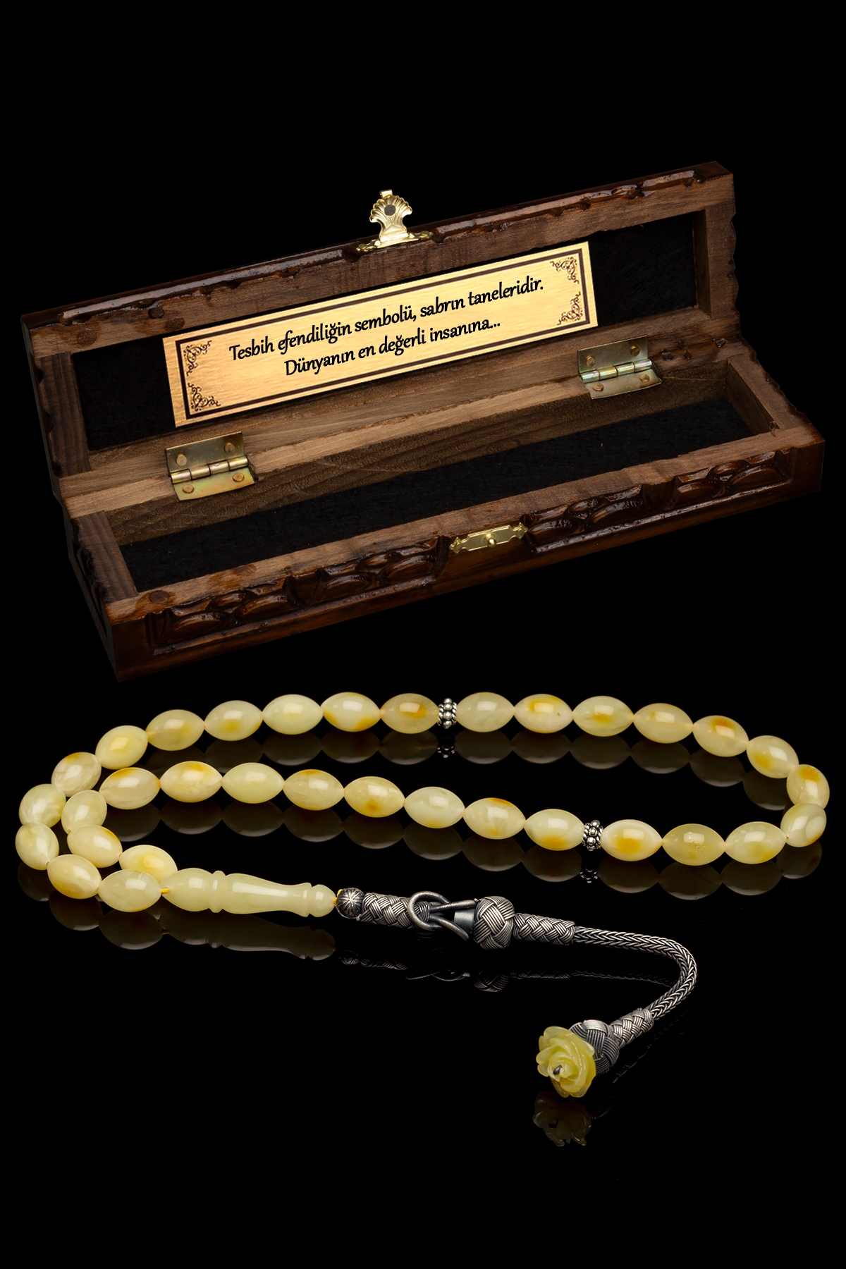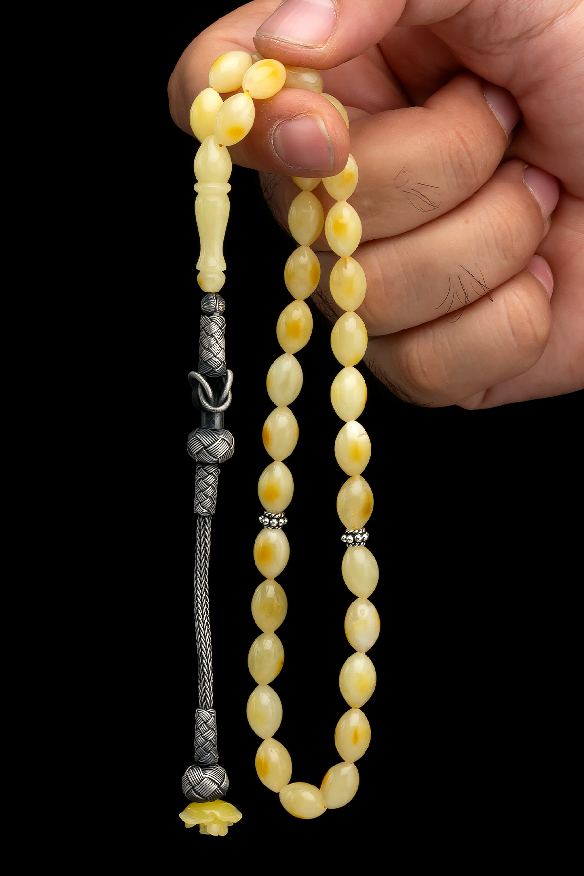 – Sertifikalı 1000 ayar gümüş kullanılarak üretilmiş, uzun ömürlü ve kaliteli bir aksesuar deneyimi sunar.; – Litvanya’da özel olarak seçilmiş damla kehribar taşları ile tasarlanmış, benzersiz ve doğal bir görünüm sağlar.; – Materyal bileşeni olarak tamamen saf gümüş kullanıldığından, alerji yapma riskini minimize ederken şıklığınızdan ödün vermezsiniz.; – Kehribarın sıcak tonları ve gümüşün parlaklığı bir araya gelerek göz alıcı bir kombinasyon oluşturur; her ortamda dikkat çekici bir stil vurgusu yapmanızı sağlar.; – Arpa kesim tekniğiyle işlenmiş bu tesbih, hem estetik hem de dayanıklılık açısından üstün kalite standartlarına sahiptir.; – Materyal bireysel farklılıklar nedeniyle küçük değişiklikler gösterebilir ancak genel tasarım ve işçilik yüksek standartlarda tutulmaktadır.