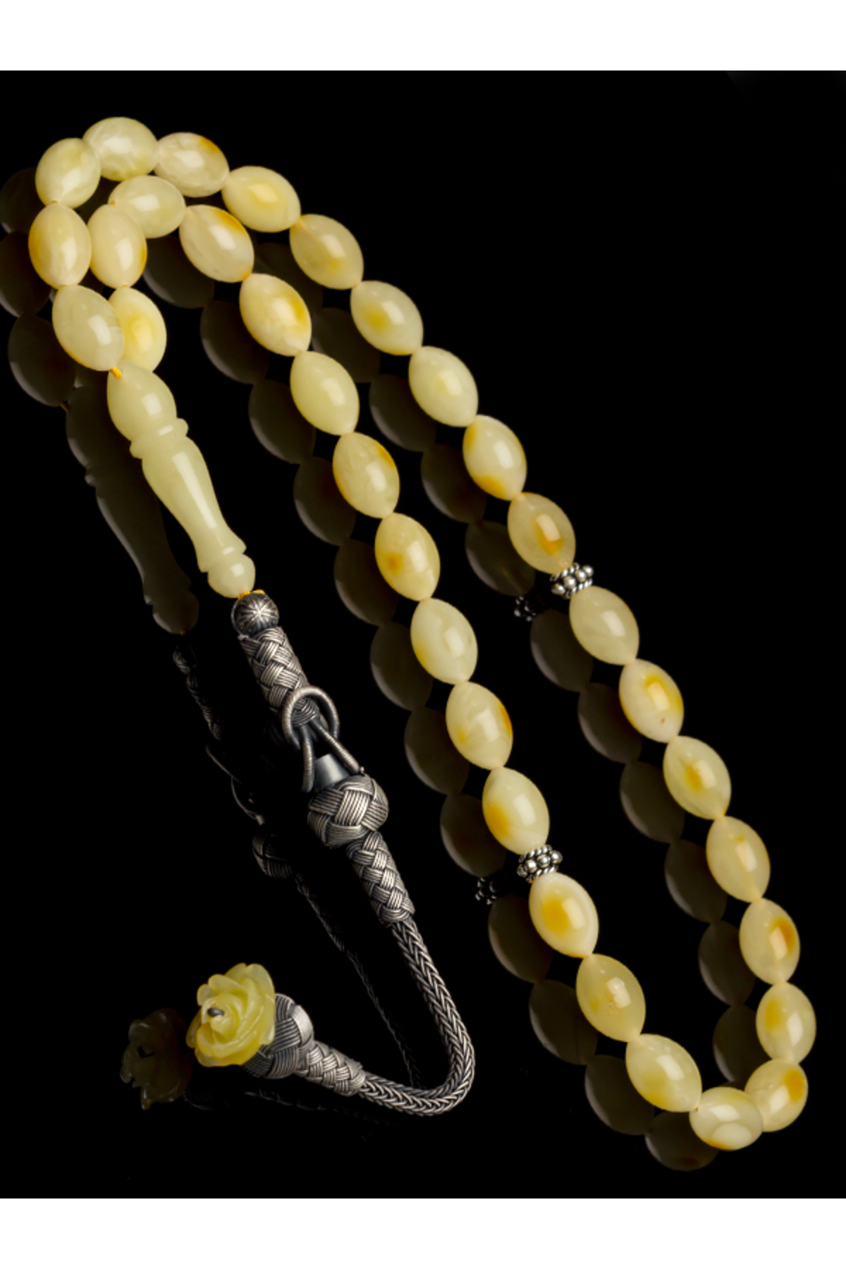 Sertifikalı Gümüş Püskül Gül Tasarım Damla Kehribar Tesbih 7x11mm 16Gr Arpa Kesim