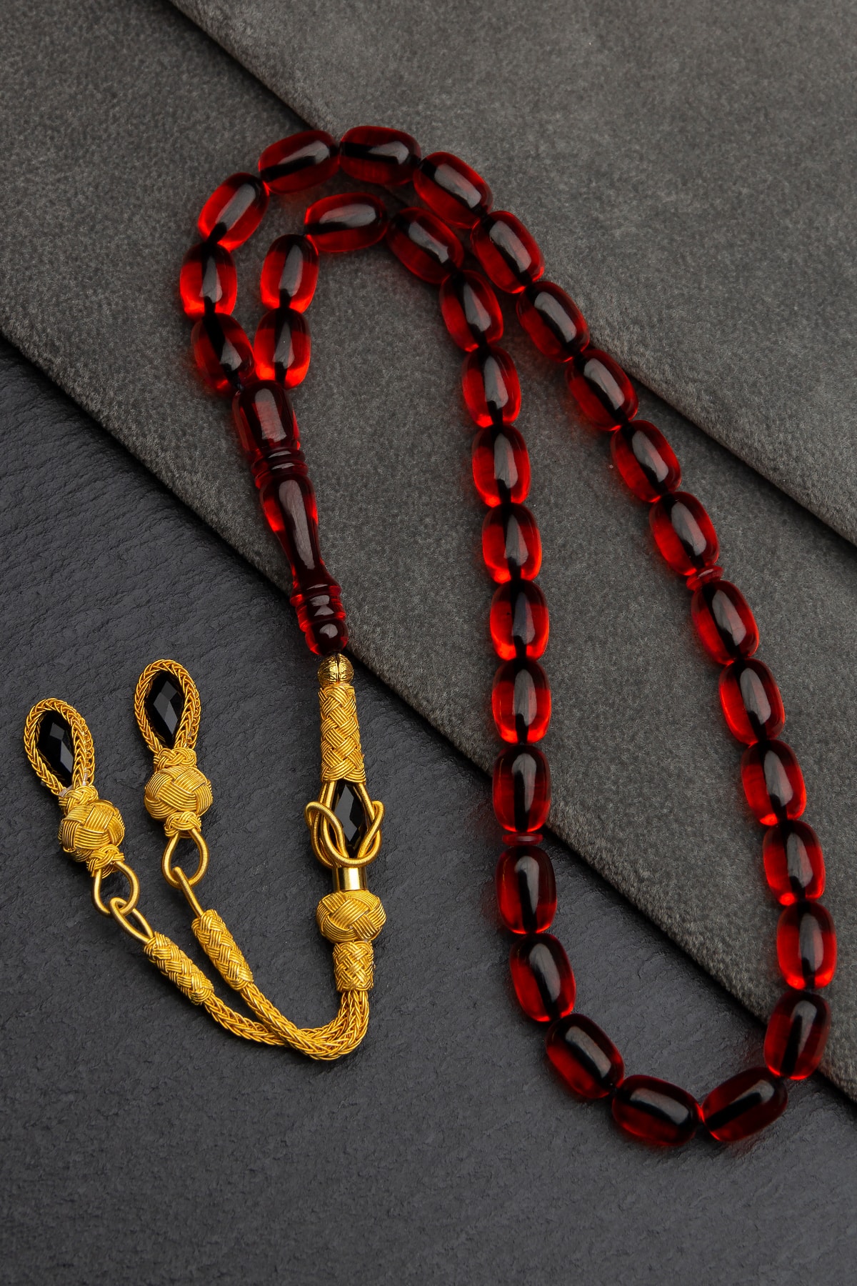 Altın kaplama detaylarıyla zenginleştirilmiş, şık ve zarif bir tasarıma sahip; Ateş kehribar taşı kullanılarak üretilmiş, doğal ve otantik bir görünüm sunar; Ahşap kutusuyla birlikte gelen bu tesbih, sevdiklerinize özel bir hediye olarak düşünceli bir dokunuş sağlar;